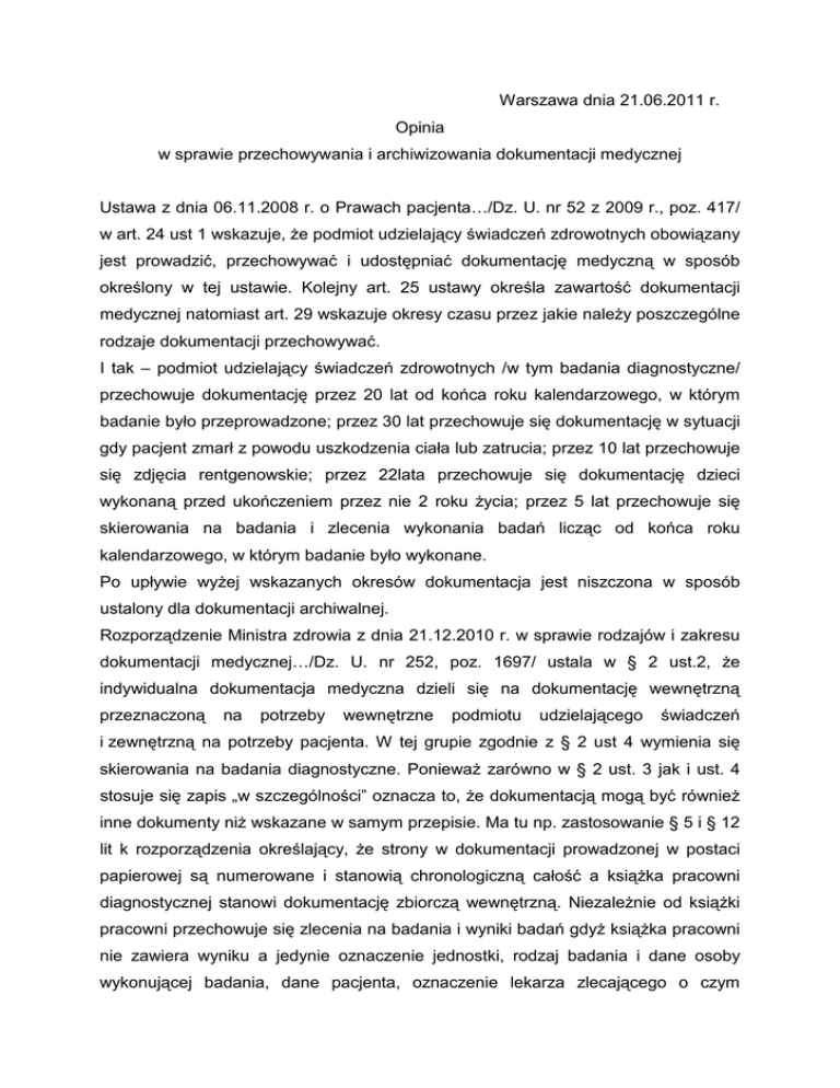 Warszawa dnia 21.06.2011 r. Opinia w sprawie przechowywania i archiwizowania dokumentacji medycznej Ustawa z dnia 06.11.2008 r. o Prawach pacjenta…/Dz. U. nr 52 z 2009 r., poz. 417/ w art. 24 ust 1 wskazuje, że podmiot udzielający świadczeń zdrowotnych obowiązany jest prowadzić, przechowywać i udostępniać dokumentację medyczną w sposób określony w tej ustawie. Kolejny art. 25 ustawy określa zawartość dokumentacji medycznej natomiast art. 29 wskazuje okresy czasu przez jakie należy poszczególne rodzaje dokumentacji przechowywać. I tak – podmiot udzielający świadczeń zdrowotnych /w tym badania diagnostyczne/ przechowuje dokumentację przez 20 lat od końca roku kalendarzowego, w którym badanie było przeprowadzone; przez 30 lat przechowuje się dokumentację w sytuacji gdy pacjent zmarł z powodu uszkodzenia ciała lub zatrucia; przez 10 lat przechowuje się zdjęcia rentgenowskie; przez 22lata przechowuje się dokumentację dzieci wykonaną przed ukończeniem przez nie 2 roku życia; przez 5 lat przechowuje się skierowania na badania i zlecenia wykonania badań licząc od końca roku kalendarzowego, w którym badanie było wykonane. Po upływie wyżej wskazanych okresów dokumentacja jest niszczona w sposób ustalony dla dokumentacji archiwalnej. Rozporządzenie Ministra zdrowia z dnia 21.12.2010 r. w sprawie rodzajów i zakresu dokumentacji medycznej…/Dz. U. nr 252, poz. 1697/ ustala w § 2 ust.2, że indywidualna dokumentacja medyczna dzieli się na dokumentację wewnętrzną przeznaczoną na potrzeby wewnętrzne podmiotu udzielającego świadczeń i zewnętrzną na potrzeby pacjenta. W tej grupie zgodnie z § 2 ust 4 wymienia się skierowania na badania diagnostyczne. Ponieważ zarówno w § 2 ust. 3 jak i ust. 4 stosuje się zapis „w szczególności” oznacza to, że dokumentacją mogą być również inne dokumenty niż wskazane w samym przepisie. Ma tu np. zastosowanie § 5 i § 12 lit k rozporządzenia określający, że strony w dokumentacji prowadzonej w postaci papierowej są numerowane i stanowią chronologiczną całość a książka pracowni diagnostycznej stanowi dokumentację zbiorczą wewnętrzną. Niezależnie od książki pracowni przechowuje się zlecenia na badania i wyniki badań gdyż książka pracowni nie zawiera wyniku a jedynie oznaczenie jednostki, rodzaj badania i dane osoby wykonującej badania, dane pacjenta, oznaczenie lekarza zlecającego o czym stanowi § 36 rozporządzenia. Podmiot udzielający świadczeń lub jego jednostka organizacyjna prowadzą księgi pracowni według przepisów § 40-41 ust 2 rozporządzenia. Sprawy przechowywania i archiwizowania dokumentacji regulują przepisy rozporządzenia od § 72 do § 76. Każdy podmiot dokonujący świadczeń zdrowotnych przechowuje przypisaną mu wewnętrzną dokumentację bieżącą w miejscu ustalonym przez kierownika komórki organizacyjnej w porozumieniu z kierownikiem zakładu. Do postępowania z dokumentacją archiwizowaną mają zastosowanie przepisy ustawy z dnia 14.07.1983 r. o narodowym zasobie archiwalnym i archiwach /Dz. U. nr 97 z 2006 r. poz. 673 ze zm./. Wymagane jest zapewnienie odpowiednich warunków przechowywania, zabezpieczających przed zniszczeniem dokumentacji przed ustalonym czasem i umożliwienie wydania jej osobom lub instytucjom uprawnionym zgodnie z przepisami ustawy o prawach pacjenta. Kierownik zakładu wraz z kierownikiem laboratorium powinni ustalić zasady przechowywania i archiwizowania dokumentacji medycznej stosując wskazane przepisy a szczególnie przepisy o archiwach. Można skorzystać z pomocy oddziałów archiwów państwowych, które wskażą jak należy sporządzić protokoły przekazania dokumentacji do archiwum zakładowego i jak przygotować dokumentację do zniszczenia po upływie okresu jej przechowywania. Kierownik zakładu opieki zdrowotnej – obecnie podmiotu wykonującego świadczenia zdrowotne winien wyznaczyć osobę odpowiedzialną za prowadzenie archiwum zakładu w tym również archiwum dokumentacji medycznej mając świadomość, że ustawa o prawach pacjenta nakłada na jednostkę przechowującą dokumentację obowiązek jej udostępniania w okresie aż do jej prawnej likwidacji. Radca Prawny Grażyna Filipowska - Kejna Nr rej. WAR 1376