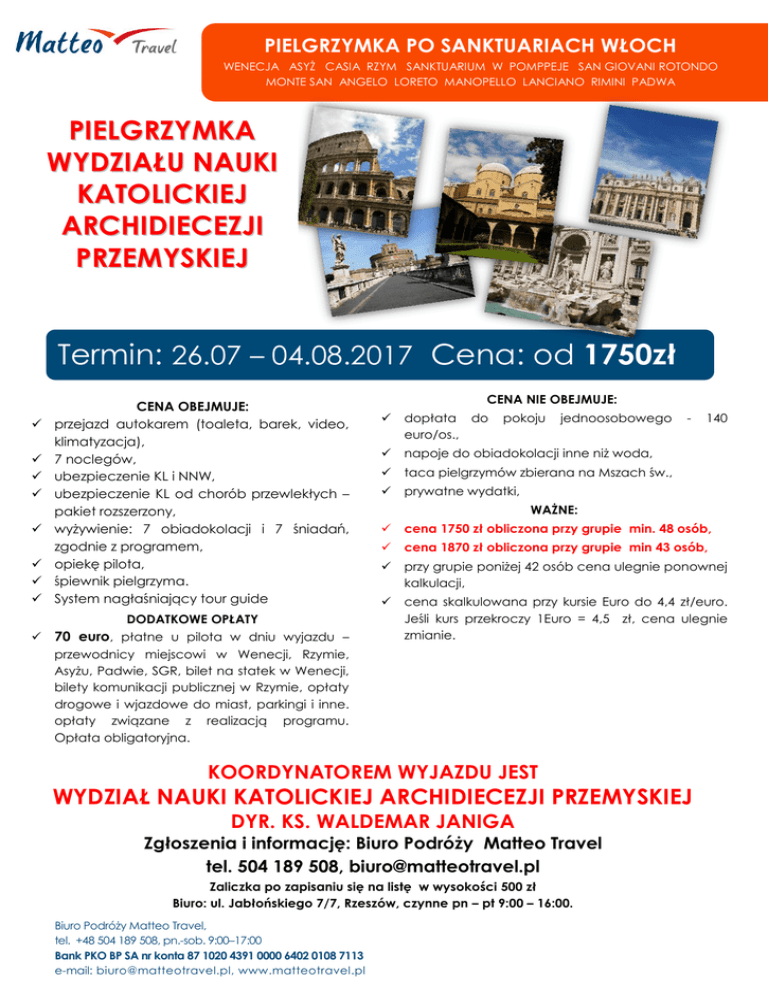 PIELGRZYMKA PO SANKTUARIACH WŁOCH WENECJA ASYŻ CASIA RZYM SANKTUARIUM W POMPPEJE SAN GIOVANI ROTONDO MONTE SAN ANGELO LORETO MANOPELLO LANCIANO RIMINI PADWA PIELGRZYMKA WYDZIAŁU NAUKI KATOLICKIEJ ARCHIDIECEZJI PRZEMYSKIEJ Termin: 26.07 – 04.08.2017 Cena: od 1750zł CENA OBEJMUJE: przejazd autokarem (toaleta, barek, video, klimatyzacja), 7 noclegów, ubezpieczenie KL i NNW, ubezpieczenie KL od chorób przewlekłych – pakiet rozszerzony, wyżywienie: 7 obiadokolacji i 7 śniadań, zgodnie z programem, opiekę pilota, śpiewnik pielgrzyma. System nagłaśniający tour guide 70 euro, płatne u pilota w dniu wyjazdu – DODATKOWE OPŁATY CENA NIE OBEJMUJE: dopłata do euro/os., pokoju jednoosobowego napoje do obiadokolacji inne niż woda, taca pielgrzymów zbierana na Mszach św., prywatne wydatki, - WAŻNE: cena 1750 zł obliczona przy grupie min. 48 osób, cena 1870 zł obliczona przy grupie min 43 osób, przy grupie poniżej 42 osób cena ulegnie ponownej kalkulacji, cena skalkulowana przy kursie Euro do 4,4 zł/euro. Jeśli kurs przekroczy 1Euro = 4,5 zł, cena ulegnie zmianie. przewodnicy miejscowi w Wenecji, Rzymie, Asyżu, Padwie, SGR, bilet na statek w Wenecji, bilety komunikacji publicznej w Rzymie, opłaty drogowe i wjazdowe do miast, parkingi i inne. opłaty związane z realizacją programu. Opłata obligatoryjna. KOORDYNATOREM WYJAZDU JEST WYDZIAŁ NAUKI KATOLICKIEJ ARCHIDIECEZJI PRZEMYSKIEJ DYR. KS. WALDEMAR JANIGA Zgłoszenia i informację: Biuro Podróży Matteo Travel tel. 504 189 508, [email protected] Zaliczka po zapisaniu się na listę w wysokości 500 zł Biuro: ul. Jabłońskiego 7/7, Rzeszów, czynne pn – pt 9:00 – 16:00. Biuro Podróży Matteo Travel, tel. +48 504 189 508, pn.-sob. 9:00–17:00 Bank PKO BP SA nr konta 87 1020 4391 0000 6402 0108 7113 e-mail: [email protected], www.matteotravel.pl 140 PIELGRZYMKA PO SANKTUARIACH WŁOCH 1 DZIEŃ (śr) 26.07.2017 PRZEJAZD Z POLSKI Zbiórka uczestników o godzinie 5:00 i wyjazd w kierunku Krakowa. Przejazd w kierunku przejęci granicznego z Czechami. Dalsza podróż przez Czechy i Austrię. Około 1,5 godziny postój na Kahlenbergu we Wiedniu, gdzie odbędzie się msza święta. Dalsza podróż przez Austrię i Włochy. 2 DZIEŃ (czw) 27.07.2017 WENECJA Przyjazd do Wenecji w godzinach wczesnoporonnych. Czas na śniadanie (we własnym zakresie) oraz poranną toaletę. Około godz. 8.00 przepłynięcie statkiem na plac św. Marka. Spacer po Wenecji - Most Westchnień, Plac św. Marka, Bazylika św. Marka, Plac Dożów. Msza Święta. Dalsza podróż w kierunku Asyżu. Przyjazd do hotelu w pobliżu Asyżu w godzinach wieczornych. Zakwaterowanie i obiadokolacja 3 DZIEŃ (pt) 28.07.2017 ASYŻ, CASCIA Śniadanie. Od godziny 9.00 zwiedzanie Asyżu, min. Bazylika Św. Franciszka, Kościół Św. Klary, Bazylia Matki Boskiej Anielskiej. Przejazd do Casci, miasta św. Rity. Przejazd na nocleg w okolice Rzymu do domu pielgrzyma w Castel San Elia. Obiadokolacja i nocleg. 4 DZIEŃ (sb) 29.07.2017 RZYM Wczesne śniadanie. Przejazd do Rzymu. Msza Święta przy Ołtarzu św. Jana Pawła II (jeśli będzie możliwość). Zwiedzanie miasta: Bazylika św. Pawła za Murami, Bazylika Św. Jana na Lateranie i Święte Schody – dawna rezydencja papieży. Przejazd drogą Via Appia – najstarszą drogą od czasów rzymskich, przy której znajduje się kościół Domine Quo Vadis. Przejście wzdłuż Forum Romanum i Koloseum (bez wchodzenia do środka). Powrót na nocleg. Obiadokolacja i nocleg . 5 DZIEŃ (ndz) 30.07.2017 WATYKAN Śniadanie. Wyjazd do Watykanu, zwiedzanie: Bazylika św. Piotra. Grób św. Jana Pawła II. Udział w audiencji generalnej z papieżem Franciszkiem (jeśli będzie taka możliwość). Następnie zwiedzanie Rzymu Barokowego min: Piazza Navona, Schody Hiszpańskie i Fontanna di Trevi a także Panteonu. Powrót do Castel Sant Elia. Obiadokolacja i nocleg. 6 DZIEŃ (pn) 31.07.2017 MONTE CASINO, SANKTUARIUM KRÓLOWEJ RÓŻAŃCA W POMPEJACH, GARGANO Wczesne śniadanie. Wykwaterowanie, przejazd NA Monte Casino – nawiedzenia cmentarza żołnierzy Polskich. Pompei, nawiedzenie Sanktuarium Królowej Różańca Świętego u stóp wulkanu Wezuwiusz. Wyjazd na półwysep Gargano, zakwaterowanie w hotelu, obiadokolacja, nocleg. 7 DZIEŃ (wt) 01.08.2017 SAN GIOVANNI ROTONDO, MONTE SANT’ANGELO Śniadanie. Zwiedzanie miasta w którym żył, pracował i umarł stygmatyk św. Ojciec Pio. Modlitwa przy wystawionym ciele świętego. Zwiedzanie sanktuarium Świętego Michała Archanioła na MONTE SANT'ANGELO. To jedno z najstarszych i najbardziej znanych sanktuariów chrześcijańskich. Jego początki sięgają V wieku. Pielgrzymowali tu m.in.: św. Franciszek z Asyżu, św. Brygida Szwedzka, św. Alfons Liguori. Również św. Ojciec Pio nawiedził niegdyś to miejsce – Msza Święta. Plażowanie według możliwości czasowych. Obiadokolacja i nocleg. 8 DZIEŃ (śr) 02.08.2017 LANCIANO, LORETO, MANOPELLO Msza Święta. Śniadanie. Wyjazd w kierunku Rimini. Po drodze Lanciano – miejsce Cudu Eucharystycznego, Manopello - Chusta św. Weroniki, Loreto - „włoska Częstochowa” i cmentarz żołnierzy polskich. Zakwaterowanie w Rimini, obiadokolacja, nocleg. 9 DZIEŃ (czw) 03.08.2017 RIMINI, PADWA Śniadanie, wyjazd w kierunku Polski. Po drodze zwiedzanie Padwy m. in. Bazylika Św. Antoniego. Msza Święta. Dalsza podróż w kierunku Polski. 10 DZIEŃ (pt) 04.08.2017 POLSKA Przyjazd do Polski w godzinach popołudniowych. Zakończenie Pielgrzymki. Biuro Podróży Matteo Travel, tel. +48 504 189 508, pn.-sob. 9:00–17:00 Bank PKO BP SA nr konta 87 1020 4391 0000 6402 0108 7113 e-mail: [email protected], www.matteotravel.pl