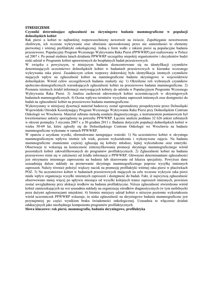 STRESZCZENIE Czynniki determinujące zgłaszalność na skryningowe badania mammograficzne w populacji dolnośląskich kobiet Rak piersi u kobiet to najbardziej rozpowszechniony nowotwór na świecie. Zapobieganie nowotworom złośliwym, ich wczesne wykrywanie oraz obniżanie spowodowanej przez nie umieralności to elementy pierwotnej i wtórnej profilaktyki onkologicznej. Jedną z form walki z rakiem piersi są populacyjne badania przesiewowe. Populacyjny Program Wczesnego Wykrywania Raka Piersi (PPWWRP) jest realizowany w Polsce od 2007 r. Po ponad siedmiu latach działania PPWWRP szczególny niepokój organizatorów i decydentów budzi niski udział w Programie kobiet uprawnionych do bezpłatnych badań przesiewowych. W związku z powyższym, w niniejszym badaniu skoncentrowano się na identyfikacji czynników determinujących uczestnictwo dolnośląskich kobiet w badaniach przesiewowych w kierunku wczesnego wykrywania raka piersi. Zasadniczym celem rozprawy doktorskiej była identyfikacja istotnych czynników mających wpływ na zgłaszalność kobiet na mammograficzne badania skryningowe w województwie dolnośląskim. Wśród celów szczegółowych badania znalazły się: 1) Określenie roli wybranych czynników społeczno-demograficznych warunkujących zgłaszalność kobiet na przesiewowe badania mammograficzne. 2) Poznanie istotnych źródeł informacji motywujących kobiety do udziału w Populacyjnym Programie Wczesnego Wykrywania Raka Piersi. 3) Analiza zachowań zdrowotnych kobiet uczestniczących w skryningowych badaniach mammograficznych. 4) Ocena wpływu terminów wysyłania zaproszeń imiennych oraz dostępności do badań na zgłaszalność kobiet na przesiewowe badania mammograficzne. Wykorzystany w niniejszej dysertacji materiał badawczy został zgromadzony prospektywnie przez Dolnośląski Wojewódzki Ośrodek Koordynujący Program Wczesnego Wykrywania Raka Piersi przy Dolnośląskim Centrum Onkologii we Wrocławiu. Materiał zebrano metodą sondażu diagnostycznego, a instrumentem pomiarowym był kwestionariusz ankiety sporządzony na potrzeby PPWWRP. Łącznie analizie poddano 32 626 ankiet zebranych w okresie pomiędzy 3 stycznia 2007 r. a 30 grudnia 2011 r. Badanie dotyczyło populacji dolnośląskich kobiet w wieku 50-69 lat, które zgłosiły się do Dolnośląskiego Centrum Onkologii we Wrocławiu na badanie mammograficzne wykonane w ramach PPWWRP. W oparciu o uzyskane wyniki, sformułowano następujące wnioski: 1) Na uczestnictwo kobiet w skryningu mammograficznym wpływa istotnie ich wiek, poziom wykształcenia i wykonywane zajęcie. Na badania mammograficzne znamiennie częściej zgłaszają się kobiety młodsze, lepiej wykształcone oraz emerytki. Obserwacje te wskazują na konieczność zintensyfikowania promocji skryningu mammograficznego wśród pozostałych kobiet zakwalifikowanych do programów profilaktycznych. 2) Zgłaszalność kobiet na badania przesiewowe różni się w zależności od źródła informacji o PPWWRP. Głównymi determinantami zgłaszalności jest otrzymanie imiennego zaproszenia na badanie lub skierowanie od lekarza specjalisty. Powyższe dane uzasadniają dalsze nakłady na promowanie skryningu mammograficznego poprzez wysyłkę imiennych zaproszeń. Należy również położyć większy nacisk na promocję profilaktyki wtórnej raka piersi w placówkach POZ. 3) Na uczestnictwo kobiet w badaniach przesiewowych mających na celu wczesne wykrycie raka piersi miała wpływ organizacja wysyłki imiennych zaproszeń i dostępność do badań. Fakt, iż najwyższą zgłaszalność obserwowano mniej więcej po upływie miesiąca od wysyłki kolejnych transz zaproszeń imiennych, powinien zostać uwzględniony przy alokacji środków na badania profilaktyczne. Niższa zgłaszalność stwierdzona wśród kobiet zamieszkujących na wsi uzasadnia nakłady na organizację ośrodków diagnostycznych (w tym mobilnych) poza dużymi aglomeracjami miejskimi. 4) Istotnie mniejszy udział kobiet o niższym poziomie wykształcenia wśród uczestniczek PPWWRP wskazuje, że niska zgłaszalność na skryningowe badania mammograficzne jest przynajmniej po części wynikiem braku świadomości onkologicznej. Uzasadnia to włączenie działań edukacyjnych jako niezbędnego komponentu programów profilaktycznych. Słowa kluczowe: rak piersi, mammografia, badania skryningowe, profilaktyka