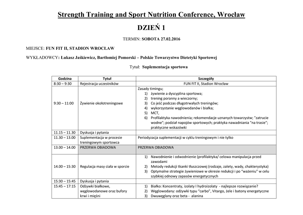 Strength Training and Sport Nutrition Conference, Wrocław DZIEŃ 1 TERMIN: SOBOTA 27.02.2016 MIEJSCE: FUN FIT II, STADION WROCŁAW WYKŁADOWCY: Łukasz Jaśkiewicz, Bartłomiej Pomorski – Polskie Towarzystwo Dietetyki Sportowej Tytuł: Suplementacja sportowa Godzina 8:30 – 9:30 Tytuł Rejestracja uczestników 9:30 – 11:00 Żywienie okołotreningowe 11.15 – 11.30 11.30 – 13.00 Dyskusja i pytania Suplementacja w procesie treningowym sportowca PRZERWA OBIADOWA 13.00 – 14.00 14.00 – 15:30 Regulacja masy ciała w sporcie 15:30 – 15:45 15:45 – 17:15 Dyskusja i pytania Odżywki białkowe, węglowodanowe oraz bufory krwi i mięśni Szczegóły FUN FIT II, Stadion Wrocław Zasady timingu; 1) żywienie a dyscyplina sportowa; 2) trening poranny a wieczorny; 3) Co jeść podczas długotrwałych treningów; 4) wykorzystanie węglowodanów i białka; 5) MCT, 6) Profilaktyka nawodnienia; rekomendacje uznanych towarzystw; "zatrucie wodne"; podział napojów sportowych; praktyka nawadniania "na trasie"; praktyczne wskazówki Periodyzacja suplementacji w cyklu treningowym i nie tylko PRZERWA OBIADOWA 1) Nawodnienie i odwodnienie (profilaktyka/ celowa manipulacja przed zawodami 2) Metody redukcji tkanki tłuszczowej (rodzaje, zalety, wady, chakterystyka) 3) Optymalne strategie żywieniowe w okresie redukcji i po “ważeniu” w celu szybkiej odnowy zapasów energetycznych 1) Białko: Koncentraty, izolaty I hydroizolaty - najlepsze rozwiązanie? 2) Węglowodany: odżywki typu “carbo”, Vitargo, żele i batony energetyczne 3) Dwuwęglany oraz beta - alanina DZIEŃ 2 TERMIN: NIEDZIELA 28.02.2016 MIEJSCE: FUN FIT II STADION WROCŁAW, WYKŁADOWCA: Ian Jeffreys, PhD, FNSCA, PGCE, CSCS*D, ASCC, NSCA-CPT*D, NSCA Coach Practitioner TYTUŁ: “A Gameforce approach to developing effective strength training programmes” Godzina 8:30 – 9:30 9:30 9.45 – 10.45 11.00 – 12.30 12.30 – 13.30 13.30 – 16.30 Organizatorzy: Tytuł Rejestracja uczestników szkolenia Rozpoczęcie szkolenia The nature of Athletic Performance and the Game Performance Training System Game force – Strength training for performance Strength training for performance Forma zajęć Szczegóły FUN FIT II, Stadion Wrocław Prezentacja Prezentacja Częśc praktyczna Przedstawienie koncepcji przygotowania motorycznego na podstawie na podstwie tzw. “Triangulated system - specifity of sport”. Przygotowanie motoryczne w ujęciu fizjologicznym i biomechanicznym (kinematyczym) oraz kinetycznym (działania sił) pod wybraną dyscyplinę sportową 1) Transfer siły i mocy mieśniowej w rywalizacji sportowej. 2) Koncepcja analizy ruchu w programowaniu treningu sportowego. PRZERWA OBIADOWA Część aplikacyjna koncepcji “movement based strength training” w celu rozwoju poszczególnych cech motorycznych. Zapoznanie się z podstawowymi formami i wzorcami ruchowymi w przygotowaniu motorycznym. Nauka oraz progresja ćwiczeń siłowych i funkcjonalnych w poszczególnych etapach poziomu sportowego zawodnika. OSOBY PROWADZĄCE SZKOLENIE: MODUŁ 1 - SOBOTA (27.02.2016r.) Bartłomiej Pomorski – współpracował lub współpracuje z zawodowcami, w tym zawodnikami kadry Polski różnych dyscyplin (rugby, piłka nożna, windsurfing RS:X, AZS Politechnika Warszawska). Na co dzień zajmuje się przygotowaniem planów żywieniowych oraz suplementacyjnych dla sportowców w poradni dietetycznej Dietetyka Sportowa. Pisze do magazynów branżowych (m.in. „Bieganie”, „Runners World”, „Współczesna Dietetyka”). Łukasz Jaśkiewicz – dietetyk sportowy współpracujący z zawodnikami wielu dyscyplin sportowych. Aktywny sportowiec i doświadczony szkoleniowiec, umiejętnie łączący współczesne podejście naukowe z praktyką. Na co dzień prowadzący poradnię dietetyki sportowej. Wieloletni praktyk i pasjonat szeroko pojętego żywienia w sporcie, przedstawiający w lekki i przyjemny sposób tajniki pracy ze sportowcami z punktu widzenia trenera, dietetyka i sportowca. Przez ostatnie 10 lat blisko współpracujący z branżą wspomagania żywieniowego. DZIEŃ 2 – NIEDZIELA (28.02.2016r.) Ian Jeffreys, PhD, FNSCA, PGCE, CSCS*D, ASCC, NSCA-CPT*D, NSCA Coach Practitioner Ian Jefferys jest międzynarodowym ekspertem i naukowcem z zakresy rozwoju zdolnośći koordynacyjnych i szybkośći, a także z zakresu ogólnego przygotowania motorycznego w grach zespołowych. Dr Jeffreys jest m.in twórcą systemu “Gamespeed”, a także protokołu RAMP Warm – up (Raise, Activate, Mobilize, Potentiate) wykorzystywanych w Premier League i ośrodkach treningowych na całym świecie. Obecnie jest wykładowcą na Uniwersytecie w Południowej Walii gdzie równocześnie jest koordynatorem i głównym konsultantem przygotowania motorycznego piłkarzy Cardiff City. Ian Jeffreys jest członkiem oraz jednym z założycieli UKSCA (United Kingdom Strength and Conditioning Association), gdzie również pracuje jako wykładowca. Od 1989 r. należy do NSCA - w 2006 r. zdobył nagrodę dla najlepszego trenera przygotowania motorycznego grup młodzieżowych. Ian posiada certyfikaty najlpszych organizacji na świecie, a także został wyróżniony jako specjalista przygotowania motorycznego organizacji NSCA (CSCS, RSCC, NSCA-CPT). W 2015 roku wyrożniony przez UKSCA za swoją dotychczasową działalność na recz rozwoju sportu w Wielkiej Brytanii. Ian jest również członkiem i konsultantem Brytyjskiego Komitetu Olimpijskiego. Ian miał okazję współpracować z zawodnikami z całego świata m.in: USA, Wielkiej Brytanii, Korei, Chin, Turcji, Norwegii i Irlandii. Ian pracował również jako konsultant Kadry Narodowej Irlandii w Rugby, a także z Chińskim Wydziałem Sportu i Koreńskim Stowarzyszeniem Treningu Motorycznego. INFORMACJE OGÓLNE 1) DATA SZKOLENIA: 27 – 28.02.2016r. 2) MIEJSCE SZKOLENIA: FUN - FIT II KLUB FITNESS, Al. Śląska 1 (STADION WROCŁAW), Wrocław 3) CENA SZKOLENIA KOSZT SZKOLENIA ZA 2 DNI WYNOSI: 450 zł. ISTNIEJE MOŻLIWOŚ