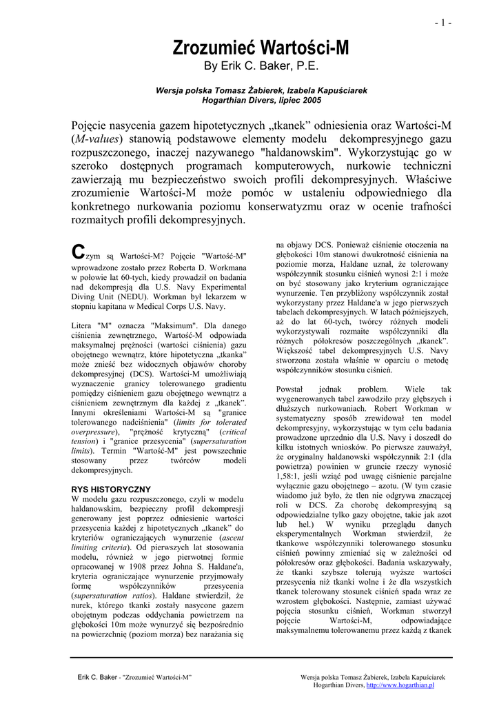 -1- Zrozumieć Wartości-M By Erik C. Baker, P.E. Wersja polska Tomasz śabierek, Izabela Kapuściarek Hogarthian Divers, lipiec 2005 Pojęcie nasycenia gazem hipotetycznych „tkanek” odniesienia oraz Wartości-M (M-values) stanowią podstawowe elementy modelu dekompresyjnego gazu rozpuszczonego, inaczej nazywanego "haldanowskim". Wykorzystując go w szeroko dostępnych programach komputerowych, nurkowie techniczni zawierzają mu bezpieczeństwo swoich profili dekompresyjnych. Właściwe zrozumienie Wartości-M moŜe pomóc w ustaleniu odpowiedniego dla konkretnego nurkowania poziomu konserwatyzmu oraz w ocenie trafności rozmaitych profili dekompresyjnych. C zym są Wartości-M? Pojęcie "Wartość-M" wprowadzone zostało przez Roberta D. Workmana w połowie lat 60-tych, kiedy prowadził on badania nad dekompresją dla U.S. Navy Experimental Diving Unit (NEDU). Workman był lekarzem w stopniu kapitana w Medical Corps U.S. Navy. Litera "M" oznacza "Maksimum". Dla danego ciśnienia zewnętrznego, Wartość-M odpowiada maksymalnej pręŜności (wartości ciśnienia) gazu obojętnego wewnątrz, które hipotetyczna „tkanka” moŜe znieść bez widocznych objawów choroby dekompresyjnej (DCS). Wartości-M umoŜliwiają wyznaczenie granicy tolerowanego gradientu pomiędzy ciśnieniem gazu obojętnego wewnątrz a ciśnieniem zewnętrznym dla kaŜdej z „tkanek”. Innymi określeniami Wartości-M są "granice tolerowanego nadciśnienia" (limits for tolerated overpressure), "pręŜność krytyczną" (critical tension) i "granice przesycenia" (supersaturation limits). Termin "Wartość-M" jest powszechnie stosowany przez twórców modeli dekompresyjnych. RYS HISTORYCZNY W modelu gazu rozpuszczonego, czyli w modelu haldanowskim, bezpieczny profil dekompresji generowany jest poprzez odniesienie wartości przesycenia kaŜdej z hipotetycznych „tkanek” do kryteriów ograniczających wynurzenie (ascent limiting criteria). Od pierwszych lat stosowania modelu, równieŜ w jego pierwotnej formie opracowanej w 1908 przez Johna S. Haldane'a, kryteria ograniczające wynurzenie przyjmowały formę współczynników przesycenia (supersaturation ratios). Haldane stwierdził, Ŝe nurek, którego tkanki zostały nasycone gazem obojętnym podczas oddychania powietrzem na głębokości 10m moŜe wynurzyć się bezpośrednio na powierzchnię (poziom morza) bez naraŜania się Erik C. Baker - "Zrozumieć Wartości-M” na objawy DCS. PoniewaŜ ciśnienie otoczenia na głębokości 10m stanowi dwukrotność ciśnienia na poziomie morza, Haldane uznał, Ŝe tolerowany współczynnik stosunku ciśnień wynosi 2:1 i moŜe on być stosowany jako kryterium ograniczające wynurzenie. Ten przybliŜony współczynnik został wykorzystany przez Haldane'a w jego pierwszych tabelach dekompresyjnych. W latach późniejszych, aŜ do lat 60-tych, twórcy róŜnych modeli wykorzystywali rozmaite współczynniki dla róŜnych półokresów poszczególnych „tkanek”. Większość tabel dekompresyjnych U.S. Navy stworzona została właśnie w oparciu o metodę współczynników stosunku ciśnień. Powstał jednak problem. Wiele tak wygenerowanych tabel zawodziło przy głębszych i dłuŜszych nurkowaniach. Robert Workman w systematyczny sposób zrewidował ten model dekompresyjny, wykorzystując w tym celu badania prowadzone uprzednio dla U.S. Navy i doszedł do kilku istotnych wniosków. Po pierwsze zauwaŜył, Ŝe oryginalny haldanowski współczynnik 2:1 (dla powietrza) powinien w gruncie rzeczy wynosić 1,58:1, jeśli wziąć pod uwagę ciśnienie parcjalne wyłącznie gazu obojętnego – azotu. (W tym czasie wiadomo juŜ było, Ŝe tlen nie odgrywa znaczącej roli w DCS. Za chorobę dekompresyjną są odpowiedzialne tylko gazy obojętne, takie jak azot lub hel.) W wyniku przeglądu danych eksperymentalnych Workman stwierdził, Ŝe tkankowe współczynniki tolerowanego stosunku ciśnień powinny zmieniać się w zaleŜności od półokresów oraz głębokości. Badania wskazywały, Ŝe tkanki szybsze tolerują wyŜsze wartości przesycenia niŜ tkanki wolne i Ŝe dla wszystkich tkanek tolerowany stosunek ciśnień spada wraz ze wzrostem głębokości. Następnie, zamiast uŜywać pojęcia stosunku ciśnień, Workman stworzył pojęcie Wartości-M, odpowiadające maksymalnemu tolerowanemu przez kaŜdą z tkanek Wersja polska Tomasz śabierek, Izabela Kapuściarek Hogarthian Divers, http://www.hogarthian.pl -2na odpowiedniej głębokości ciśnieniu parcjalnemu gazów obojętnych. Potem stworzył liniową estymację Wartości-M jako funkcji głębokości i zauwaŜył, Ŝe jest ona zbliŜona do rzeczywistych danych eksperymentalnych. Stwierdził, Ŝe "liniowa estymacja wartości M jest równieŜ przydatna przy tworzeniu programu komputerowego". WARTOŚCI-M WORKMANA Przedstawienie przez Workmana Wartości-M w postaci równania funkcji liniowej stanowiło istotny krok w ewolucji dekompresyjnego modelu gazu rozpuszczonego. Jego Wartości-M doprowadziły do wprowadzenia liniowej zaleŜności pomiędzy głębokością (lub ciśnieniem zewnętrznym) a tolerowanym przez kaŜdą z „tkanek” odniesienia ciśnieniem gazu obojętnego. Ta koncepcja stanowi waŜny element współczesnego modelu gazu rozpuszczonego, wykorzystywanego przez wielu twórców modeli dekompresyjnych. Workman wyraził Wartości-M w postaci par współczynników przesunięcie-nachylenie równania funkcji liniowej (patrz rys. 1). Wartość M na powierzchni oznaczana jest symbolem MO [M-zero] i stanowi punkt przecięcia się wykresu funkcji z osią odciętych przy ciśnieniu zewnętrznym 1 bar ( głębokości „0” na poziomie morza). Współczynnik nachylenia funkcji określa się symbolem ∆M [delta M], które odpowiada zmianie wartości M wraz ze zmianą ciśnienia na głębokości. WARTOŚCI-M BÜHLMANNA W roku 1959 w Laboratorium Fizjologii Hiperbarycznej Szpitala Uniwersyteckiego w szwajcarskim Zurichu badania nad dekompresją rozpoczął profesor