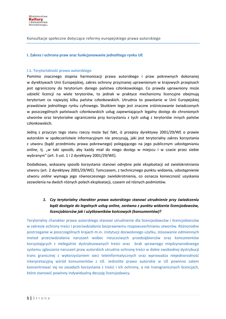 Konsultacje społeczne dotyczące reformy europejskiego prawa autorskiego I. Zakres i ochrona praw oraz funkcjonowanie jednolitego rynku UE I.1. Terytorialnośd prawa autorskiego Pomimo znacznego stopnia harmonizacji prawa autorskiego i praw pokrewnych dokonanej w dyrektywach Unii Europejskiej, zakres ochrony przyznanej uprawnionym w krajowych przepisach jest ograniczony do terytorium danego paostwa członkowskiego. Co prawda uprawniony może udzielid licencji na wiele terytoriów, to jednak w praktyce mechanizmy licencyjne obejmują terytorium co najwyżej kilku paostw członkowskich. Utrudnia to powstanie w Unii Europejskiej prawdziwie jednolitego rynku cyfrowego. Skutkiem tego jest znaczne zróżnicowanie świadczonych w poszczególnych paostwach członkowskich usług zapewniających legalny dostęp do chronionych utworów oraz terytorialne ograniczenia przy korzystaniu z tych usług z terytoriów innych paostw członkowskich. Jedną z przyczyn tego stanu rzeczy może byd fakt, iż przepisy dyrektywy 2001/29/WE o prawie autorskim w społeczeostwie informacyjnym nie precyzują, jaki jest terytorialny zakres korzystania z utworu (bądź przedmiotu prawa pokrewnego) polegającego na jego publicznym udostępnianiu online, tj. „w taki sposób, aby każdy miał do niego dostęp w miejscu i w czasie przez siebie wybranym” (art. 3 ust. 1 i 2 dyrektywy 2001/29/WE). Dodatkowo, wskazany sposób korzystania stanowi odrębne pole eksploatacji od zwielokrotniania utworu (art. 2 dyrektywy 2001/29/WE). Tymczasem, z technicznego punktu widzenia, udostępnienie utworu online wymaga jego równoczesnego zwielokrotnienia, co oznacza koniecznośd uzyskania zezwolenia na dwóch różnych polach eksploatacji, czasem od różnych podmiotów. 1. Czy terytorialny charakter prawa autorskiego stanowi utrudnienie przy świadczeniu bądź dostępie do legalnych usług online, zarówno z punktu widzenia licencjodawców, licencjobiorców jak i użytkowników koocowych (konsumentów)? Terytorialny charakter prawa autorskiego stanowi utrudnienie dla licencjodawców i licencjobiorców w zakresie ochrony treści i przeciwdziałania bezprawnemu rozpowszechnianiu utworów. Różnorodne postrzeganie w poszczególnych krajach m.in. instytucji dozwolonego użytku, stosowanie odmiennych metod przeciwdziałania naruszeo wobec nieuczciwych przedsiębiorców oraz konsumentów korzystających z nielegalnie dystrybuowanych treści oraz brak sprawnego międzynarodowego systemu zgłaszania naruszeo praw autorskich utrudnia ochronę treści w dobie swobodnej dystrybucji trans granicznej z wykorzystaniem sieci teleinformatycznych oraz wprowadza niejednorodnośd interpretacyjną wśród konsumentów z UE. Jednolite prawo autorskie w UE powinno zatem koncentrowad się na zasadach korzystania z treści i ich ochrony, a nie transgranicznych licencjach, które stanowid powinny indywidualną decyzję licencjodawcy. 1|Strona 2. Jakie trudności wiążą się z brakiem określenia terytorialnego zakresu korzystania z utworu w taki sposób, aby każdy miał do niego dostęp w miejscu i w czasie przez siebie wybranym? Zakres terytorialny licencji powinien byd nadal decyzją biznesową licencjodawcy, a nie narzuconych regulacji. W przeciwnym wypadku drastycznie utrudniona zostanie konkurencja małych przedsiębiorców z globalnymi graczami, dla których pozyskanie praw transgranicznych stanowi mniejszą barierę wejścia niż dla lokalnych przedsiębiorców. 3. Jakie trudności wiążą się z koniecznością uzyskania zezwolenia na dwóch polach eksploatacji (zwielokrotnianie i publiczne udostępnianie) w celu udostępniania utworów online? Trudności w tej kwestii dotyczyd mogą potencjalnych podwójnych roszczeo Organizacji Zbiorowego Zarządzania. Już obecna sytuacja na polskim rynku związana z niejasnym systemem naliczania i rozliczania kwot katalogowych prowadzi nieraz do sytuacji, w której Organizacje Zbiorowego Zarządzania próbują rościd sobie prawa do części przychodów dystrybutorów treści w skali uniemożliwiającej prowadzenie działalności gospodarczej. W 2012 roku kilkanaście organizacji zbiorowego zarządzania złożyło wnioski o ustanowienie należnych im kwot katalogowych, co w rezultacie prowadziłoby do konieczności odprowadzania na rzecz OZZ od kilkudziesięciu, a w przypadku niektórych podmiotów do nawet ponad 100 procent łącznych przychodów danego przedsiębiorstwa. Konieczne jest zatem uporządkowanie kwestii systemu naliczania należności na rzecz Organizacji Zbiorowego Zarządzania z ustaleniem kwot maksymalnych oraz systemu rozliczenia z jedną organizacją odpowiednią dla danego typu działalności. 4. W jaki sposób te utrudnienia mogą zostad wyeliminowane bądź ograniczone, tak aby poprawid dostępnośd legalnych treści w formatach cyfrowych we wszystkich paostwach Unii Europejskiej przy równoczesnym zapewnieniu odpowiedniej ochrony dla uprawnionych? Czy konieczna jest tu i jak powinna w tym wypadku wyglądad interwencja unijnego ustawodawcy? Wzorem prób regulacji kwestii transgranicznych licencji na utwory muzyczne należałoby dad swobodę wyboru organizacji zbiorowego zarządzania na terenie UE bądź wyboru samodzielnych rozliczeo z autorami. Interwencja unijnego ustawodawcy dotyczyd powinna wymuszenia transparentności rozliczeo przez organizacje zbiorowego zarządzania tak, aby przepływy pieniężne pomiędzy organizacjami a twórcami i artystami nie budziły obecnych wątpliwości. Dystrybucja cyfrowa pozwala na precyzyjne określenie liczby odtworzeo utworów danego artysty, co pozwala na bezpośrednie rozliczenia z autorami, bez pośrednictwa organizacji, których rola w świecie mediów analogowych polegała w dużym stopniu na proponowaniu systemu podziału łącznych środków pomiędzy artystów. W przypadku dystrybucji cyfrowej taki system jest bezzasadny i niekorzystny szczególnie dla drobniejszych artystów. Zatem dystrybutorzy obecnie są lepiej przygotowani do transp