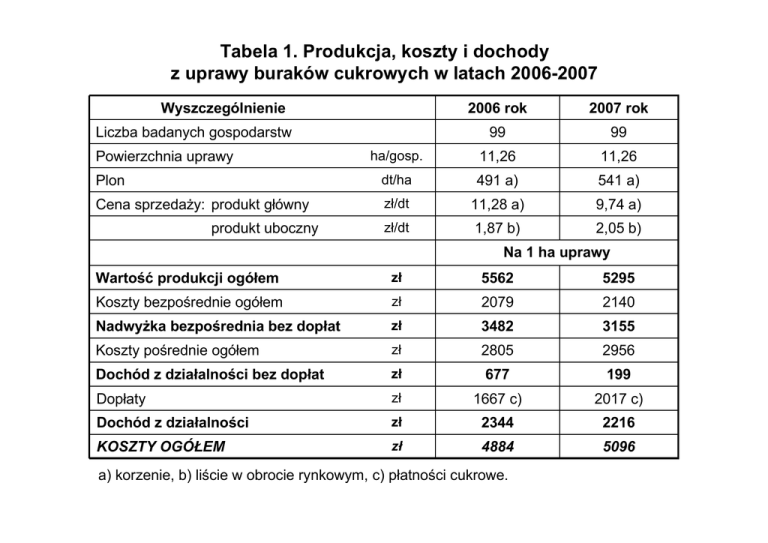 Tabela 1. Produkcja, koszty i dochody z uprawy buraków cukrowych w latach 2006-2007 Wyszczególnienie 2006 rok 2007 rok 99 99 ha/gosp. 11,26 11,26 Plon dt/ha 491 a) 541 a) Cena sprzedaży: produkt główny zł/dt 11,28 a) 9,74 a) zł/dt 1,87 b) 2,05 b) Liczba badanych gospodarstw Powierzchnia uprawy produkt uboczny Na 1 ha uprawy Wartość produkcji ogółem zł 5562 5295 Koszty bezpośrednie ogółem zł 2079 2140 Nadwyżka bezpośrednia bez dopłat zł 3482 3155 Koszty pośrednie ogółem zł 2805 2956 Dochód z działalności bez dopłat zł 677 199 Dopłaty zł 1667 c) 2017 c) Dochód z działalności zł 2344 2216 KOSZTY OGÓŁEM zł 4884 5096 a) korzenie, b) liście w obrocie rynkowym, c) płatności cukrowe. Rys. 1. Koszty ogółem i dochód z działalności z uprawy buraków cukrowych w 2007 roku – w zależności od skali uprawy, w zł/ha 7000 6000 koszty ogółem dochód z działalności 5481 5096 5131 4808 5000 4000 3000 2216 2000 2373 2682 1829 1000 0 średnio (11,3 ha) 1-5 ha 10-15 ha 20-45 ha Tabela 2. Produkcja, koszty i dochody z uprawy kukurydzy na ziarno w latach 2006-2007 Wyszczególnienie 2006 rok 2007 rok 97 97 ha/gosp. 30,19 30,19 Plon dt/ha 50,2 a) 79,8 a) Cena sprzedaży: produkt główny zł/dt 43,54 a) 62,32 a) zł/dt – – Liczba badanych gospodarstw Powierzchnia uprawy produkt uboczny Na 1 ha uprawy Wartość produkcji ogółem zł 2184 4975 Koszty bezpośrednie ogółem zł 1393 1459 Nadwyżka bezpośrednia bez dopłat zł 791 3516 Koszty pośrednie ogółem zł 1011 1065 Dochód z działalności bez dopłat zł –220 2451 Dopłaty zł 300 b) 283 b) Dochód z działalności zł 80 2734 KOSZTY OGÓŁEM zł 2404 2524 a) ziarno, b) płatność uzupełniająca. Rys. 2. Koszty ogółem i dochód z działalności z uprawy kukurydzy na ziarno w 2007 roku – w zależności od skali uprawy, w zł/ha 4000 koszty ogółem dochód z działalności 3500 3000 2524 3074 2734 2500 2485 2486 2481 2695 2505 2000 1500 1000 500 0 średnio (30,2 ha) 1-5 ha 10-20 ha 40-100 ha Tabela 3. Produkcja, koszty i dochody z uprawy pszenicy ozimej w latach 2006-2007 Wyszczególnienie 2006 rok 2007 rok 145 145 ha/gosp. 18,09 18,09 Plon dt/ha 44,5 a) 53,5 a) Cena sprzedaży: produkt główny zł/dt 48,73 a) 76,16 a) zł/dt 7,65 b) 11,38 b) Liczba badanych gospodarstw Powierzchnia uprawy produkt uboczny Na 1 ha uprawy Wartość produkcji ogółem zł 2186 4103 Koszty bezpośrednie ogółem zł 878 967 Nadwyżka bezpośrednia bez dopłat zł 1308 3136 Koszty pośrednie ogółem zł 881 930 Dochód z działalności bez dopłat zł 428 2205 Dopłaty zł 303 c) 285 c) Dochód z działalności zł 731 2490 KOSZTY OGÓŁEM zł 1759 1897 a) ziarno, b) słoma, c) płatność uzupełniająca. Rys. 3. Koszty ogółem i dochód z działalności z uprawy pszenicy ozimej w 2007 roku – w zależności od skali uprawy, w zł/ha 3500 koszty ogółem dochód z działalności 3000 2563 2490 2500 2000 2391 2282 2019 1897 1681 1774 1500 1000 500 0 średnio (18,1 ha) 1-4 ha 10-20 ha 40-120 ha Tabela 4. Produkcja, koszty i dochody z uprawy rzepaku ozimego w latach 2006-2007 Wyszczególnienie 2006 rok 2007 rok 122 122 ha/gosp. 19,61 19,61 Plon dt/ha 30,7 a) 30,9 a) Cena sprzedaży: produkt główny zł/dt 91,93 a) 93,90 a) zł/dt – – Liczba badanych gospodarstw Powierzchnia uprawy produkt uboczny Na 1 ha uprawy Wartość produkcji ogółem zł 2822 2904 Koszty bezpośrednie ogółem zl 1229 1306 Nadwyżka bezpośrednia bez dopłat zł 1593 1598 Koszty pośrednie ogółem zł 1029 1090 Dochód z działalności bez dopłat zł 564 509 Dopłaty zł 310 b) 291 b) Dochód z działalności zł 873 800 KOSZTY OGÓŁEM zł 2258 2396 a) nasiona, b) płatność uzupełniająca. Rys. 4. Koszty ogółem i dochód z działalności z uprawy rzepaku ozimego w 2007 roku – w zależności od skali uprawy, w zł/ha 3500 koszty ogółem dochód z działalności 3000 2500 2530 2396 2228 2181 2000 1500 1000 800 972 981 10-15 ha 20-60 ha 744 500 0 średnio (19,6 ha) 1-5 ha Tabela 5. Produkcja, koszty i dochody z uprawy wybranych roślin w 2006 roku – część I Buraki cukrowe Kukurydza a) Pszenica ozima Rzepak ozimy 99 97 145 122 ha/gosp. 11,26 30,19 18,09 19,61 Plon dt/ha 491 b) 50,2 c) 44,5 c) 30,7 d) Cena sprzedaży: produkt główny zł/dt 11,28 b) 43,54 c) 48,73 c) 91,93 d) zł/dt 1,87 e) – 7,65 f) – Wyszczególnienie Liczba badanych gospodarstw Powierzchnia uprawy produkt uboczny Na 1 ha uprawy Wartość produkcji ogółem zł 5562 2184 2186 2822 Koszty bezpośrednie ogółem zł 2079 1393 878 1229 w tym: materiał siewny zł 537 417 117 105 nawozy mineralne ogółem zł 800 531 471 692 środki ochrony roślin zł 672 138 256 387 zł 3482 791 1308 1593 Nadwyżka bezpośrednia bez dopłat a) na ziarno, b) korzenie, c) ziarno, d) nasiona, e) liście w obrocie rynkowym, f) słoma. Tabela 6. Produkcja, koszty i dochody z uprawy wybranych roślin w 2006 roku – część II Buraki cukrowe Wyszczególnienie Kukurydza a) Pszenica ozima Rzepak ozimy Na 1 ha uprawy Koszty pośrednie ogółem zł 2805 1011 881 1029 Dochód z działalności bez dopłat zł 677 –220 428 564 Dopłaty zł 1667 b) 300 c) 303 c) 310 c) Dochód z działalności zł 2344 80 731 873 KOSZTY OGÓŁEM zł 4884 2404 1759 2258 Nakłady pracy ogółem godz. 53,8 15,0 12,0 10,7 w tym: nakłady pracy własnej godz. 32,3 11,4 10,1 8,2 Na 1 dt produkcji Dochód z działalności zł 4,77 1,59 16,43 28,44 Na 1 godz. nakładów pracy własnej Dochód z działalności zł 72,57 a) na ziarno, b) płatności cukrowe, c) płatność uzupełniająca. 7,02 72,38 106,46 Rys. 5. Koszty ogółem i dochód z działalności z uprawy wybranych roślin w 2006 roku – średnio w badanych gospodarstwach, w zł/ha 6000 5000 koszty ogółem dochód z działalności 4884 4000 3000 2334 2404 2258 1759 2000 731 1000 873 80 0 buraki cukrowe kukurydza na ziarno pszenica ozima rzepak ozimy Tabela 7. Produkcja, koszty i dochody z uprawy wybranych roślin w 2007 roku – część I B