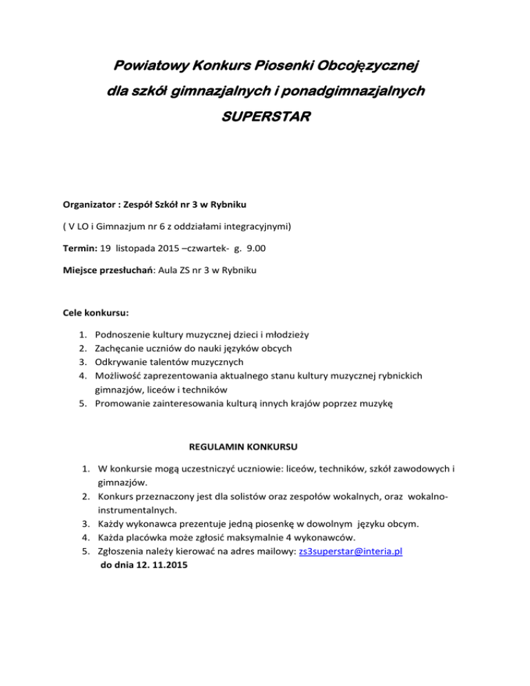 Superstar 2015- regulamin - Zespół Szkół nr 3 w Rybniku