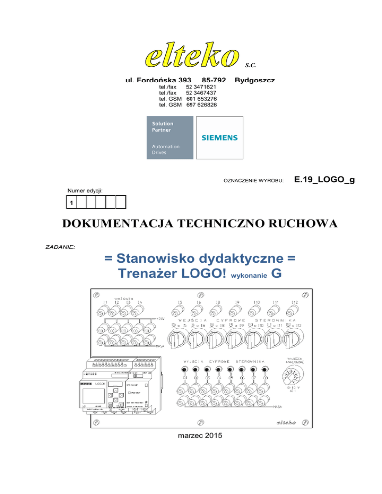 S.C. ul. Fordońska 393 tel./fax tel./fax tel. GSM tel. GSM 85-792 Bydgoszcz 52 3471621 52 3467437 601 653276 697 626826 OZNACZENIE WYROBU: E.19_LOGO_g Numer edycji: 1 DOKUMENTACJA TECHNICZNO RUCHOWA ZADANIE: = Stanowisko dydaktyczne = TrenaŜer LOGO! wykonanie G marzec 2015 2. Zawartość opracowania. 1. Strona tytułowa. 2. Zawartość opracowania. 3. ZałoŜenia. 4.Opis techniczny. 5. Rozmieszczenie elementów. 3. ZałoŜenia. Stworzenie kompletnego spójnego stanowiska do nauki i egzaminowania z podstaw programowania cyfrowego i wejścia analogowego sterownika LOGO! firmy SIEMENS na bazie LOGO! Soft Comfort, przeznaczone dla szkół technicznych ponadgimnazjalnych i wyŜszych w celu rozbudowywania i unowocześniania bazy kształcenia zawodowego. 4. Opis techniczny. 4.1. Zasilanie elektryczne Z prawego boku znajduje się złącze z wyłącznikiem IEC 60320 zasilające AC; C14 (E) gniazdo męskie; 10A Gniazdo posiada zabezpieczenie nadmiarowo prądowe topikowe 6,3A. Do niego naleŜy włączyć kabel o symbolu CEE 7/7 (E/F) wtyk kątowy lub prosty IEC C13 Ŝeński PVC czarny który jest integralną częścią zestawu. Wtyczkę naleŜy podłączyć do gniazdka sieciowego 230V AC +/- 10% (min 207 VAC do max 253 VAC) zgodnie z PN-IEC 60038:1999 w układzie TNS (trzyprzewodowo L, N, PE). Ze względów bezpieczeństwo uŜytkownika stanowisko powinno być poprzedzone układem róŜnicowo prądowym o prądzie róŜnicowym maksymalnie 30 mA. Uwaga ! A. NaleŜy zwrócić uwagę po której stronie znajduje się faza, a po której przewód neutralny N, zgodnie z oznaczeniem na przewodzie zasilającym ! B. Zasilacz 230VAC/24VDC 1.3A znajduje się wewnątrz zestawu. Po stronie czołowej znajduje się tylko napięcie 24VDC. Zasilacz posiada zabezpieczenie przed zwarciem na wyjściu. 4.2. Ogólna charakterystyka. Stanowisko dydaktyczne mieści się w walizce Tanosbox o wymiarach podstawy ca 396 x 292 i wysokości 158 mm. Dodatkowym atutem takiego rozwiązania jest moŜliwość łączenia walizek tego typu między sobą. W walizce znajdują się następujące elementy: 1. Obudowa trenaŜera z zasilaczem zabudowanym w środku i sterownikiem LOGO! z modułem rozszerzeń w wersji 8, łącznikami, potencjometrem i lampkami umieszczonymi na przednim panelu oraz gniazdami typu bananek fi 4 mm – 1 kpl 2. Przewód zasilający – 1 sztuka 3. Przewodu LAN – 1 sztuka 4. Oprogramowania narzędziowe LOGO! Soft Comfort V8 na której umieszczono dodatkowo instrukcję w wersji elektronicznej i przykładowe aplikacje. Obudowa trenaŜera ma składane poziome wsporniki które umoŜliwiają postawienie obudowy pod kątem około 19o i składa się z: - płyty montaŜowej ca 348 x 238 x 6 mm szt.1 - obudowa metalowej z wyłącznikiem ca 348 x 238 x 75 szt. 1 - zasilacza 230VAC/24V DC/1.3A szt. 1 - sterownika LOGO! wersja 8 szt. 1 - modułu rozszerzeń szt. 1 - przycisku astabilno– stabilnego szt. 7 - potencjometru szt. 1 - diody LED szt. 8 - gniazd bananowych fi 4 mm szt. 37 - podręcznik w języku polskim szt. 1 Sterownik LOGO! i zasilacz montowane na szynach TS-35. MoŜliwość pracy sterownika samodzielnie lub po sieci LAN w konfiguracji MASTER – MASTER i MASTER – SLAVE. Przyciski i lampki sterownicze umieszczone na płycie trenaŜera z moŜliwością zrównoleglenia. Całość okablowana. Układ zmontowany i gotowy do pracy. Oprogramowanie narzędziowe LOGO! Soft Comfort naleŜy wgrać do komputera klasy PC i z niego łączyć się ze sterownikiem. Oprogramowanie uŜytkowe wstępne, wgrane do sterownika nie jest zabezpieczone hasłem, słuŜy jedynie jako test sprawdzający układów wejścia i wyjścia sterownika. MoŜna je zarchiwizować przy pierwszym podłączeniu lub zmazać (skasować). Układ umoŜliwia równoległe przyłączenie z przyciskami istniejącymi dowolnych innych zewnętrznych aktywatorów w konfiguracji dwu lub trzy przewodowej (czujniki foto, pojemnościowe, kontaktronowe, indukcyjne i inne) w konfiguracji pnp poprzez listwę przewody zakończone bananem typu 4 mm. Dodatkowo istnieje moŜliwość równoległego podłączenia, do istniejących diod LED, odbiorników typu stycznik, przekaźnik, rozdzielacz elektropneumatyczny czy buczek równieŜ poprzez przewody z wtykami bananowymi 4 mm, co uatrakcyjnia zestaw trenaŜera. Istnieje moŜliwość wykorzystania 11 wejść i 8 wyjść cyfrowych sterownika, oraz 1 wejścia analogowego sterownika. Zalecana temperatura pracy od 0oC do 45oC. Stanowisko moŜe być przeznaczone do uczenia i egzaminowania. 50 40 60 70 30 20 80 90 100 elteko ZASILACZ DO ŚRODKA elteko 1