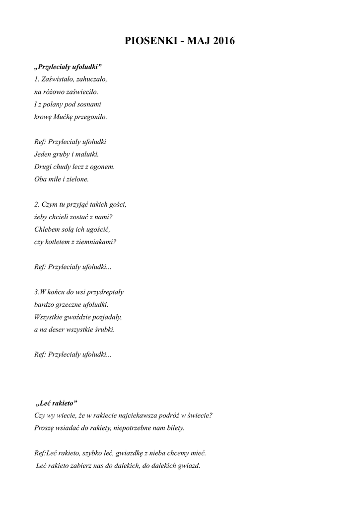 PIOSENKI - MAJ 2016 „Przyleciały ufoludki” 1. Zaświstało, zahuczało, na różowo zaświeciło. I z polany pod sosnami krowę Mućkę przegoniło. Ref: Przyleciały ufoludki Jeden gruby i malutki. Drugi chudy lecz z ogonem. Oba miłe i zielone. 2. Czym tu przyjąć takich gości, żeby chcieli zostać z nami? Chlebem solą ich ugościć, czy kotletem z ziemniakami? Ref: Przyleciały ufoludki... 3.W końcu do wsi przydreptały bardzo grzeczne ufoludki. Wszystkie gwoździe pozjadały, a na deser wszystkie śrubki. Ref: Przyleciały ufoludki... „Leć rakieto” Czy wy wiecie, że w rakiecie najciekawsza podróż w świecie? Proszę wsiadać do rakiety, niepotrzebne nam bilety. Ref:Leć rakieto, szybko leć, gwiazdkę z nieba chcemy mieć. Leć rakieto zabierz nas do dalekich, do dalekich gwiazd. II Już rakieta w niebo strzela, proszę trzymać się fotela. To jest jazda co się zowie, aż się trochę kręci w głowie. Ref: Leć rakieto…. III Nie dogoni nas balonik I samolot nie dogoni Już nam w dali Ziemia znika, mniejsza jest od balonika! Ref: Leć rakieto…. IV Za to gwiazdy są tak duże, że wam nawet nie powtórzę. Gdy na gwiazdy patrzeć z bliska, to nie gwiazdy lecz gwiaździska. Ref: Leć rakieto…. Piosenka o robocie V generacji. 1. Każdy uczeń czy przedszkolak, Takie łatwe i przyjemne życie ma. Biega sobie gdzieś przez pola, przez kałuże z zimną wodą sobie gna. A ja nie, a ja nie, Na mnie woda działa źle, boję się z deszczem dnia, żeby mnie nie zjadła rdza. 2. Każdy może zjeść za mało, a więc kiedy go w żołądku z głodu ssie, pije mleko i kakao, czekoladę i jabłuszko smaczne je. A ja nie, a ja nie to są dla mnie rzeczy złe Nawet ptyś ależ skąd Ja na obiad zjadam prąd. Każdy chłopak czy dziewczyna przez pagórki i ogródki dalej chop chociaż spadnie dziarska mina chociaż stłucze to i owo dalej skok A ja nie, a ja nie bo mi wstrząsy robią źle Boję się to jest fakt że się stłukę w drobny mak. Piosenka „Kocham Cię, Ti Amo, Je t'aime” I. Usiądź mamo przy mnie blisko I posłuchaj tych słów. Ty z pewnością wiesz to wszystko Jednak powiem to znów: Ref. Kocham Cię, Ti amo, Je t’aime i nie pytaj mnie dlaczego tak jest. Ty jesteś mą mamą, wspaniałą kochaną, jedyną na zawsze i kochasz mnie też! II. Popatrz tato w moje oczy Ujrzysz w nich miłość mą. Nawet bardzo późno w nocy Śpiewać będę Ci to: Ref . Kocham Cię, Ti amo, Je t’aime (że tę) i nie pytaj mnie dlaczego tak jest. Ty jesteś mym tatą, wspaniałym kochanym, jedynym na zawsze i kochasz mnie też! „Dzieci lubią zabawę” Dzieci lubią zabawę O każdej porze W domu, szkole, przedszkolu I jeszcze na dworze. A ja świetnych pomysłów Mam cały worek. Jeśli chcecie, to dla was Najlepsze wybiorę. Ref. Zagrać w piłkę i w berka, Bujać się na huśtawce, Wieżę z klocków zbudować, Puszczać w niebo latawce. Na rowerze się ścigać, Skarb ukryty odnaleźć, Bal urządzić maskowy, Suknie szyć dla lalek. Dzieci lubią się bawić, Na całym świecie. Gry, piosenki i pląsy Podobne znajdziecie. Chociaż w innych językach Są trudne słowa, Miłej, wspólnej zabawy Należy spróbować. Ref. Zagrać w piłkę i w berka…