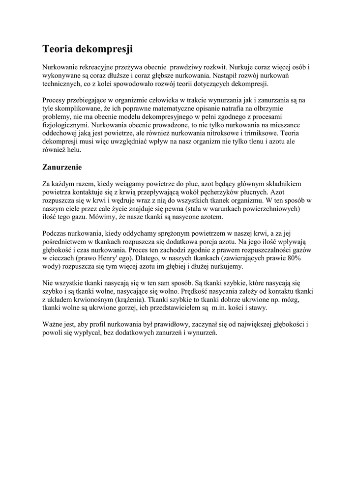 Teoria dekompresji Nurkowanie rekreacyjne przeżywa obecnie prawdziwy rozkwit. Nurkuje coraz więcej osób i wykonywane są coraz dłuższe i coraz głębsze nurkowania. Nastąpił rozwój nurkowań technicznych, co z kolei spowodowało rozwój teorii dotyczących dekompresji. Procesy przebiegające w organizmie człowieka w trakcie wynurzania jak i zanurzania są na tyle skomplikowane, że ich poprawne matematyczne opisanie natrafia na olbrzymie problemy, nie ma obecnie modelu dekompresyjnego w pełni zgodnego z procesami fizjologicznymi. Nurkowania obecnie prowadzone, to nie tylko nurkowania na mieszance oddechowej jaką jest powietrze, ale również nurkowania nitroksowe i trimiksowe. Teoria dekompresji musi więc uwzględniać wpływ na nasz organizm nie tylko tlenu i azotu ale również helu. Zanurzenie Za każdym razem, kiedy wciągamy powietrze do płuc, azot będący głównym składnikiem powietrza kontaktuje się z krwią przepływającą wokół pęcherzyków płucnych. Azot rozpuszcza się w krwi i wędruje wraz z nią do wszystkich tkanek organizmu. W ten sposób w naszym ciele przez całe życie znajduje się pewna (stała w warunkach powierzchniowych) ilość tego gazu. Mówimy, że nasze tkanki są nasycone azotem. Podczas nurkowania, kiedy oddychamy sprężonym powietrzem w naszej krwi, a za jej pośrednictwem w tkankach rozpuszcza się dodatkowa porcja azotu. Na jego ilość wpływają głębokość i czas nurkowania. Proces ten zachodzi zgodnie z prawem rozpuszczalności gazów w cieczach (prawo Henry' ego). Dlatego, w naszych tkankach (zawierających prawie 80% wody) rozpuszcza się tym więcej azotu im głębiej i dłużej nurkujemy. Nie wszystkie tkanki nasycają się w ten sam sposób. Są tkanki szybkie, które nasycają się szybko i są tkanki wolne, nasycające się wolno. Prędkość nasycania zależy od kontaktu tkanki z układem krwionośnym (krążenia). Tkanki szybkie to tkanki dobrze ukrwione np. mózg, tkanki wolne są ukrwione gorzej, ich przedstawicielem są m.in. kości i stawy. Ważne jest, aby profil nurkowania był prawidłowy, zaczynał się od największej głębokości i powoli się wypłycał, bez dodatkowych zanurzeń i wynurzeń. Profil prawidłowy - płetwonurek na początku nurkowania osiąga maksymalną głębokość i pozostaje na niej lub powoli zmniejsza głębokość, aż do rozpoczęcia wynurzania. Najważniejsze, aby zacząć nurkowanie od głębokości największej. Bardzo ważne jest również aby profil był maksymalnie płaski. Wynurzenie Podczas wynurzania kiedy ciśnienie wokół wypływającego nurka spada, zawarty w płynach tkankowych azot nie może utrzymać się dłużej w postaci rozpuszczonej i zaczyna wydzielać się z tkanek w formie mikropęcherzyków. Zjawisko to przypomina sytuację, kiedy z otwartej butelki szampana wydziela się CO2 (tam też ciśnienie cieczy, po wyjęciu korka, spada gwałtownie z poziomu ok. 2 at. do 1at). Podczas szybkiego wynurzenia rozprężające się pęcherzyki tego gazu mogą blokować naczynia krwionośne w różnych częściach organizmu powodując schorzenie zwane chorobą dekompresyjną. Aby nie dopuścić do gwałtownego wydzielania azotu w tkankach, wynurzenie nurka musi przebiegać z określoną prędkością, zależną od stosowanych tabel dekompresyjnych czy komputerów nurkowych. W warunkach wysokiego nasycenia azotem (po długich lub/i głębokich nurkowaniach) na określonych głębokościach należy przerwać wynurzanie wykonując tzw. przystanek dekompresyjny, podczas którego szkodliwy dla organizmu nadmiar azotu zostanie wydzielony. Wydzielany azot transportowany jest z krwią do płuc a tam przenika do pęcherzyków płucnych i usuwany jest na zewnątrz z wydychanym powietrzem. Proces usuwania azotu z tkanek organizmu zwany jest desaturacją i trwa również po wynurzeniu na powierzchnię, bowiem nie cały azot rozpuszczony w tkankach podczas nurkowania zostaje usunięty z nich w trakcie wynurzania. Ta zalegająca w tkankach ilość azotu musimy brać pod uwagę podczas planowania następnego nurkowania. Dekompresja nie jest stała i niezmienna, zależy od wielu czynników, większość z nich wydłuża wymagany czas dekompresji. Czynniki takie jak zimno czy ciężka praca zwiększają ryzyko choroby dekompresyjnej, ale to nie jedyne czynniki. Przerywanie wynurzania i pobyt na odpowiednich przystankach nazwano dekompresją. Zadaniem dekompresji jest umożliwienie nurkowi wynurzenie się na powierzchnię, tak szybko jak to jest tylko możliwe, bez spowodowania choroby dekompresyjnej. . Metody liczenia dekompresji Kiedy mamy policzyć dekompresję możemy skorzystać z kilku możliwości. 1. Tabele dekompresyjne- najstarsza metoda liczenia dekompresji. Używanie tabel jest obecnie bardzo rzadkie. 2. Komputery nurkowy -pozwalają liczyć dekompresję dla rzeczywistego profilu nurkowania, a nie jak to się dzieje w przypadku tabel - prostokątnego. 3. Komputer wielogazowy. Do nurkowań technicznych większość prostych komputerów nurkowych się nie nadaje, z powodu braku możliwości zmiany gazów w trakcie nurkowania. Komputer wielogazowy natomiast to komputer pozwalający na liczenie dekompresji przy uwzględnieniu zmiany mieszanki oddechowej w trakcie nurkowania. Najprostsze modele posiadają możliwość zaprogramowania dwóch mieszanek (tylko powietrze i nitrox), modele najbardziej zaawansowane do kilkudziesięciu mieszanek - powietrze, nitrox, trimix. Często użytkownik może wybrać jaki model dekompresyjny preferuje neo-haldanowki, RGBM czy VPM. 4. Programy dekompresyjne - programy na komputer PC, pomagające zaplanować i wyliczyć dekompresję. Dostępne są wersje oprogramowania na palmtopa a nawet, telefon komórkowy. 5. Minimum deco- to zalecany przez GUE sposób obliczania czasu nurkowania typu "non stop diving" czyli w nazewnictwie rekreacyjnym nurkowania bezdekompresyjnego. Nawet przy takim nurkowaniu GUE zaleca specjalną procedurę wynurzania. 6. Ratio d