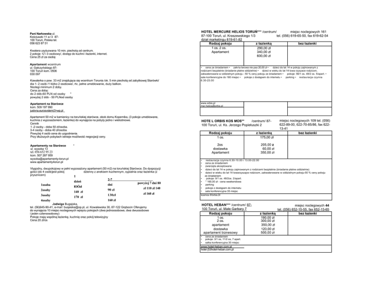 HOTEL MERCURE HELIOS TORUŃ*** /centrum/ miejsc noclegowych 161 87-100 Toruń, ul. Kraszewskiego 1/3 tel. (056) 619-65-50, fax 619-62-54 dział marketingu 619-61-82 Rodzaj pokoju z łazienką bez łazienki 1 os. 2 os. 290,00 zł Apartament 340,00 zł 600,00 zł Pani Narkowska ul. Kościuszki 11 a / 3 87100 Toruń, Polska tel. 056 623 87 51 Kwatera usytuowana 10 min. piechotą od centrum. 2 pokoje 12 i 3 osobowy/, dostęp do kuchni i łazienki, internet. Cena 25 zł za osobę Apartament wcentrum ul. Gałczyńskiego 87100 Toruń kom. 0506 030 097 Kawalerka o pow. 33 m2 znajdująca się wcentrum Torunia /ok. 5 min piechotą od zabytkowej Starówki/ dia 1- 2 osób /1 łóżko 2 osobowe/, rtv, pełne umeblowanie, duży balkon. Noclegi minimum 2 doby. Cena za dobę: do 2 dób-60 PLN od osoby " powyżej 2 dób - 50 PLNod osoby www.orbis.pl [email protected] Apartament na Starówce kom. 509 197 990 justvna.eurosvstem(3>wp.pl Apartament 50 m2 w kamienicy na toruńskiej starówce, obok domu Kopernika, (3 pokoje umeblowane, kuchnia z wyposażeniem, łazienka) do wynajęcia na pobyty jedno i wielodniowe. Cennik 1 -2 osoby - doba 50 zł/osoba. 3-4 osoby - doba 40 zł/osoba. Powyżej 4 osób cena do uzgodnienia. Przy dłuższych pobytach istnieje możliwość negocjacji ceny. Apartamenty na Starówce ul. wysoka 13 • cena ze śniadaniem • zakv\a terowa nie psa 20,00 zł • dzieci do lat 14 w pokoju zajmowanym z rodzicami bezpłatnie (śniadanie płatne oddzielnie) • dzieci w wieku do lat 14 towa rzyszace rodzicom, zakwaterowane w oddzielnym pokoju - 50 % ceny pokoju ze śniadaniem • pokoje: 56/1 os. 49/2 os. 5/apart. • sale konferencyjne do 180 miejsc • pokoje z dostępem do intemetu • parking • restauracja czynna 6.30-23.00 HOTE L ORBIS KOS MOS** /centrum/ 87100 Toruń, ul. Ks. Jerzego Popiełuszki 2 Rodzaj pokoju 1 os. 2os dostawka Apartament * tel. 056 652 95 23 kom. 507 287 959 [email protected] www.apartamenty4orun.pl Vtygodny, dwupokojowy w pełni wyposażony apartament (50 m2) na toruńskiej Starówce. Do dyspozycji gości (do 4 osób)jest pokój dzienny z aneksem kuchennym, sypialnia oraz łazienka (z prysznicem) 1 1osoba 2osoby 3osoby 4osoby dzień lOÓzł 140 zł 170 zł 190 zł 2-7 dni 90 zł 130zł powyżej 7 dni 80 zł 110 zł 140 zł 160 zł • • • • • • • • • • z łazienką 175,00 zł miejsc noclegowych 109 tel. (056) 622-89-00, 622-70-85/86, fax 62213-41 bez łazienki 205,00 z 60,00 zł 350,00 zł restauracja czynna 6.30-10.00 i 13.00-22.00 cena ze śniadaniem zwierzęta akceptowane dzieci do lat 14 w pokoju zajmowanym z rodzicami bezpłatnie (śniadanie płatne oddzielnie) dzieci w wieku do lat 14 towarzyszące rodzicom, zakwaterowane w oddzielnym pokoju-50 % ceny pokoju ze śniadaniem pokoje: 9/1 os. 48/2os. 2/apart. * 160,00 zł - cena weekendowa parking pokoje z dostępem do intemetu sala konferencyjna 35 miejsc kosmos ®!orbis.Dl 160 zł Jadwiga Bugajska, 180 zł tel. (56)645-90-41, e-mai!: [email protected], ul. Kowalewska 30, 87-122 Grębocin Oferujemy do wynajęcia 10 miejsc noclegowych wpięciu pokojach (dwa jednoosobowe, dwa dwuosobowe i jeden czteroosobowy) Pokoje mają wspólną łazienkę, kuchnię oraz pokój telewizyjny Cena 20 zł/os HOTEL HEBAN*** /centrum/ 87100 Toruń, ul. Małe Garbary 7 Rodzaj pokoju 1 os. 2 os. apartament dostawka apartament biznesowy • • • cena ze śniadaniem pokoje: 3/1 os, 11/2 os, 7 apart. salka konferencyjna 30 miejsc www.hotel-heban.com.pl hotel {53hotel-heban.com.pl miejsc noclegowych 44 tel. (056) 652-15-55, fax 652-15-65 z łazienką bez łazienki 190,00 zł 300,00 zł 350,00 zł 120,00 zł 500,00 zł