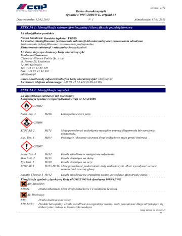 40.1.0 strona: 1/11 Karta charakterystyki zgodnie z 1907/2006/WE, artykuł 31 Data wydruku: 12.02.2015 V- 1 Aktualizacja: 17.01.2015 SEKCJA 1: Identyfikacja substancji/mieszaniny i identyfikacja przedsiębiorstwa 1.1 Identyfikator produktu Nazwa handlowa: 2K ROZCIEŃCZALNIK Korektor lepkości FK955AKRYLOWY STANDARD 1.2 Istotne zidentyfikowane zastosowania substancji lub mieszaniny oraz zastosowania odradzane Zastosowanie zidentyfikowane: zastosowanie profesjonalne. Zastosowanie substancji / mieszaniny Rozcieńczalnik 1.3 Dane dotyczące dostawcy karty charakterystyki Producent/Dostawca: Chemical Alliance Polska Sp. z o.o. ul. Prosta 23, Łozienica 72-100 Goleniów Tel. +48 91 41 65 440 Fax: +48 91 41 65 487 [email protected] Adres e-mail osoby odpowiedzialnej za kartę charakterystyki: [email protected] 1.4 Numer telefonu alarmowego: +48 91 41 65 440 (8:00-16:00) SEKCJA 2: Identyfikacja zagrożeń 2.1 Klasyfikacja substancji lub mieszaniny Klasyfikacja zgodnie z rozporządzeniem (WE) nr 1272/2008 ~ GHS02 Flam. Liq. 3 H226 Łatwopalna ciecz i pary. STOT RE 2 H373 Asp. Tox. 1 H304 Może powodować uszkodzenie narządów poprzez długotrwałe lub narażenie powtarzane. Połknięcie i dostanie się przez drogi oddechowe może grozić śmiercią. ~ ~ GHS08 GHS07 Acute Tox. 4 Skin Irrit. 2 Eye Irrit. 2 STOT SE 3 H332 H315 H319 H335-H336 Aquatic Chronic 3 H412 Działa szkodliwie w następstwie wdychania. Działa drażniąco na skórę. Działa drażniąco na oczy. Może powodować podrażnienie dróg oddechowych. Może wywoływać uczucie senności lub zawroty głowy. Działa szkodliwie na organizmy wodne, powodując długotrwałe skutki. Klasyfikacja zgodnie z dyrektywą Rady 67/548/EWG lub dyrektywą 1999/45/WE ? Xn; Szkodliwy G @ R20/21: Działa szkodliwie przez drogi oddechowe i w kontakcie ze skórą. ? Xi; Drażniący G @ R38: R10-52/53: Działa drażniąco na skórę. Produkt łatwopalny. Działa szkodliwie na organizmy wodne; może powodować długo utrzymujące się niekorzystne zmiany w środowisku wodnym. (ciąg dalszy na stronie 2) PL 40.1.0 strona: 2/11 Karta charakterystyki zgodnie z 1907/2006/WE, artykuł 31 Data wydruku: 12.02.2015 V- 1 Aktualizacja: 17.01.2015 Nazwa handlowa: 2K ROZCIEŃCZALNIK AKRYLOWY STANDARD Korektor lepkości FK955 (ciąg dalszy od strony 1) 2.2 Elementy oznakowania Oznakowanie zgodnie z rozporządzeniem (WE) nr 1272/2008 Produkt jest klasyfikowany i oznakowany zgodnie z przepisami CLP. Piktogramy wskazujące rodzaj zagrożenia ~ ~ ~ GHS02 GHS07 GHS08 Hasło ostrzegawcze Niebezpieczeństwo Składniki określające niebezpieczeństwo: ksylen octan 2-butoksyetylu octan butylu Zwroty wskazujące rodzaj zagrożenia H226 Łatwopalna ciecz i pary. H332 Działa szkodliwie w następstwie wdychania. H315 Działa drażniąco na skórę. H319 Działa drażniąco na oczy. H335-H336 Może powodować podrażnienie dróg oddechowych. Może wywoływać uczucie senności lub zawroty głowy. H373 Może powodować uszkodzenie narządów poprzez długotrwałe lub narażenie powtarzane. H304 Połknięcie i dostanie się przez drogi oddechowe może grozić śmiercią. H412 Działa szkodliwie na organizmy wodne, powodując długotrwałe skutki. Zwroty wskazujące środki ostrożności P210 Przechowywać z dala od źródeł ciepła, gorących powierzchni, źródeł iskrzenia, otwartego ognia i innych źródeł zapłonu. Nie palić. P260 Nie wdychać mgły/par/rozpylonej cieczy. P271 Stosować wyłącznie na zewnątrz lub w dobrze wentylowanym pomieszczeniu. P280 Stosować rękawice ochronne/odzież ochronną/ochronę oczu/ochronę twarzy. P301+P310 W PRZYPADKU POŁKNIĘCIA: Natychmiast skontaktować się z OŚRODKIEM ZATRUĆ/lekarzem. P501 Zawartość / pojemnik usuwać zgodnie z przepisami miejscowymi / regionalnymi / narodowymi / międzynarodowymi. 2.3 Inne zagrożenia Wyniki oceny właściwości PBT i vPvB PBT: Nie spełnia kryterów PBT. vPvB: Nie spełnia kryteriów vPvB. SEKCJA 3: Skład/informacja o składnikach 3.2 Charakterystyka chemiczna: Mieszaniny Opis: Mieszanina składająca się z niżej wymienionych składników. Składniki niebezpieczne: CAS: 123-86-4 octan butylu EINECS: 204-658-1 R10-66-67 Reg.nr.: 01-2119485493-29 ~ Flam. Liq. 3, H226; ~ STOT SE 3, H336 CAS: 1330-20-7 ksylen EINECS: 215-535-7 @ ? G Xn R20/21; ? @ G Xi R38 Reg.nr.: 01-2119488216-32 ~ Flam. Liq. 3, H226; ~ STOT RE 2, H373; Asp. Tox. 1, H304; ~ Acute Tox. 4, H312; Acute Tox. 4, H332; Skin Irrit. 2, H315; Eye Irrit. 2, H319; STOT SE 3, H335 25-50% 25-50% (ciąg dalszy na stronie 3) PL 40.1.0 strona: 3/11 Karta charakterystyki zgodnie z 1907/2006/WE, artykuł 31 Data wydruku: 12.02.2015 V- 1 Aktualizacja: 17.01.2015 Nazwa handlowa: 2K ROZCIEŃCZALNIK AKRYLOWY STANDARD Korektor lepkości FK955 (ciąg dalszy od strony 2) CAS: 108-65-6 EINECS: 203-603-9 Reg.nr.: 01-2119475791-29 CAS: 112-07-2 EINECS: 203-933-3 Reg.nr.: 01-2119475112-47 Numer WE: 918-668-5 Reg.nr.: 01-2119455851-35 octan 1-metoksy-2-propylu R10 Flam. Liq. 3, H226 ~ octan 2-butoksyetylu @ ? G Xn R20/21 Acute Tox. 4, H312; Acute Tox. 4, H332 ~ węglowodory, C9, aromatyczne @ ? G Xn R65; ? @ G Xi R37; ? @ D N R51/53 R10-66-67 Flam. Liq. 3, H226; ~ ~ Asp. Tox. 1, H304; ~ Aquatic Chronic 2, H411; ~ STOT SE 3, H335-H336 Wskazówki dodatkowe: Pełne brzmienie zwrotów R i H podano w sekcji 16. 5-15% 1-5% 1-5% SEKCJA 4: Środki pierwszej pomocy 4.1 Opis środków pierwszej pomocy Wskazówki ogólne: Symptomy zatrucia mogą wystąpić po kilku godzinach, kontrola lekarska niezbędna co najmniej przez 48 godzin po wypadku. W przypadku nieregularnego oddechu lub jego braku zastosować sztuczne oddychanie. Wdychanie: Wynieść poszkodowanego z miejsca narażenia, ułożyć w wygodnej pozycji półleżącej lub siedzącej, zapewnić dostęp do świeżego powietrza, chronić przed utratą ciepła. Jeżeli wystąpią zaburzenia oddychania, wezwać lekarza. W przypadku utraty przytomności ułożyć w stabilnej pozycji bocznej. Kontakt ze skórą: Na