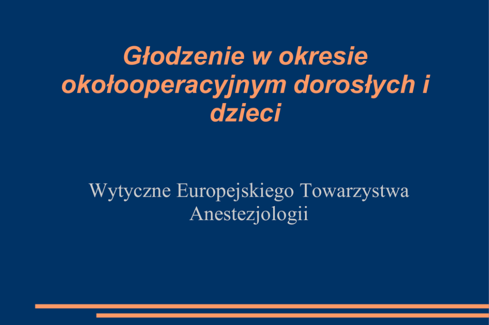 Głodzenie w okresie okołooperacyjnym dorosłych i dzieci Wytyczne Europejskiego Towarzystwa Anestezjologii Dlaczego powstały nowe wytyczne Przegląd aktualnej wiedzy Umożliwienie anestezjologom w całej Europie ujednolicenie i zastosowanie tej wiedzy w codziennej opiece nad pacjentami Czym nowe wytyczne różnią się od poprzednich?? Zawierają badania od 1950 do 2009 roku Klasyfikacja badań na podstawie wiarygodności dowodów Przedstawiają praktyczne wskazówki dotyczące żucia gumy, palenia tytoniu, czy picia płynów zawierających mleko Rozważają bezpieczeństwo i możliwe korzyści wynikające ze stosowania węglowodanów w okresie przedoperacyjnym W jaki sposób powstawały wytyczne??? Przeszukiwanie w elektronicznych bazach danych Klasyfikacja publikacji pod kątem wiarygodności dowodów Zastosowanie systemu punktacji Scottish Intercollegiate Guidelines Network Niektóre ustalenia powstały na podstawie wieloletniego doświadczenia członków grupy Wytyczne ESA zostały opracowane jako zawiadomienie kierowane do członków ESA i innych anestezjologów oraz pracowników opieki zdrowotnej w Europie, jednak ze względu na różne systemy zdrowotne i różnice postępowania w różnych krajach europejskich, nie ma obowiązku ich stosowania. Poziomy wiarygodności dowodów 1++ Wysokiej jakości metaanalizy, systematyczne przeglądy kontrolowanych , randomizowanych badań z bardzo małym ryzykiem błędu 1+ Dobrze prowadzone metaanalizy, systematyczne przeglądy lub RCT z bardzo małym ryzykiem błędu 1- Metaanalizy, systematyczne przeglądy lub RCT z wysokim ryzykiem błędu 2++ Wysokiej jakości systematyczne przeglądy badań porównawczych przypadków lub badań kohortowych 2+ Dobrze prowadzone badania porównawcze przypadków lub kohortowe z małym ryzykiem zakłóceń lub błędów i umiarkowanym prawdopodobieństwem zależności przyczynowej 2- Badania porównawcze przypadków lub badania kohortowe z dużym ryzykiem zakłóceń lub błędów i znaczącym ryzykiem zależności nieprzyczynowej 3 Badania nieanalityczne, np. opisy i serie przypadków 4 Opinie Ekspertów Stopnie zalecenia A Przynajmniej jedna metaanaliza, systematyczny przegląd lub RCT klasyfikowane jako 1++ i mające bezpośrednie zastosowanie w populacji docelowej; lub dowód składający się głównie z badań klasyfikowanych jako 1+, mający bezpośrednie zastosowanie w populacji docelowej i wykazujący ogólną zgodność wyników B Dowód składający się z badań klasyfikowanych jako 2++, mający bezpośrednie zastosowanie w populacji docelowej i wykazujący ogólną zgodność wyników, lub dowód przeniesiony z badań klasyfikowanych jako 1++ lub 1+ C Dowód składający się z badań klasyfikowanych jako 2+, mający bezpośrednie zastosowanie w populacji docelowej i wykazujący ogólną zgodność wyników, lub dowód przeniesiony z badań klasyfikowanych jako 2++ D Poziomy wiarygodności dowodu 3 lub 4 lub dowód przeniesiony z badań klasyfikowanych jako 2+ Jeść albo nie jeść... Okres głodzenia- Płyny Osoby dorosłe i dzieci należy zachęcać do picia klarownych płynów ( w tym wody, klarownych soków oraz herbaty lub kawy bez mleka) do 2 godzin przed planowaną operacją ( w tym przed cięciem cesarskim (1++, A ) Za klarowne płyny uważano również kawe i herbatę z dodatkiem mleka w ilości nieprzekraczającej 1/5 objętości płynu Okres głodzenia- pokarmy stałe Przyjmowanie pokarmów stałych powinno być zabronione u osób dorosłych i dzieci na 6 godzin przed planowaną operacją (1+, A) Niemowlęta powinny być karmione przed operacją w trybie planowym. Mleko kobiece można bezpiecznie podawać do 4 godzin, a sztuczne mieszanki mleczne do 6 godzin przed planowaną operacją. Poza tym płyny klarowne można stosować jak u dorosłych (1++, A) Guma do żucia , słodycze i palenie tytoniu. Nie należy odwoływać lub opóźniać operacji tylko z powodu użycia przez pacjentów gumy do żucia, słodyczy do ssania czy palenia tytoniu bezpośrednio przed wprowadzeniem do znieczulenia (1-, B) Leki Brak jest wystarczających dowodów, aby przed operacją w trybie planowym zalecać rutynowe stosowanie leków zobojętniających kwas żołądkowy, metoklopramidu lub antagonistów receptora H2 u wszystkich pacjentów, z wyjątkiem pacjentek oddziałów położniczych (1++,A) Doustne węglowodany Spożywanie napojów bogatych w węglowodany do 2 godzin przed planowaną operacją jest dla pacjentów bezpieczne (w tym dla chorych na cukrzycę) ,(1++,A) Picie płynów bogatych w węglowodany przed planowaną operacją poprawia subiektywne dobre samopoczucie, zmniejsza uczucie głodu oraz zmniejsza oporność na insulinę w okresie pooperacyjnym (1++,A) Doustne węglowodany c.d. Droga podania??? Doustne czy dożylne?? Rodzaj węglowodanów?? Lepsze samopoczucie pacjentów?? Skrócenie czasu pobytu w szpitalu?? Okołooperacyjny okres głodzenia u dzieci i niemowląt Okołooperacyjny okres głodzenia dzieci i niemowląt Dzieci należy zachęcać do picia płynów klarownych( w tym wody , klarownych soków oraz herbaty lub kawy bez mleka) do 2 godzin przed operacją w trybie planowym (1++, A) Mleko kobiece można bezpiecznie podawać do 4 godzin, a sztuczne mieszanki mleczne do 6 godzin przed planową operacją (1++,A) Około operacyjny okres głodzenia dzieci i niemowląt Opróżnianie żołądka z mleka kobiecego i mieszanek z mleka z hydrolizatem białek serwatkowych następuje szybciej niż z mieszanek z hydrolizatem białek kazeinowych i z mleka krowiego Mleko krowie jak i mleko w proszku uważane są za pokarmy stałe Okołooperacyjny okres głodzenia dzieci i niemowląt Pokarmy stałe – zalecenia takie same jak u zdrowych osób dorosłych Urazy- dzieci po urazie urazie należy traktowac jak pacjenta z pełnym żołądkiem Płyny w okresie pooperacyjnym – przyjmowanie płynów jest zwykle dopuszczalne w ciągu 3 godzin po znieczuleniu Okres głodzenia u pacjentek oddziałów poło
