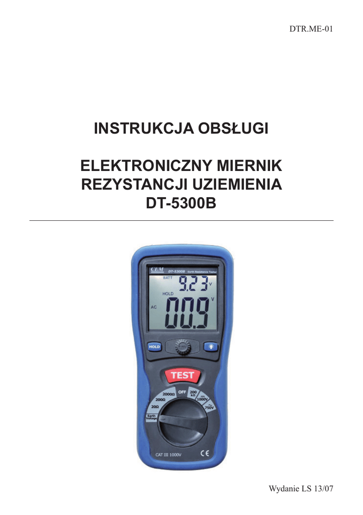 DTR.ME-01 INSTRUKCJA OBSŁUGI ELEKTRONICZNY MIERNIK REZYSTANCJI UZIEMIENIA DT-5300B Wydanie LS 13/07 DTR.ME-01 Elektroniczny miernik rezystancji uziemienia jest nowoczesnym zamiennikiem konwencjonalnego ręcznego miernika. Jest zaprojektowany do pomiaru rezystancji uziemienia, oporności i napięcia. Urządzenie to znajduje szerokie zastosowanie w pomiarze uziemień, instalacji elektrycznych, odgromowych, telekomunikacyjnych i trakcji elektrycznych. UWAGI ODNOŚNIE BEZPIECZEŃSTWA • Przed próbą uruchomienia miernika lub jego serwisowaniem uważnie przeczytaj poniższe informacje dotyczące bezpieczeństwa. • Aby uniknąć uszkodzeń urządzenia postaraj się nie przekraczać maksymalnych wartości, które wykazane są w specyfikacjach technicznych w tabelach. • Nie używaj miernika kiedy przewody pomiarowe wyglądają na zniszczone. Zachowaj szczególną ostrożność kiedy pracujesz na otwartej przestrzeni. • Używaj miernika zgodnie z zaleceniami w instrukcji obsługi; w innym przypadku może doprowadzić to do uszkodzenia miernika. • Przeczytaj wcześniej instrukcję obsługi oraz zachowaj przy pomiarach wszelkie środki ostrożności. • Zachowaj ostrożność przy pracy z napięciem powyżej 60 V DC lub 30 V AC. Takie napięcie może prowadzić do porażenia. • Przed wykonaniem pomiarów rezystancji lub ciągłości przewodów, odłącz badany obwód od jakiegokolwiek źródła zasilania. Bezpieczeństwo Międzynarodowe Znaki Bezpieczeństwa: Symbol ten oznacza konieczność zapoznania się z instrukcja obsługi przed rozpoczęciem pracy z urządzeniem. Symbol ten ostrzega przed porażeniem prądem w przypadku nieprawidłowego użytkowania miernika. 2 Symbol ten oznacza że miernik posiada podwójną izolację ochronną. Limatherm Sensor Sp. z o.o. | tel. 18 337 99 00 | fax: 18 337 99 10 | e-mail:[email protected] DTR.ME-01 OPISY Zakres rezystancji uziemienia: 0÷1000Ω (5300) 0÷2000Ω (5300A) Zakres reyzstancji: 200kΩ Zakres napięć: 750 V AC 1000 V DC Wyświetlacz: duży, LCD, podświetlany Częstotliwość próbkowania 2,5 razy/sek. Regulacja zera - potencjometr 0-ADJ do precyzyjnego zerowania błędu pomiaru wprowadzonego przez przewodypomiarowe. Przekroczenie zakresu - po przekroczeniu zakresu pomiaru na mierniku wyświetlony zostanie symbol „1”. Wskaźnik słabej baterii wyświetlany jest symbol poniżej dopuszczalnej wartości. kiedy napięcie baterii jest Auto wyłączanie zasilania Aby wydłużyć żywotność baterii, miernik automatycznie wyłączy się po około 15 minutach jego nie używania. Aby powrócić do pracy miernika należy pokrętło umieścić w pozycji OFF, a następnie na pożądaną funkcję pomiarową. Temperatura pracy: 0÷40ºC (32÷104)ºF i wilgotność poniżej 80% RH Temperatura przechowywania: -10÷60ºC (14÷140)ºF i wilgotność poniżej 70% RH Zasilanie: 6x1.5 V, rozmiar baterii AA Wymiary: 200x92x50 mm Waga: 700 g wliczając baterie Akcesoria: przewody pomiarowe z wtykami typu banan, sondy pomiarowe szpilkowe, przewody pomiarowe krokodylkowe , 6 szt. baterii, futerał przenośny z paskiem. Limatherm Sensor Sp. z o.o. | tel. 18 337 99 00 | fax: 18 337 99 10 | e-mail:[email protected] 3 DTR.ME-01 SPECYFIKACJA ELEKTRYCZNA Dokładność jest przedstawiana w następujący sposób: ±(…% odczytu +…cyfry) przy 23ºC±5ºC, poniżej 80% RH. Funkcje Zakres Rozdzielczość Dokładność Napięcie DC 1000 V 1V ±0,8% Napięcie AC 750 V 1V ±1,2% 20Ω 0,01Ω ±2,0% 200Ω 0,1Ω ±2,0% Rezystancja uziemienia 2000Ω 1Ω ±2,0% Napięcie ziemi 200 V 0,1 V ±3,0% Rezystancja 200kΩ 0,1kΩ ±1,0% OPIS MIERNIKA 1. Wyświetlacz 2. Przycisk Data Hold 3. Przycisk Lock 4. Przycisk Backlight 5. Przycisk Test 6. Pokrętło do wyboru funkcji 7. Przycisk V Ω E2 8. Przycisk P2 9. Przycisk P1 10. Przycisk COM E1 11. Pokrywa 12. Obudowa baterii 4 Limatherm Sensor Sp. z o.o. | tel. 18 337 99 00 | fax: 18 337 99 10 | e-mail:[email protected] DTR.ME-01 Operowanie przyciskami funkcyjnymi Funkcja Hold Funkcja HOLD ‘’zamraża’’ wartość pomiaru na wyświetlaczu. Naciśnij klawisz HOLD aby aktywować funkcję lub z niej wyjść. Podświetlenie Naciśnij przycisk (podświetlenia) aby włączyć oświetlenie wyświetlacza. Podświetlenie automatycznie wyłączy się po 15 sekundach. POMIAR REZYSTANCJI UZIEMIENIA Pomiar rezystancji uziemienia miernik wykonuje napięciem przemiennym o częstotliwości ok 300 Hz w celu uniknięcia powstania polaryzacji. Zjawisko to może spowodować wytworzenie ogniwa galwanicznego w miejscu styku uziomu z wilgotnym gruntem. Pomiar wykonywany jest metodą techniczną z wykorzystaniem trzech elektrod pomiarowych. W celu zmierzenia rezystancji RE tworzy sie układ obejmujący dwa obwody: – obwód prądowy w skład którego wchodzi badany uziom E, źródło prądu G i elektroda prądowa C, – obwód napięciowy utworzony przez baday uziom E i elektrodę napięciową P Limatherm Sensor Sp. z o.o. | tel. 18 337 99 00 | fax: 18 337 99 10 | e-mail:[email protected] 5 DTR.ME-01 WEJŚCIE POMIAROWE MIERNIKA WEJŒCIA POMIAROWE MIERNIKA A E ~ G P d1 C d2 V ELEKTRODA P ELEKTRODA C BADANY UZIOM (E) Rys. Schemat połączeń miernika przy pomiarze rezystancji uziemienia Na podstawie odczytu wartości prądu uziemionego płynącego między elektrodami E i C, oraz różnicy potencjałów pomiędzy elektrodami E i P miernik oblicza rezystancję uziemienia na podstawie wzoru R=V/IE . Dla zapewnienia prawidłowego pomiaru odległości pomiędzy elektrodami d1 i d2 powinny być równe i wynosić ok 20-30 mb. Przeprowadzenie Pomiaru Przed przystapieniem do pomiaru podłącz wszystkie sondy pomiarowe wg przedstawionego schematu. Przełącznik funkcyjny wstaw na zakres 2000Ω. Następnie naciśnij i przytrzymaj przez cały czas trwania pomiaru przycisk TEST. W pierwszej fazie pomiaru ciągłego sygnał dzwiękowy oznacza przygotowanie obwodu pomiarowego. Na wyświetlaczu pojawia się też ciągła sygnalizacja napięcia na zaciskach pomi