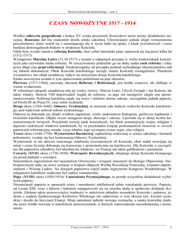 Historia Kościoła Katolickiego – tom 3 CZASY NOWOŻYTNE 1517 - 1914 Wielkie odkrycia geograficzne z końca XV wieku przyniosły Kościołowi nowe tereny działalności misyjnej. Renesans dał mu znakomite dzieła sztuki sakralnej. Chrześcijanie jednak ulegli wzmożonemu pesymizmowi, który rodził się z narastającego zła w życiu ludzi tej epoki, z klęsk żywiołowych i coraz bardziej dostrzegalnych braków w strukturze Kościoła. Nikłe były wyniki starań o reformę Kościoła, choć sobór laterański piąty zajmował się nią przez kilka lat (1512-1517). Wystąpienie Marcina Lutra (31.10.1517) z tezami o odpustach przyjęto w wielu środowiskach kościelnych jako ożywienie ruchu reformy. W rzeczywistości podzieliło go na słaby nadal ruch reformy i silny przez długi czas prąd reformacji. Niedostrzegalny od początku podział zachodniego chrześcijaństwa stał się faktem dokonanym. Obok Kościoła katolickiego zaczęły istnieć Kościoły ewangelickie. Pluralizm wyznaniowy ma odtąd zasadniczy wpływ na nowożytne dzieje Kościoła katolickiego. Epoka nowożytna została w tym opracowaniu podzielona na pięć okresów: Pierwszy (1517-1564), nazwany okresem Reformy i Reformacji, jest krótki czasowo, ale obfituje w ważne wydarzenia. W reformacji odegrali zasadniczą rolę jej wielcy twórcy: Marcin Luter, Ulrych Zwingli i Jan Kalwin, ale także władcy. Henryk VIII doprowadził Anglię do schizmy, za jego zaś następców uległa ona sprotestantyzowaniu. Reformą katolicką zajęły się nowe i niektóre dawne zakony, szczególnie jednak papieże, od Pawła III do Piusa IV, oraz sobór trydencki. Drugi okres (1564-1648): Odnowy Trydenckiej, to nieomal całe stulecie rozkwitu Kościoła katolickiego, pod wpływem uchwał soboru trydenckiego. Odnowa ta dokonała się dzięki wielkim papieżom, wielu znakomitym biskupom, gorliwym kapłanom i świeckim katolikom. Objęła swym zasięgiem misje, diecezje i zakony. Ujawniła się w dużej liczbie kanonizowanych świętych. Przyniosła rozwój nauk kościelnych. Jej blask pomniejszyły wojny religijne i dążności niektórych władców katolickich, by za przykładem książąt protestanckich stosować w swoich państwach reformacyjną zasadę: czyja władza, tego wyznanie (cuius regio, eius religio). Trzeci okres (1648-1758): Wystawności Barokowej, najbardziej widocznej w sztuce sakralnej i formach pobożności, wydaje się być kontynuacją Odnowy Trydenckiej. Wystawność ta nie ukrywa znacznego osłabienia wewnętrznych sił Kościoła, choć nadal rozwijają się misje i coraz liczniej dokonują się konwersje z protestantyzmu na katolicyzm. Dla Kościoła, a szczególnie dla papiestwa szkodliwy był absolutyzm władców, we Francji zaś także gallikanizm i jansenizm. Czwarty (XVII) okres (1758-1850): Wstrząsów Rewolucyjnych, obejmuje dzieje Kościoła broniącego się przed atakami z zewnątrz. Śmiertelnym zagrożeniem był racjonalizm Oświecenia i wrogość masonerii do Bożego Objawienia. Niebezpiecznymi stały się nowe sytuacje w krajach objętych Wielką Rewolucją Francuską, wojnami napoleońskimi i Wiosną Ludów. Na dziejach papiestwa ciążył nadto legitymizm Kongresu Wiedeńskiego. W religijności katolików widoczny był wpływ romantyzmu. Piąty (XVIII) okres (1850-1914): Umocnienia Prymacjalnego, to przede wszystkim działalność wybitnych papieży. Nieomylność papieża w sprawach wiary i moralności zdefiniował sobór watykański pierwszy. Papieże, od Leona XIII, wraz z klerem i laikatem zaangażowali się na szeroką skalą w społeczne działanie Kościoła. Zdołano także przezwyciężyć trudności w należytym układzie stosunków Kościoła i państwa, jedynie z rządem Zjednoczonego Królestwa Włoskiego nie załatwiono w tym okresie tzw. kwestii rzymskiej i doszło do laicyzacji Francji. Misje natomiast nabrały nowego rozmachu, a nauka kościelna znalazła nowe źródło rozwoju w katolickich uniwersytetach, w których wprowadzono neoscholastykę i neotomizm. Czasy nowożytne 1517 – 1914 1 Historia Kościoła Katolickiego – tom 3 Pierwsza wojna światowa (1914-1918) przyniosła zasadnicze zmiany w życiu narodów i państw, a także zmiany w warunkach życia i działalności Kościoła katolickiego. Zaczął się wstępny okres nowej epoki czasów najnowszych. Tom 3 I OKRES 1517 – 1564 REFORMA I REFORMACJA 1. Rozwój misji Wspólne dzieło. Patronat Portugalii. Franciszek Ksawery i Daleki Wschód. Pod berłem hiszpańskim. Obrońcy Indian. Patronat Hiszpanii. 2. Wybuch reformacji Cienie renesansu. Krytycyzm i pesymizm. Optymizm Erazma. Kryzys ekonomiczno-społeczny. Sytuacja polityczna cesarstwa. Teologia i papiestwo. Biskupi i duchowieństwo. Klasztory i świeccy. 3. Luter i Zwingli Marcin Luter. Tezy o odpustach. Dysputy i zwolennicy. Fundamentalne pisma. Zerwanie z Kościołem. Edykt wormacki. Ulrych Zwingli. Reformacja w Zurychu. Dysputy zurychskie. Bazylea i Berno. Wojna i Bullinger. 4. Radykalizm, walki i układy Anabaptyści. Bracia morawscy. Królestwo Boże w Monasterze. Prorocy - Tomasz Műntzer. Radykalne zmiany - Karlstadt. Rycerstwo i wojna chłopska. Książęta i Albrecht Pruski. Reformacja Hesji i Saksonii. Protestanci w Spirze. Augsburskie wyznanie wiary. Odpowiedź papieska. Układy i wojna szmalkadzka. Interim augsburskie. Pokój augsburski. 5. Kalwin, reformacja i władcy Francja przed Kalwinem. Jan Kalwin. Kalwin i Genewa. Nauka Kalwina. Dania, Norwegia, Islandia. Szwecja i Finlandia. Kawalerowie Mieczowi. Król Henryk VIII. Schizma angielska. Krwawy bill i anglikanizm. Maria Tudor i Elżbieta I. Szkocja i Maria Stuart. Francja i hugenoci. Miasta włoskie i reformacja. Hiszpania i Niderlandy. Czechy i Moraw. Węgry i Siedmiogród. 6. Polska i reformacja Humanizm i prymas Łaski. Zygmunt Stary i synody. Zygmunt August i sejmy. Biskupi i legaci. Luteranizm i sekularyzacja biskupstw. Reformacja w Gdańsku. Rozwój luteranizmu. Kalwinizm. Antytrynitaryzm (b