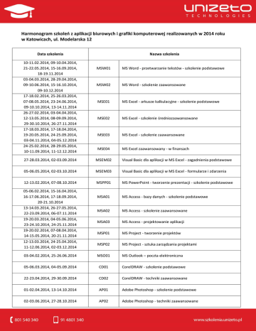 Harmonogram szkoleń z aplikacji biurowych i grafiki komputerowej realizowanych w 2014 roku w Katowicach, ul. Modelarska 12 Data szkolenia 10-11.02.2014, 09-10.04.2014, 21-22.05.2014, 15-16.09.2014, 18-19.11.2014 03-04.03.2014, 28-29.04.2014, 09-10.06.2014, 15-16.10.2014, 09-10.12.2014 17-18.02.2014, 25-26.03.2014, 07-08.05.2014, 23-24.06.2014, 09-10.10.2014, 13-14.11.2014 26-27.02.2014, 03-04.04.2014, 12-13.05.2014, 08-09.09.2014, 29-30.10.2014, 26-27.11.2014 17-18.03.2014, 17-18.04.2014, 19-20.05.2014, 24-25.09.2014, 03-04.11.2014, 04-05.12.2014 24-25.02.2014, 28-29.05.2014, 10-11.09.2014, 11-12.12.2014 Nazwa szkolenia MSW01 MS Word - przetwarzanie tekstów - szkolenie podstawowe MSW02 MS Word - szkolenie zaawansowane MSE01 MS Excel - arkusze kalkulacyjne - szkolenie podstawowe MSE02 MS Excel - szkolenie średniozaawansowane MSE03 MS Excel - szkolenie zaawansowane MSE04 MS Excel zaawansowany - w finansach 27-28.03.2014, 02-03.09.2014 MSEM02 Visual Basic dla aplikacji w MS Excel - zagadnienia podstawowe 05-06.05.2014, 02-03.10.2014 MSEM03 Visual Basic dla aplikacji w MS Excel - formularze i zdarzenia 12-13.02.2014, 07-08.10.2014 MSPP01 MS PowerPoint - tworzenie prezentacji - szkolenie podstawowe MSA01 MS Access - bazy danych - szkolenie podstawowe MSA02 MS Access - szkolenie zaawansowane MSA03 MS Access - projektowanie aplikacji MSP01 MS Project - tworzenie projektów MSP02 MS Project - sztuka zarządzania projektami 03-04.02.2014, 25-26.06.2014 MSO01 MS Outlook – poczta elektroniczna 05-06.03.2014, 04-05.09.2014 CD01 CorelDRAW - szkolenie podstawowe 22-23.04.2014, 29-30.09.2014 CD02 CorelDRAW - techniki zaawansowane 01-02.04.2014, 13-14.10.2014 AP01 Adobe Photoshop - szkolenie podstawowe 02-03.06.2014, 27-28.10.2014 AP02 Adobe Photoshop - techniki zaawansowane 05-06.02.2014, 15-16.04.2014, 16-17.06.2014, 17-18.09.2014, 20-21.10.2014 13-14.03.2014, 26-27.05.2014, 22-23.09.2014, 06-07.11.2014 19-20.03.2014, 04-05.06.2014, 23-24.10.2014, 24-25.11.2014 19-20.02.2014, 07-08.04.2014, 14-15.05.2014, 20-21.11.2014 12-13.03.2014, 24-25.04.2014, 11-12.06.2014, 02-03.12.2014