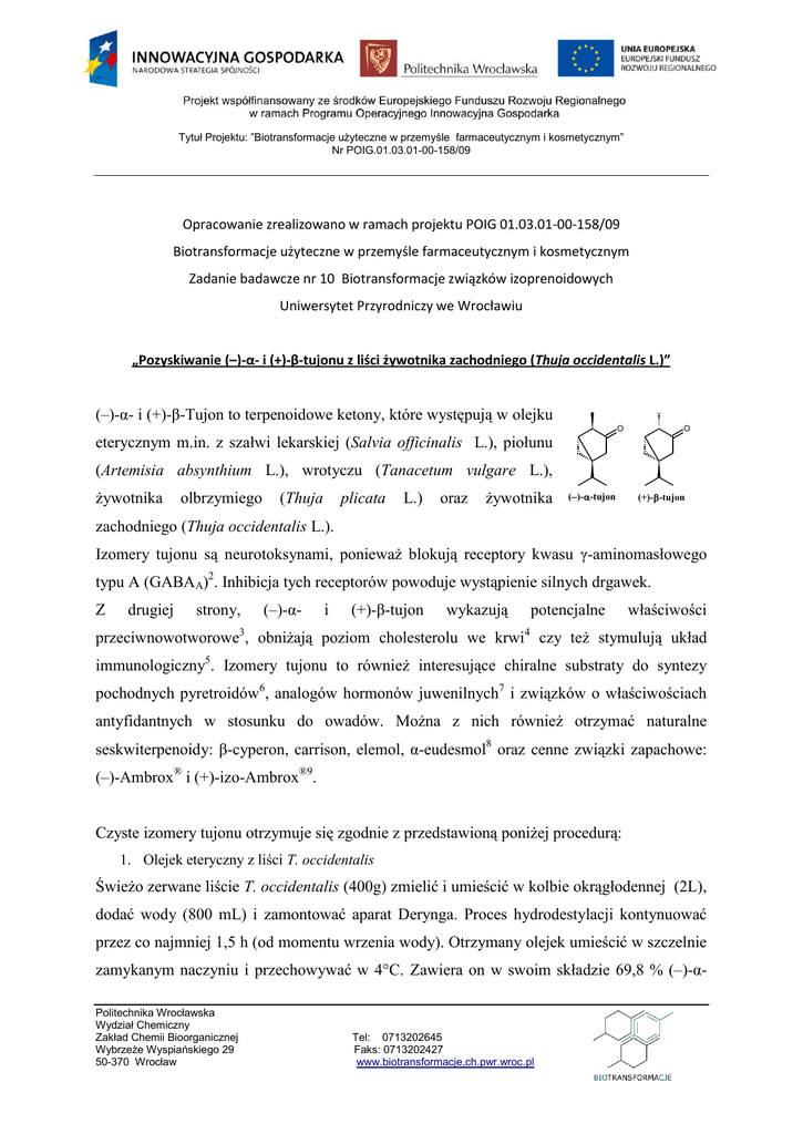 Tytuł Projektu: ”Biotransformacje użyteczne w przemyśle farmaceutycznym i kosmetycznym” Nr POIG.01.03.01-00-158/09 Opracowanie zrealizowano w ramach projektu POIG 01.03.01-00-158/09 Biotransformacje użyteczne w przemyśle farmaceutycznym i kosmetycznym Zadanie badawcze nr 10 Biotransformacje związków izoprenoidowych Uniwersytet Przyrodniczy we Wrocławiu „Pozyskiwanie (–)-α- i (+)-β-tujonu z liści żywotnika zachodniego (Thuja occidentalis L.)” (–)-α- i (+)-β-Tujon to terpenoidowe ketony, które występują w olejku O O eterycznym m.in. z szałwi lekarskiej (Salvia officinalis L.), piołunu (Artemisia absynthium L.), wrotyczu (Tanacetum vulgare L.), żywotnika olbrzymiego (Thuja plicata L.) oraz żywotnika ()--tujon (+)--tujon zachodniego (Thuja occidentalis L.). Izomery tujonu są neurotoksynami, ponieważ blokują receptory kwasu γ-aminomasłowego typu A (GABAA)2. Inhibicja tych receptorów powoduje wystąpienie silnych drgawek. Z drugiej strony, (–)-α- i (+)-β-tujon 3 wykazują potencjalne właściwości 4 przeciwnowotworowe , obniżają poziom cholesterolu we krwi czy też stymulują układ immunologiczny5. Izomery tujonu to również interesujące chiralne substraty do syntezy pochodnych pyretroidów6, analogów hormonów juwenilnych7 i związków o właściwościach antyfidantnych w stosunku do owadów. Można z nich również otrzymać naturalne seskwiterpenoidy: β-cyperon, carrison, elemol, α-eudesmol8 oraz cenne związki zapachowe: (–)-Ambrox® i (+)-izo-Ambrox®9. Czyste izomery tujonu otrzymuje się zgodnie z przedstawioną poniżej procedurą: 1. Olejek eteryczny z liści T. occidentalis Świeżo zerwane liście T. occidentalis (400g) zmielić i umieścić w kolbie okrągłodennej (2L), dodać wody (800 mL) i zamontować aparat Derynga. Proces hydrodestylacji kontynuować przez co najmniej 1,5 h (od momentu wrzenia wody). Otrzymany olejek umieścić w szczelnie zamykanym naczyniu i przechowywać w 4°C. Zawiera on w swoim składzie 69,8 % (–)-αPolitechnika Wrocławska Wydział Chemiczny Zakład Chemii Bioorganicznej Wybrzeże Wyspiańskiego 29 50-370 Wrocław Tel: 0713202645 Faks: 0713202427 www.biotransformacje,ch.pwr.wroc.pl Tytuł Projektu: ”Biotransformacje użyteczne w przemyśle farmaceutycznym i kosmetycznym” Nr POIG.01.03.01-00-158/09 tujonu i 9,5% (+)-β-tujonu. Pozostałe związki to 7,8% fenchon, 2,7% terpinen-4-ol i 2,7% pcymen-8-ol a także 1,4% sabinen. 2. (–)-α-Tujon (–)-α-Tujon wydziela się z surowego olejku eterycznego z T. occidentalis (1,7mL) za pomocą cieczowej chromatografii kolumnowej z żelem krzemionkowym, jako adsorbentem. W trakcie przygotowywania kolumny chromatograficznej zwrócić uwagę, aby masa fazy stacjonarnej w stosunku do masy olejku wynosiła 100:1. (–)-α-Tujon eluować mieszaniną heksan : octan etylu 100:1 (v/v). Za pomocą GC zidentyfikować frakcje, które zawierają czysty (powyżej 96%) (–)-α-tujon. Następnie zatężyć je na wyparce próżniowej, a czysty (–)-α-tujon umieścić w szczelnie zamkniętym, ciemnym naczyniu i przechowywać w temperaturze 4°C 3. (+)-β-Tujon Do surowego olejku eterycznego z T. occidentalis (5 mL) dodać 5% etanolowy roztwór wodorotlenku sodu (3 mL). Mieszaninę pozostawić na wytrząsarce przez 30 minut. Następnie dodać świeżo sporządzony, nasycony roztwór wodorosiarczanu (IV) sodu (15 mL) i wytrząsać w temperaturze pokojowej przez 24 godziny. Powstałe kryształy odsączyć na sączku bibułowym, przemyć niewielką ilością wody i pozostawić do wyschnięcia. Suche kryształy umieścić w kolbie okrągłodennej (250 mL), dodać wody (100 mL) i zamontować aparat Derynga. Proces destylacji kontynuować przez 30 minut od momentu wrzenia wody. Czysty (+)-β-tujon umieścić w szczelnie zamkniętym, ciemnym naczyniu i przechowywać w temperaturze 4°C. Politechnika Wrocławska Wydział Chemiczny Zakład Chemii Bioorganicznej Wybrzeże Wyspiańskiego 29 50-370 Wrocław Tel: 0713202645 Faks: 0713202427 www.biotransformacje,ch.pwr.wroc.pl