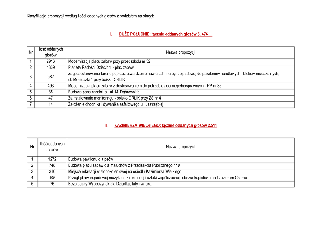 Klasyfikacja propozycji według ilości oddanych głosów z podziałem