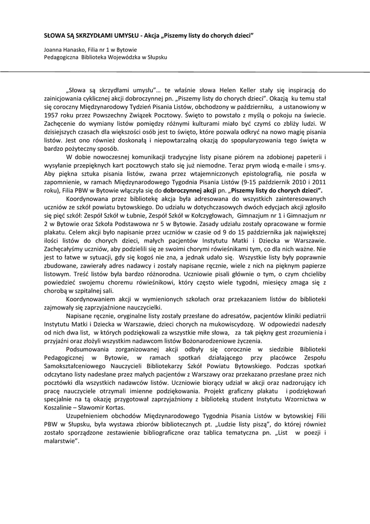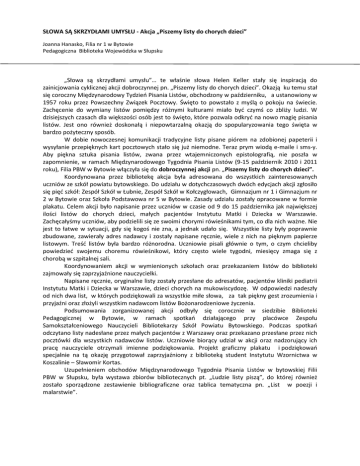 SŁOWA SĄ SKRZYDŁAMI UMYSŁU - Akcja „Piszemy listy do chorych dzieci” Joanna Hanasko, Filia nr 1 w Bytowie Pedagogiczna Biblioteka Wojewódzka w Słupsku „Słowa są skrzydłami umysłu”… te właśnie słowa Helen Keller stały się inspiracją do zainicjowania cyklicznej akcji dobroczynnej pn. „Piszemy listy do chorych dzieci”. Okazją ku temu stał się coroczny Międzynarodowy Tydzień Pisania Listów, obchodzony w październiku, a ustanowiony w 1957 roku przez Powszechny Związek Pocztowy. Święto to powstało z myślą o pokoju na świecie. Zachęcenie do wymiany listów pomiędzy różnymi kulturami miało być czymś co zbliży ludzi. W dzisiejszych czasach dla większości osób jest to święto, które pozwala odkryć na nowo magię pisania listów. Jest ono również doskonałą i niepowtarzalną okazją do spopularyzowania tego święta w bardzo pożyteczny sposób. W dobie nowoczesnej komunikacji tradycyjne listy pisane piórem na zdobionej papeterii i wysyłanie przepięknych kart pocztowych stało się już niemodne. Teraz prym wiodą e-maile i sms-y. Aby piękna sztuka pisania listów, zwana przez wtajemniczonych epistolografią, nie poszła w zapomnienie, w ramach Międzynarodowego Tygodnia Pisania Listów (9-15 październik 2010 i 2011 roku), Filia PBW w Bytowie włączyła się do dobroczynnej akcji pn. „Piszemy listy do chorych dzieci”. Koordynowana przez bibliotekę akcja była adresowana do wszystkich zainteresowanych uczniów ze szkół powiatu bytowskiego. Do udziału w dotychczasowych dwóch edycjach akcji zgłosiło się pięć szkół: Zespół Szkół w Łubnie, Zespół Szkół w Kołczygłowach, Gimnazjum nr 1 i Gimnazjum nr 2 w Bytowie oraz Szkoła Podstawowa nr 5 w Bytowie. Zasady udziału zostały opracowane w formie plakatu. Celem akcji było napisanie przez uczniów w czasie od 9 do 15 października jak największej ilości listów do chorych dzieci, małych pacjentów Instytutu Matki i Dziecka w Warszawie. Zachęcałyśmy uczniów, aby podzielili się ze swoimi chorymi rówieśnikami tym, co dla nich ważne. Nie jest to łatwe w sytuacji, gdy się kogoś nie zna, a jednak udało się. Wszystkie listy były poprawnie zbudowane, zawierały adres nadawcy i zostały napisane ręcznie, wiele z nich na pięknym papierze listowym. Treść listów była bardzo różnorodna. Uczniowie pisali głównie o tym, o czym chcieliby powiedzieć swojemu choremu rówieśnikowi, który często wiele tygodni, miesięcy zmaga się z chorobą w szpitalnej sali. Koordynowaniem akcji w wymienionych szkołach oraz przekazaniem listów do biblioteki zajmowały się zaprzyjaźnione nauczycielki. Napisane ręcznie, oryginalne listy zostały przesłane do adresatów, pacjentów kliniki pediatrii Instytutu Matki i Dziecka w Warszawie, dzieci chorych na mukowiscydozę. W odpowiedzi nadeszły od nich dwa list, w których podziękowali za wszystkie miłe słowa, za tak piękny gest zrozumienia i przyjaźni oraz złożyli wszystkim nadawcom listów Bożonarodzeniowe życzenia. Podsumowania zorganizowanej akcji odbyły się corocznie w siedzibie Biblioteki Pedagogicznej w Bytowie, w ramach spotkań działającego przy placówce Zespołu Samokształceniowego Nauczycieli Bibliotekarzy Szkół Powiatu Bytowskiego. Podczas spotkań odczytano listy nadesłane przez małych pacjentów z Warszawy oraz przekazano przesłane przez nich pocztówki dla wszystkich nadawców listów. Uczniowie biorący udział w akcji oraz nadzorujący ich pracę nauczyciele otrzymali imienne podziękowania. Projekt graficzny plakatu i podziękowań specjalnie na tą okazję przygotował zaprzyjaźniony z biblioteką student Instytutu Wzornictwa w Koszalinie – Sławomir Kortas. Uzupełnieniem obchodów Międzynarodowego Tygodnia Pisania Listów w bytowskiej Filii PBW w Słupsku, była wystawa zbiorów bibliotecznych pt. „Ludzie listy piszą”, do której również zostało sporządzone zestawienie bibliograficzne oraz tablica tematyczna pn. „List w poezji i malarstwie”.