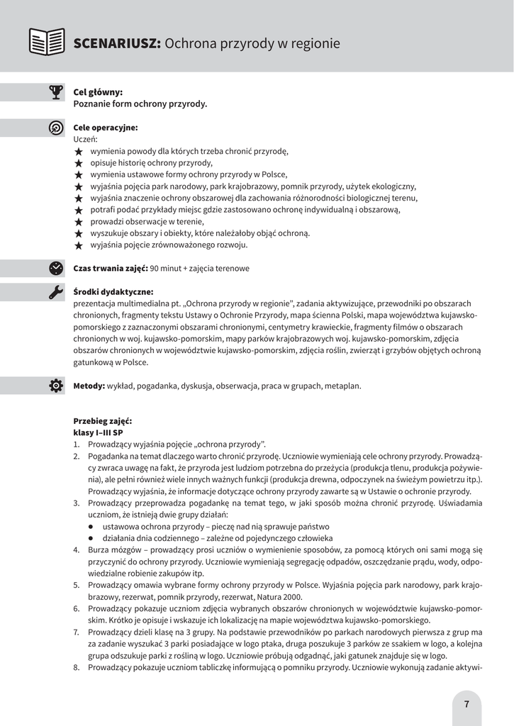 SCENARIUSZ: Ochrona przyrody w regionie Cel główny: Poznanie form ochrony przyrody. Cele operacyjne: Uczeń: wymienia powody dla których trzeba chronić przyrodę, opisuje historię ochrony przyrody, wymienia ustawowe formy ochrony przyrody w Polsce, wyjaśnia pojęcia park narodowy, park krajobrazowy, pomnik przyrody, użytek ekologiczny, wyjaśnia znaczenie ochrony obszarowej dla zachowania różnorodności biologicznej terenu, potrafi podać przykłady miejsc gdzie zastosowano ochronę indywidualną i obszarową, prowadzi obserwacje w terenie, wyszukuje obszary i obiekty, które należałoby objąć ochroną. wyjaśnia pojęcie zrównoważonego rozwoju. 77 77 77 77 77 77 77 77 77 Czas trwania zajęć: 90 minut + zajęcia terenowe Środki dydaktyczne: prezentacja multimedialna pt. „Ochrona przyrody w regionie”, zadania aktywizujące, przewodniki po obszarach chronionych, fragmenty tekstu Ustawy o Ochronie Przyrody, mapa ścienna Polski, mapa województwa kujawskopomorskiego z zaznaczonymi obszarami chronionymi, centymetry krawieckie, fragmenty filmów o obszarach chronionych w woj. kujawsko-pomorskim, mapy parków krajobrazowych woj. kujawsko-pomorskim, zdjęcia obszarów chronionych w województwie kujawsko-pomorskim, zdjęcia roślin, zwierząt i grzybów objętych ochroną gatunkową w Polsce. Metody: wykład, pogadanka, dyskusja, obserwacja, praca w grupach, metaplan. Przebieg zajęć: klasy I–III SP 1. Prowadzący wyjaśnia pojęcie „ochrona przyrody”. 2. Pogadanka na temat dlaczego warto chronić przyrodę. Uczniowie wymieniają cele ochrony przyrody. Prowadzący zwraca uwagę na fakt, że przyroda jest ludziom potrzebna do przeżycia (produkcja tlenu, produkcja pożywienia), ale pełni również wiele innych ważnych funkcji (produkcja drewna, odpoczynek na świeżym powietrzu itp.). Prowadzący wyjaśnia, że informacje dotyczące ochrony przyrody zawarte są w Ustawie o ochronie przyrody. 3. Prowadzący przeprowadza pogadankę na temat tego, w jaki sposób można chronić przyrodę. Uświadamia uczniom, że istnieją dwie grupy działań: ustawowa ochrona przyrody – pieczę nad nią sprawuje państwo działania dnia codziennego – zależne od pojedynczego człowieka 4. Burza mózgów – prowadzący prosi uczniów o wymienienie sposobów, za pomocą których oni sami mogą się przyczynić do ochrony przyrody. Uczniowie wymieniają segregację odpadów, oszczędzanie prądu, wody, odpowiedzialne robienie zakupów itp. 5. Prowadzący omawia wybrane formy ochrony przyrody w Polsce. Wyjaśnia pojęcia park narodowy, park krajobrazowy, rezerwat, pomnik przyrody, rezerwat, Natura 2000. 6. Prowadzący pokazuje uczniom zdjęcia wybranych obszarów chronionych w województwie kujawsko-pomorskim. Krótko je opisuje i wskazuje ich lokalizację na mapie województwa kujawsko-pomorskiego. 7. Prowadzący dzieli klasę na 3 grupy. Na podstawie przewodników po parkach narodowych pierwsza z grup ma za zadanie wyszukać 3 parki posiadające w logo ptaka, druga poszukuje 3 parków ze ssakiem w logo, a kolejna grupa odszukuje parki z rośliną w logo. Uczniowie próbują odgadnąć, jaki gatunek znajduje się w logo. 8. Prowadzący pokazuje uczniom tabliczkę informującą o pomniku przyrody. Uczniowie wykonują zadanie aktywi- •• •• 7 SCENARIUSZ: Ochrona przyrody w regionie zujące nr 1A „Tabliczka – pomnik przyrody” oraz wykonuje zdanie nr 3 w karcie pracy. 9. Prowadzący przypina do tablicy zdjęcia roślin, zwierząt i grzybów. Uczniowie mają za zadanie podzielić je gatunki objęte ochroną gatunkową w Polsce i gatunki niechronione. 10. W celu utrwalenia wiadomości o formach ochrony przyrody prowadzący dzieli klasę na grupy. Każda z nich losuje karteczkę z hasłem – jedną z form ochrony przyrody (park narodowy, park krajobrazowy, rezerwat, pomnik przyrody, rezerwat, Natura 2000) i po naradzie podaje jej objaśnienie. Jeśli uczniowie mają problem z odpowiedzią, mogą zdobyć podpowiedź. Uczniowie z grupy zamykają oczy, a pozostałe dzieci ukrywają podpowiedź. Następnie grupa szuka podpowiedzi na zasadzie zabawy w ciepło/zimno, a na koniec prezentuje reszcie klasy wyjaśnienie pojęcia. 11. Prowadzący uświadamia uczniom, że ochrona przyrody, mimo odgórnie ustalonych reguł, nie jest czymś stałym i niezmiennym. Nawet pojedynczy człowiek ma wpływ na to, jak w Polsce chroniona jest przyroda – np. może składać wnioski o uznanie starych, grubych drzew pomnikami przyrody. 12. Prowadzący przygotowuje grupę do wyjścia w teren. Jeżeli w pobliżu szkoły znajdują się jakieś formy ochrony przyrody, należy uwzględnić je przy planowaniu trasy wycieczki. Po dojściu do obiektu (pomnika przyrody, rezerwatu itp.) uczniowie opowiadają, co wyróżnia ten obiekt z otoczenia: wielkość, wiek, gatunek, stan, bogactwo gatunkowe. 13. Podczas wyjścia terenowego prowadzący zwraca uwagę uczniów na elementy krajobrazu, które są dziełem człowieka i naturalne. Prowadzi pogadankę nt. najcenniejszych, z punktu widzenia uczniów, elementów środowiska. Powinny pojawić się odpowiedzi: drzewa – bo produkują tlen i dają schronienie zwierzętom, woda – w której żyją ryby, piją ją zwierzęta i ludzie, czyste powietrze – którym oddychamy. 14. Prowadzący opisuje zagrożenia przyrody, podkreślając te, których przejawy są widoczne na danym obszarze: spływ nawozów sztucznych i pestycydów z pól, rozbudowa osiedli i dróg, zaśmiecanie lasów. 15. Prowadzący zachęca uczniów do poszukiwania i wytypowania własnych pomników przyrody. Wyjaśnia uczniom, w jaki sposób można przyczynić się do objęcia obiektu ochroną – informacje o takim obiekcie należy przesłać do Urzędu Gminy. Uczniowie w czasie wędrówki w terenie wyszukują drzewa, które mogłyby zostać pomnikami przyrody. Uczniowie uzupełniają zadanie nr 1 w karcie pracy. 16. Prowadzący wyjaśnia, jakie obiekty mogą zostać uznane za pomnik przyrody. Uczn