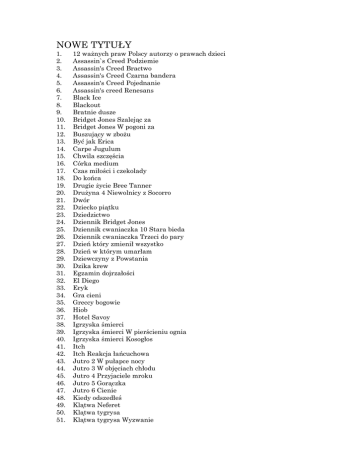 NOWE TYTUŁY 1. 2. 3. 4. 5. 6. 7. 8. 9. 10. 11. 12. 13. 14. 15. 16. 17. 18. 19. 20. 21. 22. 23. 24. 25. 26. 27. 28. 29. 30. 31. 32. 33. 34. 35. 36. 37. 38. 39. 40. 41. 42. 43. 44. 45. 46. 47. 48. 49. 50. 51. 12 ważnych praw Polscy autorzy o prawach dzieci Assassin`s Creed Podziemie Assassin's Creed Bractwo Assassin's Creed Czarna bandera Assassin's Creed Pojednanie Assassin's creed Renesans Black Ice Blackout Bratnie dusze Bridget Jones Szalejąc za Bridget Jones W pogoni za Buszujący w zbożu Być jak Erica Carpe Jugulum Chwila szczęścia Córka medium Czas miłości i czekolady Do końca Drugie życie Bree Tanner Drużyna 4 Niewolnicy z Socorro Dwór Dziecko piątku Dziedzictwo Dziennik Bridget Jones Dziennik cwaniaczka 10 Stara bieda Dziennik cwaniaczka Trzeci do pary Dzień który zmienił wszystko Dzień w którym umarłam Dziewczyny z Powstania Dzika krew Egzamin dojrzałości El Diego Eryk Gra cieni Greccy bogowie Hiob Hotel Savoy Igrzyska śmierci Igrzyska śmierci W pierścieniu ognia Igrzyska śmierci Kosogłos Itch Itch Reakcja łańcuchowa Jutro 2 W pułapce nocy Jutro 3 W objęciach chłodu Jutro 4 Przyjaciele mroku Jutro 5 Gorączka Jutro 6 Cienie Kiedy odszedłeś Klątwa Neferet Klątwa tygrysa Klątwa tygrysa Wyzwanie 52. 53. 54. 55. 56. 57. 58. 59. 60. 61. 62. 63. 64. 65. 66. 67. 68. 69. 70. 71. 72. 73. 74. 75. 76. 77. 78. 79. 80. 81. 82. 83. 84. 85. 86. 87. 88. 89. 90. 91. 92. 93. 94. 95. 96. 97. 98. 99. 100. 101. 102. 103. Kredens pod Grunwaldem Krew z krwi Kroniki Nicka Niezwyciężony Królowa i faworytka Ksenocyd Kuszona Lek na śmierć Love Rosie Malfetto Drużyna Róży Mara Dyer Zemsta Metro 2034 Metro 2035 Miasto 44 Miecz Shannary Morze potworów Mówca umarłych Na glinianych nogach Never Never Niebezpieczna misja Niebo istnieje naprawdę Nienasycony Robert Lewandowski Niewypowiedziana t.3 Niezłomni Niuch Ocalona Ochotnik O rotmistrzu Witoldzie Pileckim Okup Opowieści z Narnii komplet Origami kwiaty z papieru Origami składam Ozdoby z filcu Pakiet Riordan Percy Jackson Pamiętnik nastolatki 10 Julia III Pamiętnik Nastolatki 11 Julia IV Pamiętnik nastolatki 12 Julia V Pamiętnik nastolatki 2 Pamiętnik nastolatki 2 1/2 Wakacje Pamiętnik nastolatki 3 Pamiętnik nastolatki 4 Pamiętnik nastolatki 5 Pamiętnik nastolatki 6 Pamiętnik nastolatki 7 Pamiętnik nastolatki 8 Pamiętnik nastolatki 9 Pamiętnik Nastolatki Tajemnica Jacoba Pamiętniki wampirów Mrok Pamiętniki wampirów Przebudzenie Pele autobiografia Piękne ciało włosy makijaż Ponura drużyna Miecz Północy Potęga miłości Prawdziwa krew 104. 105. 106. 107. 108. 109. 110. 111. 112. 113. 114. 115. 116. 117. 118. 119. 120. 121. 122. 123. 124. 125. 126. 127. 128. 129. 130. 131. 132. 133. 134. 135. 136. 137. 138. 139. 140. 141. 142. 143. 144. 145. 146. 147. 148. 149. 150. 151. 152. 153. 154. 155. Próby ognia Przed świtem Przeznaczona Red Lipstick Monster Tajniki makijażu Rywalki t.1 Rywalki t.5 Korona Saga Ognia i Wody Saga Ognia i Wody Gniewna Saga Ognia i Wody Pomyślne wiatry Saga Ognia i Wody Wielki Spalona Star Wars Przebudzenie mocy Stowarzyszenie umarłych poetów Szukając Alaski Ślubowanie Lenobii Śpiący Książę Świat dysku Para w ruch Świat dysku Piąty elefant Świat dysku Piekło pocztowe Świat dysku Piramidy Świat dysku Potworny regiment Świat dysku Prawda Świat dysku Równoumagicznienie Świat dysku Straż nocna Świat dysku Straż Straż Świat dysku Świat finansjery Świat dysku W północ się odzieję Świat dysku Wolni Ciut ludzie Świat dysku Zadziwiający Maurycy i jego edukowane gryzonie Świat dysku Zbrojni Świat dysku Zimistrz Tajemnica Abigel Tam gdzie spadają Anioły Tam gdzie Ty Taniec ze smokami t.2 Tylko ciebie chcę Tylko ty Ucieczka Ujawniona Dom Nocy 11 Ukryta Dom nocy Ulysses Moore Statek czas Upadek Kalony W śnieżną noc Wieczna t.2 Wieczna tęsknota Wierna Will Grayson Will Grayson Wnuczka do orzechów Wojna pod pękniętym niebem Www.1939.com.pl Wybacz ale będę Ci mówiła skarbie Wybrana 156. 157. 158. 159. 160. 161. 162. 163. 164. 165. 166. 167. 168. 169. Wybrana o zmroku Wyzwolona Dom nocy Zakręty losu Zakręty losu Braterstwo Zakręty losu Historia Luk Zanim się pojawiłeś Zanim umrę Zanim zasnę Zła dziewczyna Złodziej Pioruna Zmierzch Życie i śmierć Zwiadowcy Wczesne lata Żelazna wojna