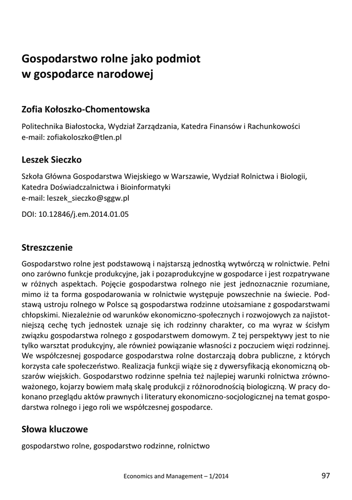Gospodarstwo rolne jako podmiot w gospodarce narodowej Zofia Kołoszko-Chomentowska Politechnika Białostocka, Wydział Zarządzania, Katedra Finansów i Rachunkowości e-mail: [email protected] Leszek Sieczko Szkoła Główna Gospodarstwa Wiejskiego w Warszawie, Wydział Rolnictwa i Biologii, Katedra Doświadczalnictwa i Bioinformatyki e-mail: [email protected] DOI: 10.12846/j.em.2014.01.05 Streszczenie Gospodarstwo rolne jest podstawową i najstarszą jednostką wytwórczą w rolnictwie. Pełni ono zarówno funkcje produkcyjne, jak i pozaprodukcyjne w gospodarce i jest rozpatrywane w różnych aspektach. Pojęcie gospodarstwa rolnego nie jest jednoznacznie rozumiane, mimo iż ta forma gospodarowania w rolnictwie występuje powszechnie na świecie. Podstawą ustroju rolnego w Polsce są gospodarstwa rodzinne utożsamiane z gospodarstwami chłopskimi. Niezależnie od warunków ekonomiczno-społecznych i rozwojowych za najistotniejszą cechę tych jednostek uznaje się ich rodzinny charakter, co ma wyraz w ścisłym związku gospodarstwa rolnego z gospodarstwem domowym. Z tej perspektywy jest to nie tylko warsztat produkcyjny, ale również powiązanie własności z poczuciem więzi rodzinnej. We współczesnej gospodarce gospodarstwa rolne dostarczają dobra publiczne, z których korzysta całe społeczeństwo. Realizacja funkcji wiąże się z dywersyfikacją ekonomiczną obszarów wiejskich. Gospodarstwo rodzinne spełnia też najlepiej warunki rolnictwa zrównoważonego, kojarzy bowiem małą skalę produkcji z różnorodnością biologiczną. W pracy dokonano przeglądu aktów prawnych i literatury ekonomiczno-socjologicznej na temat gospodarstwa rolnego i jego roli we współczesnej gospodarce. Słowa kluczowe gospodarstwo rolne, gospodarstwo rodzinne, rolnictwo Economics and Management – 1/2014 97 Zofia Kołoszko-Chomentowska, Leszek Sieczko Wstęp Gospodarstwo rolne jest podstawową jednostką wytwórczą w rolnictwie i należy do zasadniczych pojęć ekonomiki rolnictwa. Pojęcie to można rozpatrywać w różnych aspektach. Definicje gospodarstwa rolnego są bardzo zróżnicowane, w użyciu jest wiele terminów związanych z gospodarstwem rolnym, które nie zawsze są jednoznacznie rozumiane. Ta różnorodność terminologiczna wynika ze specyfiki tych podmiotów i funkcji, jakie pełnią w gospodarce. Podstawą ustroju rolnego w Polsce są gospodarstwa rodzinne, co jest usankcjonowane zapisem w art. 23 Konstytucji Rzeczypospolitej Polski z 1997 roku. Za najistotniejszą cechę tych podmiotów uznaje się ścisły związek gospodarstwa rolnego z gospodarstwem domowym, powiązanie własności z poczuciem więzi rodzinnej. Gospodarstwa rolne są miejscem pracy dla 2304 tysięcy osób (Raport…, 2011). Ludność związana z gospodarstwem rolnym stanowi więc znaczącą grupę zawodową. Wraz z rozwojem społeczno-ekonomicznym zmienia się rola gospodarstw rolnych w gospodarce. Jako jednostka gospodarcza o coraz większych powiązaniach z otoczeniem zewnętrznym zatraca swój pierwotny charakter, ulega ciągłym zmianom odpowiednio do warunków otoczenia, chociaż rolnictwo naturalne jest nadal obecne. Zmienia się też jego postrzeganie społeczne, wzrastają oczekiwania odnośnie bezpieczeństwa żywnościowego i ochrony zasobów naturalnych. Szczególne wyzwania dla tych podmiotów wynikają z uczestnictwa w strukturach europejskich i procesie globalizacji. Wiąże się to z kształtem Wspólnej Polityki Rolnej i polityki spójności. Dotychczas rolnictwo było kojarzone wyłącznie z funkcją produkcyjną, obecnie coraz częściej spełnia funkcję usługową wobec ludności i środowiska. Realizacja tych funkcji wiąże się z dywersyfikacją ekonomiczną obszarów wiejskich. Gospodarstwa rolne są często przedmiotem nie zawsze pozbawionych emocji dyskusji, zwłaszcza w kontekście pomocy publicznej skierowanej do tego sektora. Wydaje się jednak, że należy zgodzić się z opinią, że kwestia gospodarstw rolnych jest sprawą całego społeczeństwa, a nie tylko rolników i ich rodzin. Podmioty te stanowią bowiem podstawę gospodarki żywnościowej kraju. Z tego punktu widzenia problematyka gospodarstw rolnych jest ciągle aktualna i powinna być podejmowania i upowszechniana nie tylko w środowisku ściśle związanym z tym działem gospodarki. W pracy dokonano przeglądu aktów prawnych i literatury ekonomiczno-socjologicznej na temat gospodarstwa rolnego i jego roli, jaką pełni we współczesnej gospodarce. Na podstawie dokonanej analizy przedstawiono wnioski dotyczące konsekwencji stosowania różnej terminologii związanej z tym podmiotem. 98 Economics and Management – 1/2014 Gospodarstwo rolne jako podmiot w gospodarce narodowej 1. Prawne aspekty gospodarstwa rolnego Gospodarstwo rolne1 może występować w trzech znaczeniach: jako samodzielne gospodarstwo rodzinne nastawione na wytwarzanie produktów rolniczych; gospodarstwo niesamodzielne, które stanowi część większej organizacji zwanej przedsiębiorstwem rolniczym; gospodarstwo samodzielne będące jednocześnie przedsiębiorstwem jednozakładowym (Ziętara, 2008). Potoczne rozumienie gospodarstwa rolnego oznacza zarówno gospodarstwo rodzinne, jak i przyzagrodowe, spółdzielcze, doświadczalne (Encyklopedia…, 1984). W aspekcie prawnym nie ma jednolitego stanowiska w tej kwestii. Konstrukcje i definicje gospodarstwa rolnego były i są zróżnicowane w zależności od celów i potrzeb danej regulacji prawnej, która posługuje się pojęciem gospodarstwa rolnego (Czechowski i in., 1999). Według Kodeksu cywilnego (Dz. U. z 1964 r., nr 16, poz. 93) za gospodarstwo rolne uważa się grunty rolne wraz z gruntami leśnymi, budynkami lub ich częściami, urządzeniami i inwentarzem, jeżeli stanowią lub mogą stanowić zorganizowaną całość gospodarczą oraz prawami związanymi z prowadzeniem gospodarstwa rolnego. Mimo że, w tej definicji gospodarstwa nie ma kryterium obszarowego, to jednak dla cel