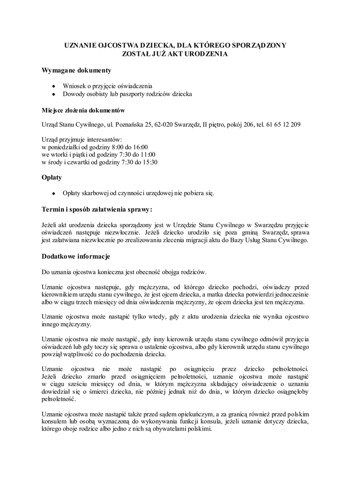 UZNANIE OJCOSTWA DZIECKA, DLA KTÓREGO SPORZĄDZONY ZOSTAŁ JUŻ AKT URODZENIA Wymagane dokumenty Wniosek o przyjęcie oświadczenia Dowody osobisty lub paszporty rodziców dziecka Miejsce złożenia dokumentów Urząd Stanu Cywilnego, ul. Poznańska 25, 62-020 Swarzędz, II piętro, pokój 206, tel. 61 65 12 209 Urząd przyjmuje interesantów: w poniedziałki od godziny 8:00 do 16:00 we wtorki i piątki od godziny 7:30 do 11:00 w środy i czwartki od godziny 7:30 do 15:30 Opłaty Opłaty skarbowej od czynności urzędowej nie pobiera się. Termin i sposób załatwienia sprawy: Jeżeli akt urodzenia dziecka sporządzony jest w Urzędzie Stanu Cywilnego w Swarzędzu przyjęcie oświadczeń następuje niezwłocznie. Jeżeli dziecko urodziło się poza gminą Swarzędz, sprawa jest załatwiana niezwłocznie po zrealizowaniu zlecenia migracji aktu do Bazy Usług Stanu Cywilnego. Dodatkowe informacje Do uznania ojcostwa konieczna jest obecność obojga rodziców. Uznanie ojcostwa następuje, gdy mężczyzna, od którego dziecko pochodzi, oświadczy przed kierownikiem urzędu stanu cywilnego, że jest ojcem dziecka, a matka dziecka potwierdzi jednocześnie albo w ciągu trzech miesięcy od dnia oświadczenia mężczyzny, że ojcem dziecka jest ten mężczyzna. Uznanie ojcostwa może nastąpić tylko wtedy, gdy z aktu urodzenia dziecka nie wynika ojcostwo innego mężczyzny. Uznanie ojcostwa nie może nastąpić , gdy inny kierownik urzędu stanu cywilnego odmówił przyjęcia oświadczeń lub gdy toczy się sprawa o ustalenie ojcostwa, albo gdy kierownik urzędu stanu cywilnego powziął wątpliwość co do pochodzenia dziecka. Uznanie ojcostwa nie może nastąpić po osiągnięciu przez dziecko pełnoletności. Jeżeli dziecko zmarło przed osiągnięciem pełnoletności, uznanie ojcostwa może nastąpić w ciągu sześciu miesięcy od dnia, w którym mężczyzna składający oświadczenie o uznaniu dowiedział się o śmierci dziecka, nie później jednak niż do dnia, w którym dziecko osiągnęłoby pełnoletność. Uznanie ojcostwa może nastąpić także przed sądem opiekuńczym, a za granicą również przed polskim konsulem lub osobą wyznaczoną do wykonywania funkcji konsula, jeżeli uznanie dotyczy dziecka, którego oboje rodzice albo jedno z nich są obywatelami polskimi. Jeżeli biologiczny ojciec dziecka jest niepełnoletni, ale ukończył szesnaście lat może złożyć oświadczenie konieczne do uznania ojcostwa tylko przed sądem opiekuńczym. Dziecko, które ukończyło 13 lat musi wyrazić zgodę na zmianę nazwiska przy uznaniu ojcostwa. W przypadku składania oświadczeń przez cudzoziemców, którzy nie władają biegle językiem polskim wymagana jest obecność tłumacza przysięgłego. Zgodnie z art. 62 ustawy z dnia 25 lutego 1964 r. Kodeks rodzinny i opiekuńczy: § 1. Jeżeli dziecko urodziło się w czasie trwania małżeństwa albo przed upływem trzystu dni od jego ustania lub unieważnienia, domniemywa się, że pochodzi ono od męża matki. Domniemania tego nie stosuje się, jeżeli dziecko urodziło się po upływie trzystu dni od orzeczenia separacji. § 2. Jeżeli dziecko urodziło się przed upływem trzystu dni od ustania lub unieważnienia małżeństwa, lecz po zawarciu przez matkę drugiego małżeństwa, domniemywa się, że pochodzi ono od drugiego męża. § 3. Domniemania powyższe mogą być obalone tylko na skutek powództwa o zaprzeczenie ojcostwa. Jeżeli kierownik urzędu stanu cywilnego odmawia przyjęcia oświadczeń koniecznych do uznania ojcostwa, nie później niż w terminie 7 dni na piśmie powiadamia mężczyznę, który twierdzi, że jest ojcem dziecka i matkę dziecka o przyczynach odmowy i możliwości uznania ojcostwa przed sądem opiekuńczym. Podstawa prawna: Ustawa z dnia 25 lutego 1964 r. Kodeks rodzinny i opiekuńczy (tekst jednolity Dz. U. z 2015 r. poz. 583 z późn. zm.)