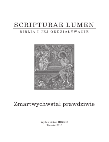 SCRIPTURAE LUMEN BIBLIA I JEJ ODDZIAŁYWANIE Zmartwychwstał prawdziwie Wydawnictwo BIBLOS Tarnów 2010 SCRIPTURAE LUMEN Spis treści Od Redakcji ....................................................................................... 5 „Pan rzeczywiście zmartwychwstał!” (Łk 24,34) Zarys problematyki ................................................................... 7 SCRIPTURAE KS. TADEUSZ BRZEGOWY, Zapowiedź zmartwychwstania w Iz 26,19 ................................ 17 Prediction of Resurrection in Isaiah 26,19 ..................................... 43 KS. RYSZARD RUMIANEK, Co przedstawia wizja ożywionych kości Ez 37,1-14? .................... 45 What Does The Vision of Revived Bones Present (Ez 37,1-14)? .... 63 KS. MAREK PARCHEM, Motyw zmartwychwstania w Księdze Daniela (Dn 12,2) ........ 65 The Motif of Resurrection in the Book of Daniel (Dan 12,2) .......... 77 KS. JANUSZ NAWROT, Czy w 2 Mch jest mowa o zmartwychwstaniu? ........................ 79 Is the I Macc Telling about Resurrection? ...................................... 95 630 Spis treści KS. BOGDAN PONIŻY, Nagroda dla sprawiedliwych według Księgi Mądrości: nieśmiertelność czy zmartwychwstanie? .................................. 97 Reward for the Just According to the Book of Wisdom: Immortality or Resurrection? ................................................... 122 KS. ANTONI TRONINA, „Redemptor meus vivat et in novissimo de terra surrecturus sim”. Z dziejów egzegezy Hi 19,25 ........................ 125 „Redemptor meus vivat et in novissimo de terra surrecturus sim”. History of Exegesis Hi 19,25 ...................... 136 KS. GRZEGORZ M. BARAN, Los człowieka po śmierci w wierzeniach ludów ościennych dawnego Izraela ........................................... 137 The Beliefs of Ancient Israel’s Neighbouring Nations on Life After Death ...................................................... 159 KS. FRANCISZEK MICKIEWICZ SAC, Objawienie się Chrystusa zmartwychwstałego uczniom w Łk 24,36-49 ............................................................................. 161 L’apparizione di Gesù nel Cenacolo (Lc 24,36-49) .......................... 178 KS. PIOTR ŁABUDA, Mateuszowy przekaz o zmartwychwstaniu Chrystusa (Mt 27,57-28,20). Spotkania ze Zmartwychwstałym ................ 179 Matthew’s Account of Christ’s Resurrection (Mt 27,57-28,20) ....... 197 KS. ROMAN BARTNICKI, Orędzie perykopy Marka o pustym grobie (Mk 16,1-8) w świetle analizy narracyjnej Helmuta Merkleina ................. 199 The Message of Mark’s Empty Tomb Pericope (Mk 16,1-8) in the Light of Helmut Merklein’s Narrative Analysis ........... 213 O. ADAM R. SIKORA OFM, Świadkowie pustego grobu w Czwartej Ewangelii .................. 215 Witnesses of the Empty Tomb in the Fourth Gospel ...................... 230 Spis treści 631 KS. MARIUSZ ROSIK, „Dlaczego twierdzą niektórzy z was, że nie ma zmartwychwstania?” (1 Kor 15,12b). Przyczyny odrzucenia wiary w zmartwychwstanie w Kościele korynckim ................. 233 „How Can Some of You Be Saying that there Is no Resurrection of the Dead?” (1Cor 15:12b). Why Some of the Corinthians Rejected Belief in Resurrection of the Dead? ........................... 246 KS. WALDEMAR RAKOCY CM, Spotkanie Szawła z Tarsu ze zmartwychwstałym Panem ...... 247 Saul from Tarsus Meets the Risen Christ ........................................ 262 MICHAŁ WOJCIECHOWSKI, Zmartwychwstanie w Apokalipsie św. Jana ............................ 263 Resurrection in the Revelation of John ........................................... 273 KS. KRZYSZTOF BARDSKI, Starotestamentalna typologia zmartwychwstania .................. 275 Resurrection Typology in the Old Testament ................................. 282 KS. ANTONI PACIOREK, Nowotestamentalne orędzie o zmartwychwstaniu Jezusa w interpretacji X. Léon-Dufoura ............................................... 283 New Testament Proclamation of Jesus’ Resurrection in X. Léon-Dufour’s Interpretation ........................................... 305 LUMEN O. BOGUSŁAW KOCHANIEWICZ OP, Zmartwychwstanie Chrystusa w kazaniach De resurrectione Domini św. Piotra Chryzologa ...................... 307 The Resurrection of Christ in the Sermous De resurrectione Domini by St. Peter Chrysologus .................. 325 KS. KRZYSZTOF GÓŹDŹ, Zmartwychwstanie Jezusa Chrystusa jako wydarzenie rzeczywiste ..................................................... 327 Die Auferstehung Jesu Christi als ein reales Geschehen .............. 337 632 Spis treści KS. MARIAN RUSECKI, Pusty grób znakiem zmartwychwstania .................................. 339 Empty Tomb as a Sign of Resurrection of Christ ........................... 345 KS. JANUSZ KRÓLIKOWSKI, Zmartwychwstanie Jezusa Chrystusa zapowiedzią przyszłości Kościoła .............................................. 347 La risurrezione di Gesù Cristo come anticipazione dell’avvernire della Chiesa ........................................................ 364 KS. JACENTY MASTEJ, Zmartwychwstanie Jezusa Chrystusa jako objawienie i zbawienie człowieka oraz świata ............................................ 367 Resurrection as a Revelation and Salvation of Man and the World ........................................ 380 KS. SŁAWOMIR NOWOSAD, Etyka powielkanocna ................................................................ 381 Ethics after Easter ........................................................................... 398 KS. CZESŁAW KRAKOWIAK, Świętowanie zmartwychwstania Pańskiego ............................ 399 Celebration of Resurrection ............................................................. 413 KS. STANISŁAW DYK, Zmartwychwstanie Jezusa Chrystusa jako fundament i treść przepowiadania homilijnego .......................................... 415 „The Resurrection as the Basis and Content of Homiletic Preaching” ....................................... 432 O. STANISŁAW T.