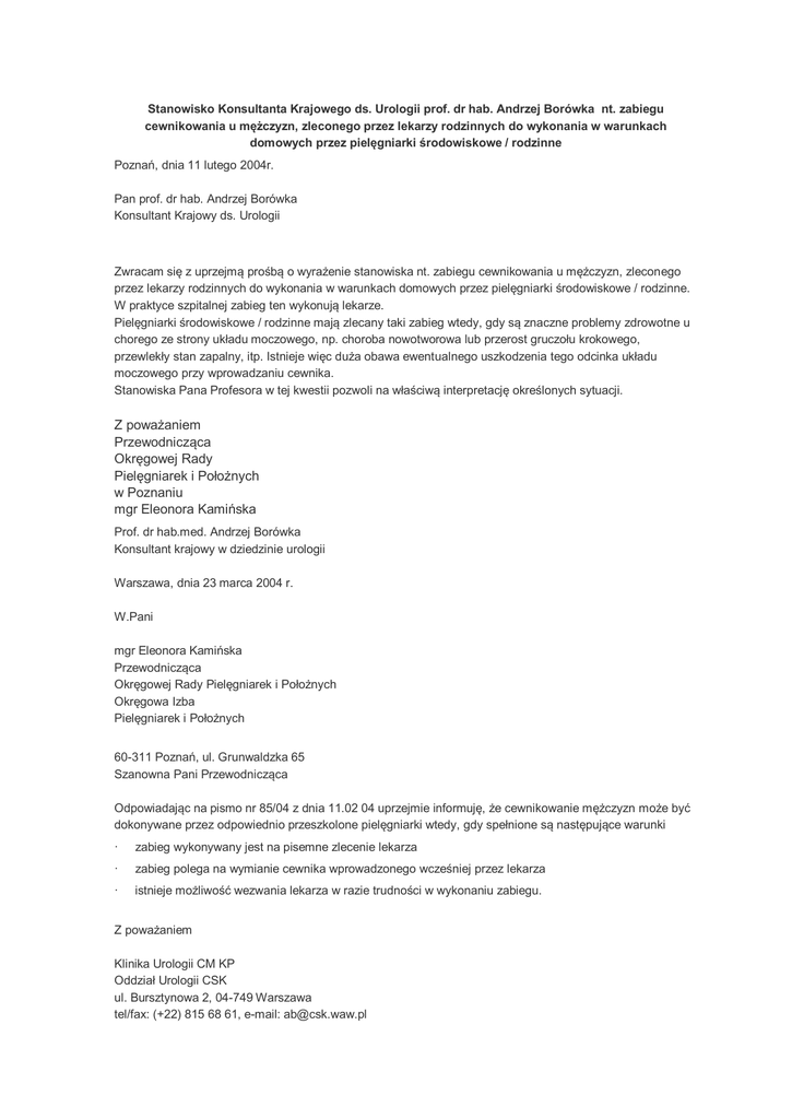 Stanowisko Konsultanta Krajowego ds. Urologii prof. dr hab. Andrzej Borówka nt. zabiegu cewnikowania u mężczyzn, zleconego przez lekarzy rodzinnych do wykonania w warunkach domowych przez pielęgniarki środowiskowe / rodzinne Poznań, dnia 11 lutego 2004r. Pan prof. dr hab. Andrzej Borówka Konsultant Krajowy ds. Urologii Zwracam się z uprzejmą prośbą o wyrażenie stanowiska nt. zabiegu cewnikowania u mężczyzn, zleconego przez lekarzy rodzinnych do wykonania w warunkach domowych przez pielęgniarki środowiskowe / rodzinne. W praktyce szpitalnej zabieg ten wykonują lekarze. Pielęgniarki środowiskowe / rodzinne mają zlecany taki zabieg wtedy, gdy są znaczne problemy zdrowotne u chorego ze strony układu moczowego, np. choroba nowotworowa lub przerost gruczołu krokowego, przewlekły stan zapalny, itp. Istnieje więc duża obawa ewentualnego uszkodzenia tego odcinka układu moczowego przy wprowadzaniu cewnika. Stanowiska Pana Profesora w tej kwestii pozwoli na właściwą interpretację określonych sytuacji. Z poważaniem Przewodnicząca Okręgowej Rady Pielęgniarek i Położnych w Poznaniu mgr Eleonora Kamińska Prof. dr hab.med. Andrzej Borówka Konsultant krajowy w dziedzinie urologii Warszawa, dnia 23 marca 2004 r. W.Pani mgr Eleonora Kamińska Przewodnicząca Okręgowej Rady Pielęgniarek i Położnych Okręgowa Izba Pielęgniarek i Położnych 60-311 Poznań, ul. Grunwaldzka 65 Szanowna Pani Przewodnicząca Odpowiadając na pismo nr 85/04 z dnia 11.02 04 uprzejmie informuję, że cewnikowanie mężczyzn może być dokonywane przez odpowiednio przeszkolone pielęgniarki wtedy, gdy spełnione są następujące warunki · zabieg wykonywany jest na pisemne zlecenie lekarza · zabieg polega na wymianie cewnika wprowadzonego wcześniej przez lekarza · istnieje możliwość wezwania lekarza w razie trudności w wykonaniu zabiegu. Z poważaniem Klinika Urologii CM KP Oddział Urologii CSK ul. Bursztynowa 2, 04-749 Warszawa tel/fax: (+22) 815 68 61, e-mail: [email protected]