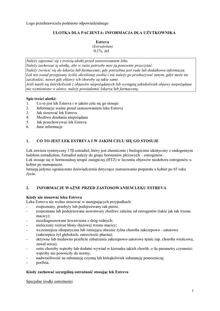 Logo przedstawiciela podmiotu odpowiedzialnego ULOTKA DLA PACJENTA: INFORMACJA DLA UŻYTKOWNIKA Estreva (Estradiolum) 0,1%, żel Należy zapoznać się z treścią ulotki przed zastosowaniem leku. Należy zachować tę ulotkę, aby w razie potrzeby móc ją ponownie przeczytać. Należy zwrócić się do lekarza lub farmaceuty, gdy potrzebna jest rada lub dodatkowa informacja. Lek ten został przepisany ściśle określonej osobie i nie należy go przekazywać innym, gdyż może im zaszkodzić, nawet gdy objawy ich choroby są takie same. Jeśli nasili się którykolwiek z objawów niepożądanych lub wystąpią jakiekolwiek objawy niepożądane nie wymienione w ulotce, należy powiadomić lekarza lub farmaceutę. Spis treści ulotki: 1. Co to jest lek Estreva i w jakim celu się go stosuje 2. Informacje ważne przed zastosowaniem leku Estreva 3. Jak stosować lek Estreva 4. Możliwe działania niepożądane 5. Jak przechowywać lek Estreva 6. Inne informacje 1. CO TO JEST LEK ESTREVA I W JAKIM CELU SIĘ GO STOSUJE Lek zawiera syntetyczny 17-estradiol, który jest chemicznie i biologicznie identyczny z endogennym ludzkim estradiolem. Estradiol należy do grupy hormonów płciowych – estrogenów. Lek stosuje się w hormonalnej terapii zastępczej (HTZ) w leczeniu objawów niedoboru estrogenów u kobiet po menopauzie. Istnieją jedynie ograniczone doświadczenia dotyczące zastosowania preparatu u kobiet po 65 roku życia. 2. INFORMACJE WAŻNE PRZED ZASTOSOWANIEM LEKU ESTREVA Kiedy nie stosować leku Estreva Leku Estreva nie wolno stosować w następujących przypadkach: rozpoznany, przebyty lub podejrzewany rak piersi; rozpoznane lub podejrzewane nowotwory złośliwe zależne od estrogenów (takie jak rak trzonu macicy); niezdiagnozowane krwawienia z dróg rodnych; nieleczony rozrost błony śluzowej trzonu macicy; wcześniejsza idiopatyczna lub istniejąca obecnie żylna choroba zakrzepowo - zatorowa (zakrzepica żył głębokich, zatorowość płucna); aktywne lub niedawno przebyte zaburzenia zakrzepowo-zatorowe tętnic (np. choroba wieńcowa, zawał serca); ostre choroby wątroby lub dodatni wywiad w kierunku takich chorób, o ile parametry czynności wątroby nie powróciły do normy; nadwrażliwość na substancję czynną lub którąkolwiek substancję pomocniczą; porfiria. Kiedy zachować szczególną ostrożność stosując lek Estreva Specjalne środki ostrożności 1 HTZ powinno się stosować tylko w leczeniu tych objawów menopauzy, które niekorzystnie wpływają na jakość życia. W regularnych odstępach czasu (co najmniej raz do roku) pacjentka powinna mieć przeprowadzane badanie kontrolne. Jeśli w trakcie leczenia pacjentka zaobserwuje jakiekolwiek zmiany w piersiach należy niezwłocznie poinformować o tym lekarza. Kobiety z zachowaną macicą przez co najmniej 12 dni cyklu powinny też zażywać progestagen. W przypadku, gdy którakolwiek z wymienionych niżej chorób została rozpoznana obecnie, występowała w przeszłości i(lub) nasilała się w okresie ciąży lub wcześniejszego leczenia hormonalnego pacjentka powinna pozostawać pod ścisłą kontrolą. Należy wziąć pod uwagę, że choroby te mogą wystąpić ponownie lub nasilić się w okresie leczenia lekiem Estreva; w szczególności należy tu wymienić: mięśniaki macicy lub endometriozę (występowanie błony śluzowej trzonu macicy w miejscach dla niej nietypowych) zaburzenia zakrzepowo-zatorowe w wywiadzie lub istnienie czynników podwyższających ryzyko ich wystąpienia (patrz niżej) czynniki ryzyka wystąpienia nowotworów estrogenozależnych, np. pokrewieństwo pierwszego stopnia z chorą na raka piersi nadciśnienie tętnicze choroby wątroby (np. gruczolak wątroby) cukrzyca , niezależnie od tego czy towarzyszą jej zmiany naczyniowe czy też nie kamica żółciowa migrena lub (silne) bóle głowy toczeń rumieniowaty układowy rozrost błony śluzowej trzonu macicy w wywiadzie (patrz niżej) padaczka astma otoskleroza (choroba ucha prowadząca do głuchoty) Lekarz podejmie decyzję o przerwaniu leczenia, jeżeli wystąpią przeciwwskazania, a także w następujących sytuacjach: żółtaczka lub narastające zaburzenia czynności wątroby znaczny wzrost ciśnienia tętniczego krwi nowy napad migrenowego bólu głowy ciąża Rozrost endometrium (rozrost błony śluzowej trzonu macicy) Ryzyko rozrostu i raka endometrium wzrasta przy podawaniu samych estrogenów przez długi czas. U kobiet z zachowaną macicą dodatek progestagenu przez co najmniej 12 dni w czasie cyklu znacznie zmniejsza to ryzyko. W pierwszych miesiącach leczenia mogą występować krwawienia i plamienia. Jeśli takie objawy wystąpią dopiero po pewnym czasie lub utrzymują się mimo przerwania leczenia należy poinformować o tym lekarza, który podejmie działanie w celu poznania ich przyczyny. Rak piersi W randomizowanym badaniu klinicznym oraz w badaniach epidemiologicznych wykazano zwiększone ryzyko raka piersi u kobiet przyjmujących przez wiele lat HTZ w postaci estrogenów, tybolonu lub skojarzenia estrogenu i progestagenu. Dla wszystkich rodzajów HTZ ryzyko staje się widoczne w ciągu kilku lat stosowania i wzrasta wraz z czasem, lecz powraca do wartości wyjściowych w ciągu kilku (najdalej 5) lat od przerwania kuracji. W badaniu MWS względne ryzyko raka piersi było większe przy przyjmowaniu skoniugowanych estrogenów końskich (CEE) lub estradiolu (E2), gdy do schematu terapeutycznego dodawano progestagen, tak sekwencyjnie jak i w sposób ciągły i to niezależnie od rodzaju progestagenu. 2 Żylna choroba zakrzepowo-zatorowa HTZ wiąże się ze wzrostem względnego ryzyka zakrzepów i zatorów w żyłach, tzn. zakrzepicy żył głębokich lub zatorowości płucnej. Wystąpienie zakrzepicy jest bardziej prawdopodobne w pierwszym roku stosowania HTZ niż później. Ogólnie uznawane czynniki ryzyka ŻChZZ obejmują pozytywny wywiad (w tym rodzinny) w kierunku zakrzepicy, znaczną otyłość (wskaźni