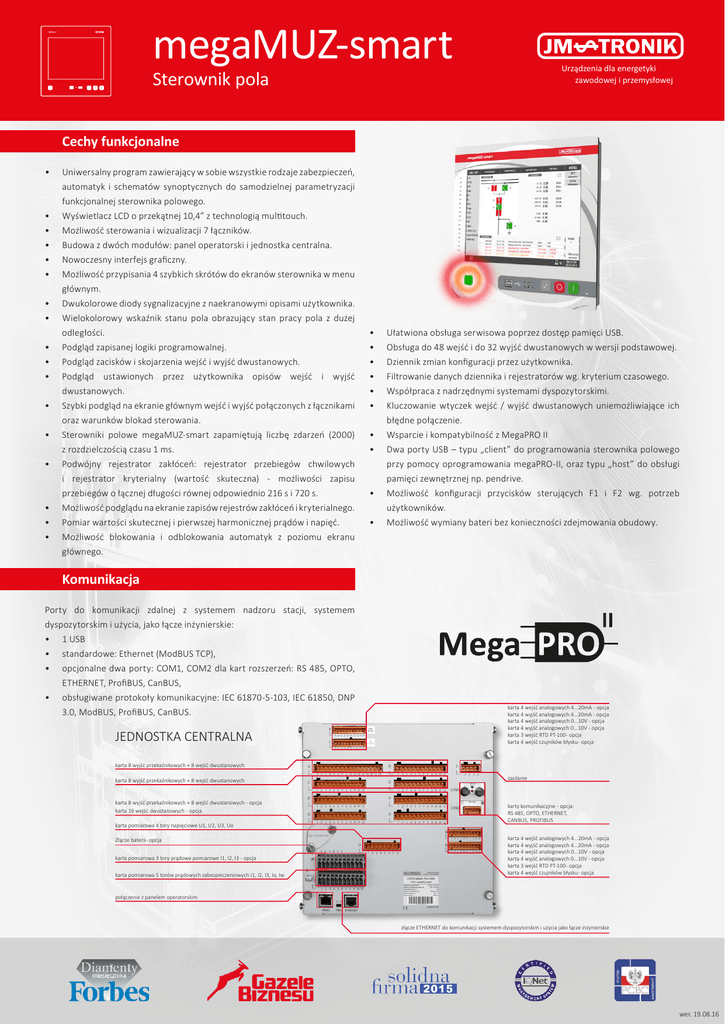 megaMUZ-smart Urządzenia dla energetyki zawodowej i przemysłowej Sterownik pola Cechy funkcjonalne • • • • • • • • • • • • • • • • • Uniwersalny program zawierający w sobie wszystkie rodzaje zabezpieczeń, automatyk i schematów synoptycznych do samodzielnej parametryzacji funkcjonalnej sterownika polowego. Wyświetlacz LCD o przekątnej 10,4” z technologią multitouch. Możliwość sterowania i wizualizacji 7 łączników. Budowa z dwóch modułów: panel operatorski i jednostka centralna. Nowoczesny interfejs graficzny. Możliwość przypisania 4 szybkich skrótów do ekranów sterownika w menu głównym. Dwukolorowe diody sygnalizacyjne z naekranowymi opisami użytkownika. Wielokolorowy wskaźnik stanu pola obrazujący stan pracy pola z dużej odległości. Podgląd zapisanej logiki programowalnej. Podgląd zacisków i skojarzenia wejść i wyjść dwustanowych. Podgląd ustawionych przez użytkownika opisów wejść i wyjść dwustanowych. Szybki podgląd na ekranie głównym wejść i wyjść połączonych z łącznikami oraz warunków blokad sterowania. Sterowniki polowe megaMUZ-smart zapamiętują liczbę zdarzeń (2000) z rozdzielczością czasu 1 ms. Podwójny rejestrator zakłóceń: rejestrator przebiegów chwilowych i rejestrator kryterialny (wartość skuteczna) - możliwości zapisu przebiegów o łącznej długości równej odpowiednio 216 s i 720 s. Możliwość podglądu na ekranie zapisów rejestrów zakłóceń i kryterialnego. Pomiar wartości skutecznej i pierwszej harmonicznej prądów i napięć. Możliwość blokowania i odblokowania automatyk z poziomu ekranu głównego. • • • • • • • • • • Ułatwiona obsługa serwisowa poprzez dostęp pamięci USB. Obsługa do 48 wejść i do 32 wyjść dwustanowych w wersji podstawowej. Dziennik zmian konfiguracji przez użytkownika. Filtrowanie danych dziennika i rejestratorów wg. kryterium czasowego. Współpraca z nadrzędnymi systemami dyspozytorskimi. Kluczowanie wtyczek wejść / wyjść dwustanowych uniemożliwiające ich błędne połączenie. Wsparcie i kompatybilność z MegaPRO II Dwa porty USB – typu „client” do programowania sterownika polowego przy pomocy oprogramowania megaPRO-II, oraz typu „host” do obsługi pamięci zewnętrznej np. pendrive. Możliwość konfiguracji przycisków sterujących F1 i F2 wg. potrzeb użytkowników. Możliwość wymiany bateri bez konieczności zdejmowania obudowy. Komunikacja Porty do komunikacji zdalnej z systemem nadzoru stacji, systemem dyspozytorskim i użycia, jako łącze inżynierskie: • 1 USB • standardowe: Ethernet (ModBUS TCP), • opcjonalne dwa porty: COM1, COM2 dla kart rozszerzeń: RS 485, OPTO, ETHERNET, ProfiBUS, CanBUS, • obsługiwane protokoły komunikacyjne: IEC 61870-5-103, IEC 61850, DNP 3.0, ModBUS, ProfiBUS, CanBUS. JEDNOSTKA CENTRALNA karta 4 wejść analogowych 4...20mA - opcja karta 4 wyjść analogowych 4...20mA - opcja karta 4 wejść analogowych 0...10V - opcja karta 4 wyjść analogowych 0...10V - opcja karta 3 wejść RTD PT-100 - opcja karta 4 wejść czujników błysku - opcja karta 8 wyjść przekaźnikowych + 8 wejść dwustanowych karta 8 wyjść przekaźnikowych + 8 wejść dwustanowych karta 8 wyjść przekaźnikowych + 8 wejść dwustanowych - opcja karta 16 wejść dwustanowych - opcja karta pomiarowa 4 tory napięciowe U1, U2, U3, Uo Złącze baterii - opcja karta pomiarowa 3 tory prądowe pomiarowe I1, I2, I3 - opcja karta pomiarowa 5 torów prądowych zabezpieczeniowych I1, I2, I3, Io, Iw zasilanie karty komunikacyjne - opcja: RS 485, OPTO, ETHERNET, CANBUS, PROFIBUS karta 4 wejść analogowych 4...20mA - opcja karta 4 wyjść analogowych 4...20mA - opcja karta 4 wejść analogowych 0...10V - opcja karta 4 wyjść analogowych 0...10V - opcja karta 3 wejść RTD PT-100 - opcja karta 4 wejść czujników błysku - opcja połączenie z panelem operatorskim złącze ETHERNET do komunikacji systemem dyspozytorskim i użycia jako łącze inżynierskie wer. 19.08.16 megaMUZ-smart Urządzenia dla energetyki zawodowej i przemysłowej Sterownik pola Sterowanie MegaMUZ-smart umożliwia sterowanie zdalne i lokalne 7 łącznikami, co jest wizualizowane na kolorowym schemacie synoptycznym. Sterownie odbywa się poprzez ekran dotykowy oraz wydzieloną klawiaturę i może być dodatkowo ograniczone różnymi poziomami dostępu dla wielu operatorów. Obwody sterownicze wyposażone są w standardowe blokady, układy kontroli i funkcje analityczne tj.: • blokadę zamykania wyłącznika przy rozbrojonym napędzie, • blokadę przed wielokrotnym zamykaniem wyłącznika na zwarcie, • blokadę zamknięcia uziemnika przy obecności napięcia w polu przy wykorzystaniu modułu EBU, • blokady dla pozostałych łączników, • kontrolę ciągłości obwodów: 2 wyłączających i 1 załączającego, • funkcja analizy zużycia wyłącznika w oparciu o wprowadzoną charakterystykę żywotności wyłącznika w odniesieniu do prądów wyłączalnych, co pokazuje informację o ilości operacji łączeniowych do końca żywotności aparatu, • blokada od II-ej harmonicznej. Zabezpieczenie łukowe ŚWIATŁOWÓD Sterowniki polowe megaMUZ-smart mogą być wyposażone w kartę czujników błysku i zabezpieczenie łukowe. Zabezpieczenie to pozwala na wykrycie zwarć łukowych w rozdzielnicy na podstawie pojawienia się błysku towarzyszącego zwarciu łukowemu. Zabezpieczenie łukowe pozwala na użycie dodatkowego kryterium wykrywania zwarć łukowych oraz bardzo szybkie ich wyłączenie (z czasem poniżej 10 ms). Sterowniki polowe megaMUZ-smart z zabezpieczeniem łukowym pozwalają na wzajemną komunikację poprzez magistralę CANBUS. Pozwala to na selektywne zadziałanie zabezpieczeń łukowych, tzn. w przypadku wykrycia zwarcia w przedziale kablowym pola liniowego otwierany jest wyłącznik własny pola, a przy zwarciu w przedziale szyn zbiorczych wyłączniki sprzęgła i pola zasilające