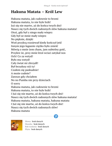iSing.pl - Każdy może śpiewać! Hakuna Matata – Król Lew Hakuna matata, jak cudownie to brzmi Hakuna matata, to nie byle bzik! Już się nie martw, aż do końca twych dni! Naucz się tych dwóch radosnych slów hakuna matata! Otoż, gdy był z niego mały wieprz Gdy był ze mnie mały wieprz No pięknie, dzięki Woń przykrą rozsiewał kiedy kończył jeść Innym jego kąpanie ciężko było znieść Mówią o mnie żem cham, jam subtelny gość, Przykre że, przy mnie ktoś wciaż zatykał nos Och! Co za wstyd! Było mu wstyd! Cały świat mi zbrzydł! Był brzydszy niż ty! Czułem się paskudnie! A może cudnie? Zawsze gdy chciałem No no Pumba nie przy dzieciach O sorry Hakuna matata, jak cudownie to brzmi Hakuna matata, to nie byle bzik! I Już się nie martw, aż do końca twych dni! Naucz się tych dwóch radosnych slów hakuna matata! Hakuna matata, hakuna matata, hakuna matata I Już się nie martw, aż do końca twych dni! Naucz się tych dwóch radosnych slów! Hakuna matata Słowa: brak danych Muzyka: brak danych Rok wydania: brak danych Płyta: brak danych