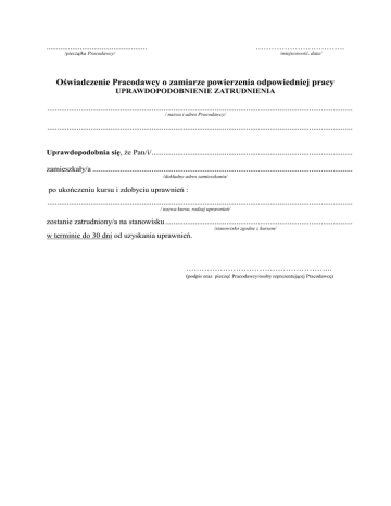 ……………………………. ................................................... /miejscowość, data/ /pieczątka Pracodawcy/ Oświadczenie Pracodawcy o zamiarze powierzenia odpowiedniej pracy UPRAWDOPODOBNIENIE ZATRUDNIENIA ........................................................................................................................................................... / nazwa i adres Pracodawcy/ ........................................................................................................................................................... Uprawdopodobnia się, że Pan/i/...................................................................................................... zamieszkały/a .................................................................................................................................... /dokładny adres zamieszkania/ po ukończeniu kursu i zdobyciu uprawnień : ........................................................................................................................................................... / nazwa kursu, rodzaj uprawnień/ zostanie zatrudniony/a na stanowisku ............................................................................................... /stanowisko zgodne z kursem/ w terminie do 30 dni od uzyskania uprawnień. ……………………………………………….. (podpis oraz pieczęć Pracodawcy/osoby reprezentującej Pracodawcę) …………………………………… (Miejscowość i data) OŚWIADCZENIE O ZAMIARZE PODJĘCIA DZIAŁALNOŚCI GOSPODARCZEJ PO UKOŃCZENIU SZKOLENIA 1. Oświadczam, że po ukończeniu wskazanego szkolenia dokonam wpisu do ewidencji działalności gospodarczej oraz rozpocznę działalność gospodarczą w okresie do 3 miesięcy od dnia ukończenia szkolenia: ………………………………………………………………………………………………………………………. (Rodzaj/przedmiot działalności gospodarczej/nr PKD) ………………………………………………………………………………………………………………………. 2. Dotychczasowe działania podjęte w celu uruchomienia działalności gospodarczej: ………………………………………………………………………………………………………………………. .……………………………………………………………………………………………………………………… ………………………………………………………………………………………………………………………. ………………………………………………………………………………………………………………………. 3. Szacunkowy koszt uruchomienia działalności ……………………………………………… 4. Źródła finansowania …………………………………………………………………............ ………………………………………………………………………………………………….. 6. Oświadczam, że rozpoczęcie deklarowanej działalności gospodarczej jest/nie jest uzależnione od przyznania przez PUP Gliwice jednorazowych środków na podjęcie działalności gospodarczej, o ile będę o nie występował/a. 7. Zobowiązuję się powiadomić PUP w Gliwicach o rozpoczęciu działalności gospodarczej w ciągu 7 dni od daty jej rozpoczęcia. ………………………………….. (Czytelny podpis Wnioskodawcy)