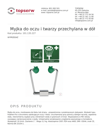 infolinia: 801 000 501 e-mail: [email protected] www: topserw.com.pl TOPSERW 05-220 Zielonka, ul. Marecka 66a tel. +48 22 771 04 56 tel. +48 22 761 11 80 fax +48 22 771 93 80 [email protected] Myjka do oczu i twarzy przechylana w dół Kod produktu: 101.135.227 WYPRZEDAŻ OPIS PRODUKTU Myjka do oczu, montowana do blatu lub ściany , prawostronna z przekręcanym statywem. Wylewki typu Feather-Flo o strumieniu opłukującym oczy i twarz. Uruchamiana przy pomocy dźwigni ręcznej, zapewnia stały, równomierny wypływ przy ciśnieniach wody w granicach 2-6 bar. Wyposażona w filtr sitowy usuwający zanieczyszczenie z wody. Uniwersalne oznakowanie urządzenia awaryjnego w komplecie. Wydajność 19 l/min. Zasilanie 1’’. Waga 3,2 kg. Atest/opinia CIOP, PZH oraz ANSI, DIN i OSHA, znak CE, Norma EN 15154-1. DANE TECHNICZNE Przeznaczenie Do oczu i twarzy Wylewka Feather-Flo Wydajność 19 l/min Mocowanie Do blatu Uruchamianie Ręczne Ciśnienie wody zasilającej 2-6 bar Zasilanie 1 cal Filtr sitowy Tak Waga 3,2 kg Norma EN 15154, ANSI, DIN, OSHA Atest PZH, CIOP Znak bezpieczeństwa Tak AKCESORIA Mieszacz termostatyczny ciepłej i zimnej wody, 38 l (myjka do o/t) 101.200.947 CERTYFIKATY Mieszacz termostatyczny ciepłej i zimnej wody, 45 l (myjka do o/t) 101.200.926