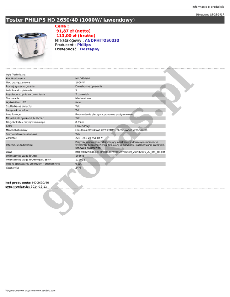 Informacje o produkcie Utworzono 03-03-2017 Toster PHILIPS HD 2630/40 (1000W/ lawendowy) Cena : 91,87 zł (netto) 113,00 zł (brutto) Nr katalogowy : AGDPHITOS0010 Producent : Philips Dostępność : Dostępny Opis Techniczny: HD 2630/40 Moc przyłączeniowa 1000 W Rodzaj systemu grzania Dwustronne opiekanie Ilość komór opiekania 2 Regulacja stopnia zarumienienia 7 ustawień Sterowanie Mechaniczne Wyświetlacz LCD false Szufladka na okruchy Tak Lampka kontrolna Tak Inne funkcje Rozmrażanie pieczywa, ponowne podgrzewanie Nasadka do opiekania bułeczek Tak Długość kabla przyłączeniowego 0,85 m Kolor Lawendowy Materiał obudowy Obudowa plastikowa (PP/PC/ABS), chromowana część górna Termoizolowana obudowa Tak Zasilanie 220 - 240 VA / 50 Hz V Informacje dodatkowe Przycisk anulowania zatrzymujący opiekanie w dowolnym momencie, wyłącznik bezpieczeństwa działający w przypadku zablokowania pieczywa, schowek na przewód as ok www .p l Kod Producenta http://download.p4c.philips.com/files/h/hd2630_20/hd2630_20_pss_pol.pdf Orientacyjna waga brutto 1949 g Orientacyjna waga brutto opak. zbior. 13200 g Ilość w opakowaniu zbiorczym - orientacyjnie 6 szt. Gwarancja 24M gr kod producenta: HD 2630/40 synchronizacja: 2014-12-12 Wygenerowano w programie www.oscGold.com