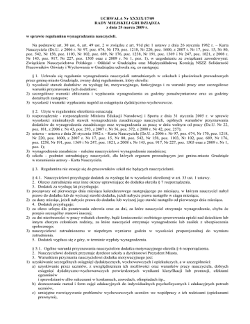 UCHWAŁA Nr XXXIX/17/09 RADY MIEJSKIEJ GRUDZIĄDZA z dnia 25 marca 2009 r. w sprawie regulaminu wynagradzania nauczycieli. Na podstawie art. 30 ust. 6, art. 49 ust. 2 w związku z art. 91d pkt 1 ustawy z dnia 26 stycznia 1982 r. – Karta Nauczyciela (Dz.U. z 2006 r. Nr 97, poz. 674, Nr 170, poz. 1218, Nr 220, poz. 1600, z 2007 r. Nr 17, poz. 15, Nr 80, poz. 542, Nr 158, poz. 1103, Nr 102, poz. 689, Nr 176, poz. 1238, Nr 191, poz. 1369 i Nr 247, poz. 1821, z 2008 r. Nr 145, poz. 917, Nr 227, poz. 1505 oraz z 2009 r. Nr 1, poz. 1), w uzgodnieniu ze związkami zawodowymi: Związkiem Nauczycielstwa Polskiego - Oddział w Grudziądzu oraz Międzyzakładową Komisją NSZZ Solidarność Pracowników Oświaty i Wychowania w Grudziądzu uchwala się, co następuje: § 1. Uchwala się regulamin wynagradzania nauczycieli zatrudnionych w szkołach i placówkach prowadzonych przez gminę-miasto Grudziądz, zwany dalej regulaminem, który określa: 1) wysokość stawek dodatków: za wysługę lat, motywacyjnego, funkcyjnego i za warunki pracy oraz szczegółowe warunki przyznawania tych dodatków; 2) szczegółowe warunki obliczania i wypłacania wynagrodzenia za godziny ponadwymiarowe oraz za godziny doraźnych zastępstw; 3) wysokość i warunki wypłacania nagród za osiągnięcia dydaktyczno-wychowawcze. § 2. Użyte w regulaminie określenia oznaczają: 1) rozporządzenie - rozporządzenie Ministra Edukacji Narodowej i Sportu z dnia 31 stycznia 2005 r. w sprawie wysokości minimalnych stawek wynagrodzenia zasadniczego nauczycieli, ogólnych warunków przyznawania dodatków do wynagrodzenia zasadniczego oraz wynagradzania za pracę w dniu wolnym od pracy (Dz.U. Nr 22, poz. 181, z 2006 r. Nr 43, poz. 293, z 2007 r. Nr 56, poz. 372, z 2008 r. Nr 42, poz. 257); 2) ustawa – ustawa z dnia 26 stycznia 1982 r. - Karta Nauczyciela (Dz.U. z 2006 r. Nr 97, poz. 674, Nr 170, poz. 1218, Nr 220, poz. 1600, z 2007 r. Nr 17, poz. 15, Nr 80, poz. 542, Nr 158, poz. 1103, Nr 102, poz. 689, Nr 176, poz. 1238, Nr 191, poz. 1369 i Nr 247, poz. 1821, z 2008 r. Nr 145, poz. 917, Nr 227, poz. 1505 oraz z 2009 r. Nr 1, poz. 1); 3) wynagrodzenie zasadnicze – należne nauczycielowi wynagrodzenie zasadnicze; 4) szkoła – podmiot zatrudniający nauczycieli, dla których organem prowadzącym jest gmina-miasto Grudziądz w rozumieniu ustawy - Karta Nauczyciela. § 3. Regulaminu nie stosuje się do pracowników szkół nie będących nauczycielami. 1) 2) 1) 2) 3) § 4.1. Nauczycielowi przysługuje dodatek za wysługę lat w wysokości określonej w art. 33 ust. 1 ustawy. 2. Okresy zatrudnienia oraz inne okresy uprawniające do dodatku określa § 7 rozporządzenia. 3. Dodatek za wysługę lat przysługuje: począwszy od pierwszego dnia miesiąca kalendarzowego następującego po miesiącu, w którym nauczyciel nabył prawo do dodatku lub do wyższej stawki dodatku, jeżeli nabycie prawa nastąpiło w ciągu miesiąca; za dany miesiąc, jeżeli nabycie prawa do dodatku lub wyższej jego stawki nastąpiło od pierwszego dnia miesiąca. 4. Dodatek przysługuje: za okres urlopu dla poratowania zdrowia oraz za dni, za które nauczyciel otrzymuje wynagrodzenie, chyba że przepis szczególny stanowi inaczej; za dni nieobecności w pracy wskutek choroby, bądź konieczności osobistego sprawowania opieki nad dzieckiem lub innym chorym członkiem rodziny, za które nauczyciel otrzymuje wynagrodzenie lub zasiłek z ubezpieczenia społecznego; nauczycielowi zatrudnionemu w niepełnym wymiarze godzin w wysokości proporcjonalnej do wymiaru zatrudnienia. 5. Dodatek wypłaca się z góry, w terminie wypłaty wynagrodzenia. § 5.1. Ogólne warunki przyznawania nauczycielom dodatku motywacyjnego określa § 6 rozporządzenia. 2. Nauczycielowi dodatek przyznaje dyrektor szkoły a dyrektorowi Prezydent Miasta. 3. Warunkiem przyznania nauczycielowi dodatku motywacyjnego jest: 1) uzyskiwanie szczególnych osiągnięć dydaktycznych, wychowawczych i opiekuńczych, a w szczególności: a) uzyskiwanie przez uczniów, z uwzględnieniem ich możliwości oraz warunków pracy nauczyciela, dobrych osiągnięć dydaktyczno-wychowawczych potwierdzonych wynikami klasyfikacji lub promocji, efektami egzaminów i sprawdzianów albo sukcesami w konkursach, zawodach, olimpiadach itp., b) dostosowanie metod i form zajęć edukacyjnych do indywidualnych psychofizycznych i edukacyjnych potrzeb uczniów, c) umiejętne rozwiązywanie problemów wychowawczych uczniów we współpracy z ich rodzicami (opiekunami prawnymi), d) pełne rozpoznanie środowiska wychowawczego uczniów, aktywne i efektywne działanie na rzecz uczniów i wychowanków potrzebujących szczególnej opieki, e) trafne konstruowanie planów pomocy wychowankowi i jego rodzinie, uwzględniających utrzymanie więzi i przygotowujących warunki do powrotu wychowanka do rodziny, f) realizacja zadań i podejmowanie inicjatyw zwiększających udział i rolę szkoły w środowisku lokalnym; 2) jakość świadczonej pracy, w tym związanej dodatkowym zadaniem lub zajęciem, w szczególności: a) systematyczne i efektywne wykonywanie powierzonych zadań, b) podnoszenie umiejętności zawodowych, c) wzbogacanie własnego warsztatu pracy, d) dbałość o estetykę wykorzystywanych pomieszczeń, sprawność pomocy dydaktycznych lub innych urządzeń szkolnych, e) rzetelne i terminowe wywiązywanie się z poleceń służbowych, f) przestrzeganie dyscypliny pracy; 3) zaangażowanie w realizację czynności i zajęć, o których mowa w art. 42 ust. 2 pkt 2 i 3 ustawy, a w szczególności: a) udział w organizowaniu imprez i uroczystości szkolnych, b) udział w komisjach powoływanych przez dyrektora szkoły, organy samorządowe i inne instytucje, c) opiekowanie się samorządem uczniowskim lub innymi organizacjami uczniowskimi działającymi na terenie szkoły, d) aktywny udział w realizowaniu innych zadań statutowych szkoły, e) realizowanie w szkole zadań edukacyjnych wynikających z przyjętych przez or