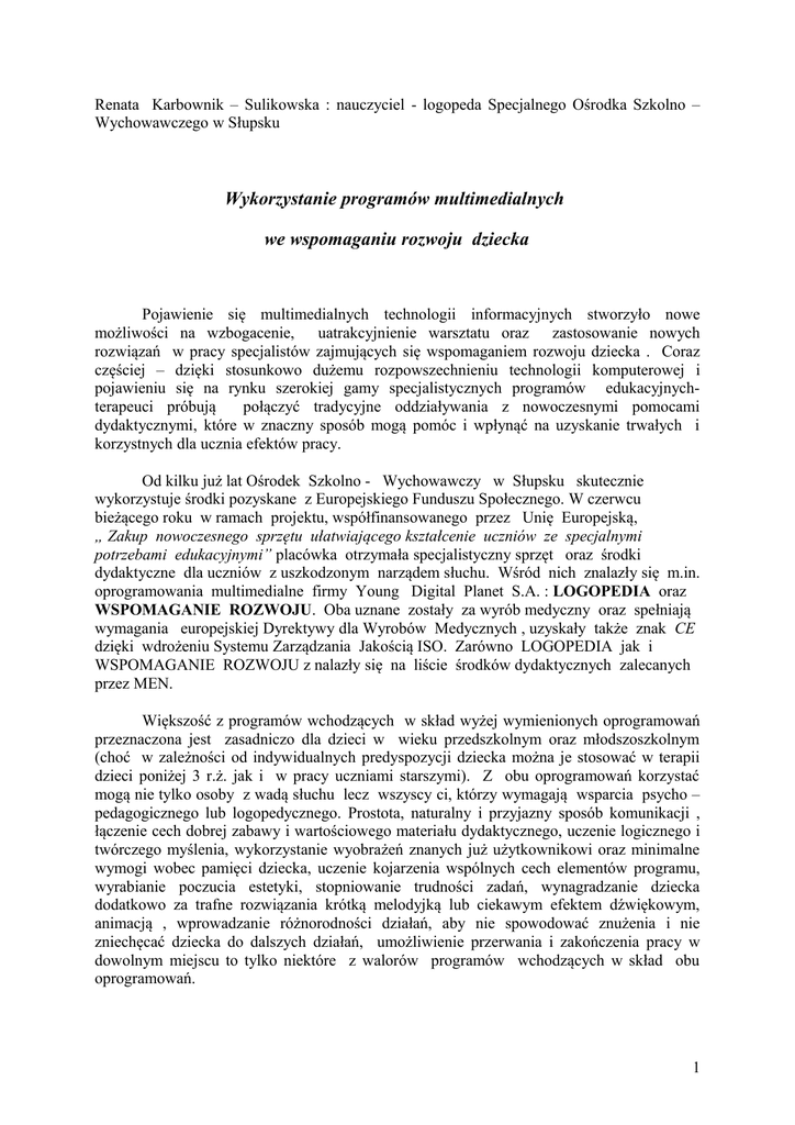 Renata Karbownik – Sulikowska : nauczyciel - logopeda Specjalnego Ośrodka Szkolno – Wychowawczego w Słupsku Wykorzystanie programów multimedialnych we wspomaganiu rozwoju dziecka Pojawienie się multimedialnych technologii informacyjnych stworzyło nowe możliwości na wzbogacenie, uatrakcyjnienie warsztatu oraz zastosowanie nowych rozwiązań w pracy specjalistów zajmujących się wspomaganiem rozwoju dziecka . Coraz częściej – dzięki stosunkowo dużemu rozpowszechnieniu technologii komputerowej i pojawieniu się na rynku szerokiej gamy specjalistycznych programów edukacyjnychterapeuci próbują połączyć tradycyjne oddziaływania z nowoczesnymi pomocami dydaktycznymi, które w znaczny sposób mogą pomóc i wpłynąć na uzyskanie trwałych i korzystnych dla ucznia efektów pracy. Od kilku już lat Ośrodek Szkolno - Wychowawczy w Słupsku skutecznie wykorzystuje środki pozyskane z Europejskiego Funduszu Społecznego. W czerwcu bieżącego roku w ramach projektu, współfinansowanego przez Unię Europejską, „ Zakup nowoczesnego sprzętu ułatwiającego kształcenie uczniów ze specjalnymi potrzebami edukacyjnymi” placówka otrzymała specjalistyczny sprzęt oraz środki dydaktyczne dla uczniów z uszkodzonym narządem słuchu. Wśród nich znalazły się m.in. oprogramowania multimedialne firmy Young Digital Planet S.A. : LOGOPEDIA oraz WSPOMAGANIE ROZWOJU. Oba uznane zostały za wyrób medyczny oraz spełniają wymagania europejskiej Dyrektywy dla Wyrobów Medycznych , uzyskały także znak CE dzięki wdrożeniu Systemu Zarządzania Jakością ISO. Zarówno LOGOPEDIA jak i WSPOMAGANIE ROZWOJU z nalazły się na liście środków dydaktycznych zalecanych przez MEN. Większość z programów wchodzących w skład wyżej wymienionych oprogramowań przeznaczona jest zasadniczo dla dzieci w wieku przedszkolnym oraz młodszoszkolnym (choć w zależności od indywidualnych predyspozycji dziecka można je stosować w terapii dzieci poniżej 3 r.ż. jak i w pracy uczniami starszymi). Z obu oprogramowań korzystać mogą nie tylko osoby z wadą słuchu lecz wszyscy ci, którzy wymagają wsparcia psycho – pedagogicznego lub logopedycznego. Prostota, naturalny i przyjazny sposób komunikacji , łączenie cech dobrej zabawy i wartościowego materiału dydaktycznego, uczenie logicznego i twórczego myślenia, wykorzystanie wyobrażeń znanych już użytkownikowi oraz minimalne wymogi wobec pamięci dziecka, uczenie kojarzenia wspólnych cech elementów programu, wyrabianie poczucia estetyki, stopniowanie trudności zadań, wynagradzanie dziecka dodatkowo za trafne rozwiązania krótką melodyjką lub ciekawym efektem dźwiękowym, animacją , wprowadzanie różnorodności działań, aby nie spowodować znużenia i nie zniechęcać dziecka do dalszych działań, umożliwienie przerwania i zakończenia pracy w dowolnym miejscu to tylko niektóre z walorów programów wchodzących w skład obu oprogramowań. 1 Opis zestawu oprogramowania : LOGOPEDIA W skład tego oprogramowania wchodzą programy do diagnozy i terapii logopedycznej , które pozwalają na przeprowadzenie profesjonalnej a jednocześnie przyjemnej dla dziecka diagnozy i terapii logopedycznej. Zestaw zawiera : Aplikację logopedy - program do zarządzania pracą logopedy Programy do diagnozy i terapii logopedycznej - Badanie mowy , Szereg ciszący , Szereg szumiący, Szereg syczący , Różnicowanie szeregów, Głoska r, Sfonem, Echokorektor, Mowa Bezdźwięczna, LOGOGRY, Mówiące obrazki, Zabawy słowem ( cz.1 , cz. 2), Logorytmika, Obrazkowy słownik tematyczny ( cz.1, 2) Programy : Badanie mowy , Szereg ciszący Szereg syczący, Szereg szumiący , Różnicowanie szeregów, Głoska r, Każdy z tych programów obejmuje materiał ćwiczeniowy przeznaczony do każdego etapu terapii danej głoski. Wszystkie programy posiadają liczne ilustracje , animacje, układanki , kolorowanki , puzzle, gry wspomagające terapię . Cechą charakterystyczną wszystkich tych programów jest prostota , która pobudza wyobraźnię dziecka. Logiczny układ obrazków, trafnie skomponowane kategorie tematyczne oraz bardzo łatwy sposób wyboru obrazków - wszystko to sprawia, że dziecko już przy pierwszym kontakcie z określonym zadaniem odnosi sukces. Najważniejsze jest jednak to, zwłaszcza w pracy z osobami niepełnosprawnymi, że proste, czytelne instrukcje poszczególnych ćwiczeń wyzwalają chęć podejmowania aktywności. Praktycznie przy każdym zadaniu dziecko czuje się autentycznym sprawcą swego działania ruchowego i głosowego, np. gdy wykona kliknięcie myszą lub wyemituje dźwięk, na ekranie komputera od razu dostrzega efekty swojego działania. Usłyszeć może także wzorcową wymowę lektora. Wszystkie te programy mogą posłużyć logopedzie do wstępnej oceny słuchu fonemowego i fonetycznego, jak również do dokonania oceny mowy dziecka, jego zasobu słownikowego oraz rozumienia pojęć z różnych kategorii .Stanowić także mogą także podstawę do wstępnej oceny budowania przez dziecko struktur zdaniowych oraz badania mowy spontanicznej. Pomimo tego ,iż programy te skierowane są głównie do logopedów, z powodzeniem mogą być stosowane przez innych terapeutów - psychologów czy pedagogów. LOGO - Gry są zestawem dziesięciu programów wspomagających i uatrakcyjniających terapię logopedyczną dzieci z zaburzeniami mowy spowodowanymi uszkodzeniem słuchu lub innego pochodzenia. Istotną cechą LOGO-GIER ,w przypadku dzieci głuchych lub niedosłyszacych, jest możliwość „ujrzenia” swojego głosu na ekranie monitora. Oglądanie wizualnego obrazu własnej wypowiedzi pozwala dziecku z wadą słuchu porównać swoją wypowiedź z wypowiedzią prawidłową, a następnie dążyć do jak najlepszego dopasowania się do wzorca. Komputer pomaga w tym wypadku zlikwidować podstawową przeszkodę w nauce dzieci głuchych, jaką jest brak sprzężenia zwrotnego w trakcie mówienia. Naturalne, akustyczn