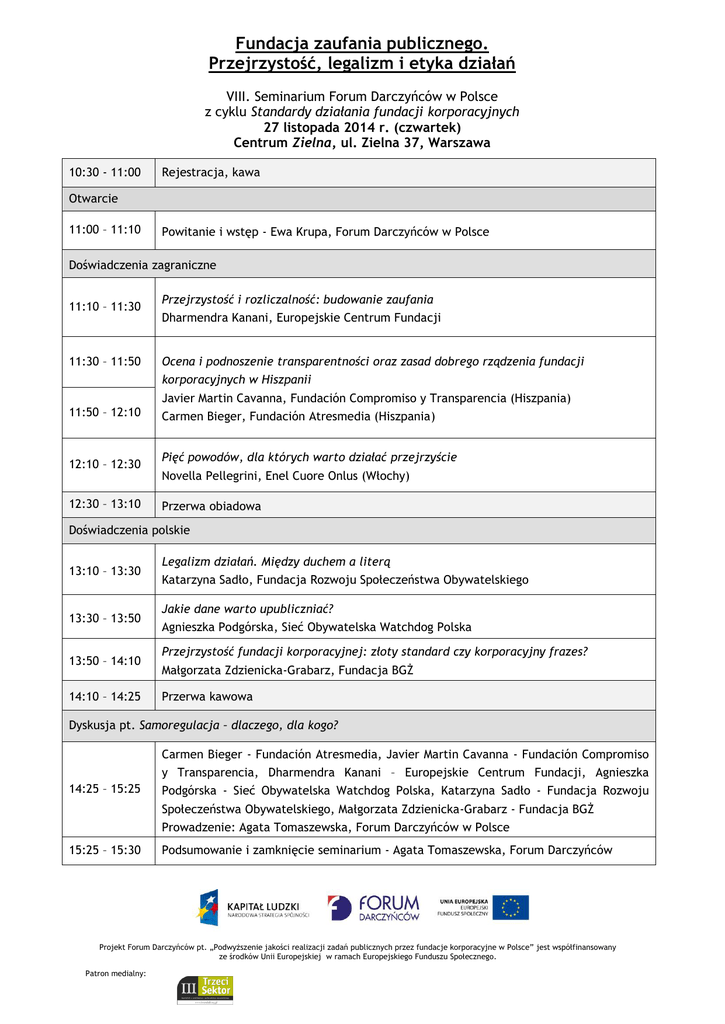 Fundacja zaufania publicznego. Przejrzystość, legalizm i etyka działań VIII. Seminarium Forum Darczyńców w Polsce z cyklu Standardy działania fundacji korporacyjnych 27 listopada 2014 r. (czwartek) Centrum Zielna, ul. Zielna 37, Warszawa 10:30 - 11:00 Rejestracja, kawa Otwarcie 11:00 – 11:10 Powitanie i wstęp - Ewa Krupa, Forum Darczyńców w Polsce Doświadczenia zagraniczne 11:10 – 11:30 11:30 – 11:50 Przejrzystość i rozliczalność: budowanie zaufania Dharmendra Kanani, Europejskie Centrum Fundacji Ocena i podnoszenie transparentności oraz zasad dobrego rządzenia fundacji korporacyjnych w Hiszpanii Javier Martin Cavanna, Fundación Compromiso y Transparencia (Hiszpania) 11:50 – 12:10 12:10 – 12:30 12:30 – 13:10 Carmen Bieger, Fundación Atresmedia (Hiszpania) Pięć powodów, dla których warto działać przejrzyście Novella Pellegrini, Enel Cuore Onlus (Włochy) Przerwa obiadowa Doświadczenia polskie 13:10 – 13:30 13:30 – 13:50 13:50 – 14:10 14:10 – 14:25 Legalizm działań. Między duchem a literą Katarzyna Sadło, Fundacja Rozwoju Społeczeństwa Obywatelskiego Jakie dane warto upubliczniać? Agnieszka Podgórska, Sieć Obywatelska Watchdog Polska Przejrzystość fundacji korporacyjnej: złoty standard czy korporacyjny frazes? Małgorzata Zdzienicka-Grabarz, Fundacja BGŻ Przerwa kawowa Dyskusja pt. Samoregulacja – dlaczego, dla kogo? Carmen Bieger - Fundación Atresmedia, Javier Martin Cavanna - Fundación Compromiso y Transparencia, Dharmendra Kanani – Europejskie Centrum Fundacji, Agnieszka 14:25 – 15:25 Podgórska - Sieć Obywatelska Watchdog Polska, Katarzyna Sadło - Fundacja Rozwoju Społeczeństwa Obywatelskiego, Małgorzata Zdzienicka-Grabarz - Fundacja BGŻ Prowadzenie: Agata Tomaszewska, Forum Darczyńców w Polsce 15:25 – 15:30 Podsumowanie i zamknięcie seminarium - Agata Tomaszewska, Forum Darczyńców Projekt Forum Darczyńców pt. „Podwyższenie jakości realizacji zadań publicznych przez fundacje korporacyjne w Polsce” jest współfinansowany ze środków Unii Europejskiej w ramach Europejskiego Funduszu Społecznego. Patron medialny:
