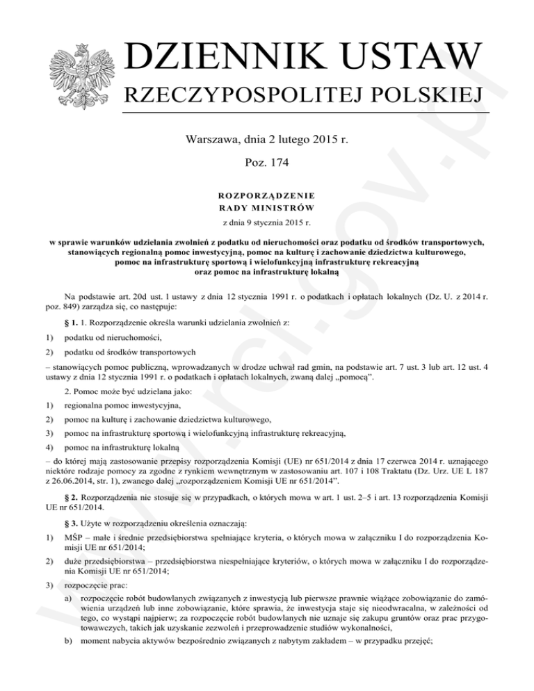 l.g ov .pl DZIENNIK USTAW RZECZYPOSPOLITEJ POLSKIEJ Warszawa, dnia 2 lutego 2015 r. Poz. 174 RO ZPO R ZĄ D ZE N I E RA DY M I NI S TR Ó W z dnia 9 stycznia 2015 r. w sprawie warunków udzielania zwolnień z podatku od nieruchomości oraz podatku od środków transportowych, stanowiących regionalną pomoc inwestycyjną, pomoc na kulturę i zachowanie dziedzictwa kulturowego, pomoc na infrastrukturę sportową i wielofunkcyjną infrastrukturę rekreacyjną oraz pomoc na infrastrukturę lokalną Na podstawie art. 20d ust. 1 ustawy z dnia 12 stycznia 1991 r. o podatkach i opłatach lokalnych (Dz. U. z 2014 r. poz. 849) zarządza się, co następuje: § 1. 1. Rozporządzenie określa warunki udzielania zwolnień z: podatku od nieruchomości, 2) podatku od środków transportowych w. rc 1) – stanowiących pomoc publiczną, wprowadzanych w drodze uchwał rad gmin, na podstawie art. 7 ust. 3 lub art. 12 ust. 4 ustawy z dnia 12 stycznia 1991 r. o podatkach i opłatach lokalnych, zwaną dalej „pomocą”. 2. Pomoc może być udzielana jako: 1) 2) 3) 4) regionalna pomoc inwestycyjna, pomoc na kulturę i zachowanie dziedzictwa kulturowego, pomoc na infrastrukturę sportową i wielofunkcyjną infrastrukturę rekreacyjną, pomoc na infrastrukturę lokalną – do której mają zastosowanie przepisy rozporządzenia Komisji (UE) nr 651/2014 z dnia 17 czerwca 2014 r. uznającego niektóre rodzaje pomocy za zgodne z rynkiem wewnętrznym w zastosowaniu art. 107 i 108 Traktatu (Dz. Urz. UE L 187 z 26.06.2014, str. 1), zwanego dalej „rozporządzeniem Komisji UE nr 651/2014”. ww § 2. Rozporządzenia nie stosuje się w przypadkach, o których mowa w art. 1 ust. 2–5 i art. 13 rozporządzenia Komisji UE nr 651/2014. § 3. Użyte w rozporządzeniu określenia oznaczają: 1) MŚP – małe i średnie przedsiębiorstwa spełniające kryteria, o których mowa w załączniku I do rozporządzenia Komisji UE nr 651/2014; 2) duże przedsiębiorstwa – przedsiębiorstwa niespełniające kryteriów, o których mowa w załączniku I do rozporządzenia Komisji UE nr 651/2014; 3) rozpoczęcie prac: a) rozpoczęcie robót budowlanych związanych z inwestycją lub pierwsze prawnie wiążące zobowiązanie do zamówienia urządzeń lub inne zobowiązanie, które sprawia, że inwestycja staje się nieodwracalna, w zależności od tego, co wystąpi najpierw; za rozpoczęcie robót budowlanych nie uznaje się zakupu gruntów oraz prac przygotowawczych, takich jak uzyskanie zezwoleń i przeprowadzenie studiów wykonalności, b) moment nabycia aktywów bezpośrednio związanych z nabytym zakładem – w przypadku przejęć; Dziennik Ustaw –2– Poz. 174 intensywność pomocy – kwotę pomocy brutto wyrażoną jako odsetek kosztów kwalifikowanych, przed potrąceniem podatku lub innych opłat; 5) obszary objęte pomocą – obszary określone w rozporządzeniu Rady Ministrów z dnia 30 czerwca 2014 r. w sprawie ustalenia mapy pomocy regionalnej na lata 2014–2020 (Dz. U. poz. 878); 6) rzeczowe aktywa trwałe – aktywa obejmujące grunty, budynki, zakład, urządzenia i wyposażenie; 7) wartości niematerialne i prawne – aktywa nieposiadające postaci fizycznej ani finansowej, w tym patenty, licencje, know-how lub inną własność intelektualną; 8) wzrost netto liczby pracowników – wzrost liczby pracowników w danym zakładzie w porównaniu ze średnią w danym okresie, co oznacza, że odliczyć należy wszystkie miejsca pracy zlikwidowane w tym okresie, a liczbę osób zatrudnionych w pełnym wymiarze czasu, w niepełnym wymiarze czasu oraz sezonowo należy wyrazić w postaci ułamkowych części rocznych jednostek pracy; 9) regionalna pomoc inwestycyjna – pomoc regionalną przyznawaną na inwestycję początkową lub inwestycję początkową na rzecz nowej działalności gospodarczej na obszarach objętych pomocą; 10) inwestycja początkowa: a) l.g ov .pl 4) inwestycję w rzeczowe aktywa trwałe lub wartości niematerialne i prawne związane z założeniem nowego zakładu, zwiększeniem zdolności produkcyjnej istniejącego zakładu, dywersyfikacją produkcji zakładu poprzez wprowadzenie produktów uprzednio nieprodukowanych w zakładzie lub zasadniczą zmianą dotyczącą procesu produkcyjnego istniejącego zakładu, b) nabycie aktywów należących do zakładu, który został zamknięty lub zostałby zamknięty, gdyby zakup nie nastąpił, przy czym aktywa nabywane są przez inwestora niezwiązanego ze sprzedawcą i wyklucza się samo nabycie akcji lub udziałów przedsiębiorstwa; 11) inwestycja początkowa na rzecz nowej działalności gospodarczej: inwestycję w rzeczowe aktywa trwałe lub wartości niematerialne i prawne związane z założeniem nowego zakładu lub z dywersyfikacją działalności zakładu, pod warunkiem że nowa działalność, która ma być prowadzona, nie jest taka sama jak działalność poprzednio prowadzona w danym zakładzie ani podobna do takiej działalności w rozumieniu art. 2 pkt 50 rozporządzenia Komisji UE nr 651/2014, w. rc a) b) nabycie aktywów należących do zakładu, który został zamknięty lub zostałby zamknięty, gdyby nie został nabyty i który jest nabywany przez inwestora niezwiązanego ze sprzedawcą, pod warunkiem że nowa działalność, jaka ma być prowadzona z wykorzystaniem nabytych aktywów, nie jest taka sama, jak działalność prowadzona w zakładzie przed nabyciem ani podobna do takiej działalności w rozumieniu art. 2 pkt 50 rozporządzenia Komisji UE nr 651/2014; 12) duży projekt inwestycyjny – inwestycję początkową, której koszty kwalifikowane, obliczane z zastosowaniem cen i kursów wymiany w dniu przyznania pomocy, przekraczają 50 mln euro; 13) pomoc na kulturę i zachowanie dziedzictwa kulturowego – pomoc udzielaną na cele i działania kulturalne określone w art. 53 ust. 2 rozporządzenia Komisji UE nr 651/2014; 14) rozsądny zysk – zysk ustalany w odniesieniu do typowego zysku dla danego sektora; za rozsądną będz