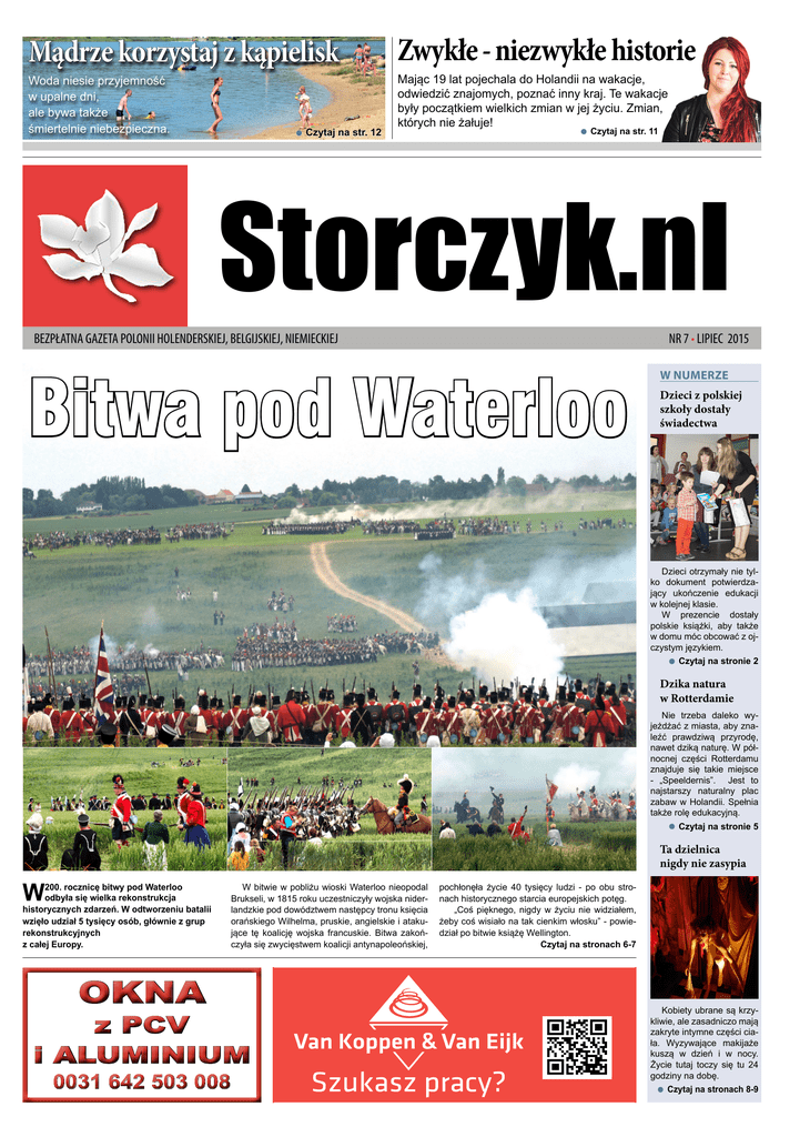 Mądrze korzystaj z kąpielisk Woda niesie przyjemność w upalne dni, ale bywa także śmiertelnie niebezpieczna. QQ Czytaj na str. 12 Zwykłe - niezwykłe historie Mając 19 lat pojechala do Holandii na wakacje, odwiedzić znajomych, poznać inny kraj. Te wakacje były początkiem wielkich zmian w jej życiu. Zmian, których nie żałuje! QQ Czytaj na str. 11 Storczyk.nl BEZPŁATNA GAZETA POLONII HOLENDERSKIEJ, BELGIJSKIEJ, NIEMIECKIEJ Bitwa pod Waterloo NR 7 • LIPIEC 2015 W NUMERZE Dzieci z polskiej szkoły dostały świadectwa Dzieci otrzymały nie tylko dokument potwierdzający ukończenie edukacji w kolejnej klasie. W prezencie dostały polskie książki, aby także w domu móc obcować z ojczystym językiem. QQ Czytaj na stronie 2 Dzika natura w Rotterdamie Nie trzeba daleko wyjeżdżać z miasta, aby znaleźć prawdziwą przyrodę, nawet dziką naturę. W północnej części Rotterdamu znajduje się takie miejsce - „Speeldernis”. Jest to najstarszy naturalny plac zabaw w Holandii. Spełnia także rolę edukacyjną. QQ Czytaj na stronie 5 Ta dzielnica nigdy nie zasypia W 200. rocznicę bitwy pod Waterloo odbyła się wielka rekonstrukcja historycznych zdarzeń. W odtworzeniu batalii wzięło udział 5 tysięcy osób, głównie z grup rekonstrukcyjnych z całej Europy. OKNA W bitwie w pobliżu wioski Waterloo nieopodal Brukseli, w 1815 roku uczestniczyły wojska niderlandzkie pod dowództwem następcy tronu księcia orańskiego Wilhelma, pruskie, angielskie i atakujące tę koalicję wojska francuskie. Bitwa zakończyła się zwycięstwem koalicji antynapoleońskiej, z PCV i ALUMINIUM 0031 642 503 008 pochłonęła życie 40 tysięcy ludzi - po obu stronach historycznego starcia europejskich potęg. „Coś pięknego, nigdy w życiu nie widziałem, żeby coś wisiało na tak cienkim włosku” - powiedział po bitwie książę Wellington. Czytaj na stronach 6-7 Kobiety ubrane są krzykliwie, ale zasadniczo mają zakryte intymne części ciała. Wyzywające makijaże kuszą w dzień i w nocy. Życie tutaj toczy się tu 24 godziny na dobę. QQ Czytaj na stronach 8-9 2 Storczyk.nl • NR 7/ 2015 • BEZPŁATNA GAZETA POLONII HOLENDERSKIEJ, BELGIJSKIEJ, NIEMIECKIEJ PortalPolski.pl Chciał ukraść kanapki? HAARLEM – 13-latek z Haarlem został zatrzymany po włamianiu do jednego z lokali serwującego świeże kanapki. O godzinie 2:15 w nocy policja otrzymała anonimowe zgłoszenie o chłopaku, który znajduje się na dachu jednego z lokali gastronomicznych w Haarlem. Policja po przybyciu na miejsce zatrzymała 13-letniego mieszkańca miasta, który rozbił szybę w dachu, a następnie włamał się do środka w celu kradzieży pieniędzy. Dzięki czujności informatora oraz interwencji policji młody włamywacz został zatrzymany i przewieziony do komendy w Haarlem. Sprawą zajmie się sąd dla nieletnich. Storczyk.nl PortalPOLSKA.pl Uczniowie polskiej szkoły w Schiedam dostali świadectwa W sobotniej Polskiej Szkole w Schiedam odbyło się uroczyste zakończenie roku szkolnego. Dzieci dostały świadectwa oraz nagrody. Napad na stację paliw BENNENBROEK – W niedzielne, spokojne popołudnie doszło do napadu rabunkowego z bronią w ręku na stacji benzynowej COMPAAN na ul. Rijksstraatweg w Bennenbroek. Pracownik stacji wydał napastnikowi pieniądze z kasetki, po czym został uderzony w twarz. Sprawca ubrany w czarne spodnie, czarną bluzę i kominiarkę uciekł z miejsca zdarzenia w kierunku pobliskiego lasu. Policja zablokowała wiele ulic w Bennenbroek oraz pobliskim Heemstede i Hillegom. Akcja poszukiwawcza prowadzona była z pomocą policyjnego helikoptera. Zaatakowała policjanta ZANDVOORT - w jedną z weekendowych nocy - 53-letnia pijana kobieta brutalnie zaatakowała funkcjonariusza policji na klatce schodowej w budynku przy ulicy Van Lennepweg w Zandvoort. Policja została wezwana przez sąsiadów do awanturującej się kobiety. Na miejsce przybył jeden funkcjonariusz, który został przez nią agresywnie zaatakowany. Policjant dostał cios pięścią w twarz i został podrapany. Kobieta chwyciła również funkcjonariusza za szyję i próbowała dusić. Policjant, z pomocą jednego z sąsiadów siłą zaciągnął pijaną kobietę do radiowozu i dowiózł do komisariatu w Zandvoort. 53-latka została zatrzymana, policja zapowiedziała złożenie wniosku o ukaranie kobiety za czynną napaść na funkcjonariusza publicznego. (kg) ●● Dzieci z niecierpliwością czekały na ten moment. Świadectwa rozdane. To znak, że zaczynają się wakacje. D zieci z niecierpliwością czekały na rozdanie świadectw. Otrzymały nie tylko dokument potwierdzający ukończenie edukacji w kolejnej klasie. W prezencie dostały polskie książki, aby także w domu móc obcować z ojczystym językiem. W dowód wdzięczności za edukacyjny trud dzieci podarowaly swoim nauczycielom kwiaty i drobne upominki. Teraz czas na wakacje. We wrześniu szkoła otwiera znowu swoje podwoje dla polskich dzieci. Więcej informacji o Polskiej Szkole w Schiedam można znaleźć na stronie internetowej www.rotterdam.polskaszkola.nl Kontakt e-mailo z Moniką Raczek: npckerotterdam@gmail. com Violetta RIEDEL ●● Dzieci otrzymały nie tylko świadcetwa. Były także nagrody książkowe. Redakcja Storczyk.nl poszukuje Biuro reklam i ogłoszeń Storczyk.nl Kilka tysięcy osób dostanie gazetę z ofertą Twojej firmy tel. +31 619 285 372 [email protected] dziennikarzy i fotoreporterów w Holandii, Belgii i w Polsce - w każdym mieście i miejscowości. Także dziennikarzy obywatelskich, których działalnością kieruje wykładowca akademicki, dziennikarz z 30-letnim doświadczeniem zawodowym. Kontakt: [email protected] Telefon: +31 619 285 372; + 48 799 017 561 (w godz. 10-22) Storczyk.nl • NR 7 / 2015 • BEZPŁATNA GAZETA POLONII HOLENDERSKIEJ, BELGIJSKIEJ, NIEMIECKIEJ PortalPolski.pl Storczyk.nl Potrzebna pomoc dla dzieci z Nepalu Dzieci z kraju totalnie zniszczonego przez trzęsienie ziemi wciąż 