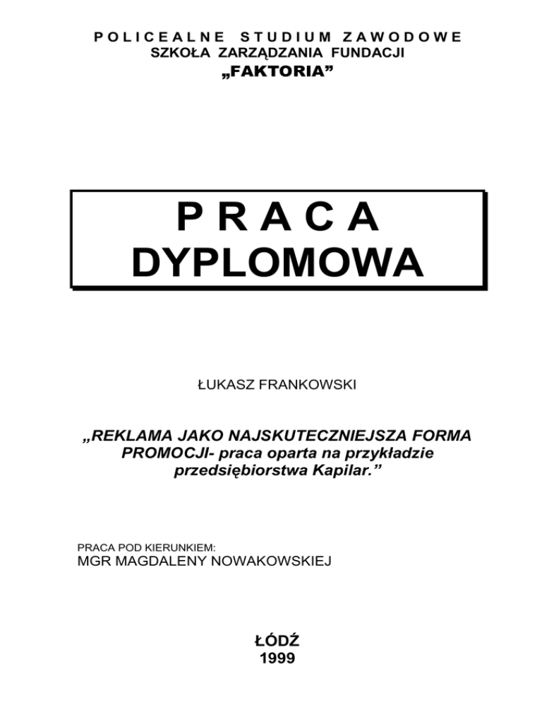 POLICEALNE STUDIUM ZAWODOWE SZKOŁA ZARZĄDZANIA FUNDACJI „FAKTORIA” PRACA DYPLOMOWA ŁUKASZ FRANKOWSKI „REKLAMA JAKO NAJSKUTECZNIEJSZA FORMA PROMOCJI- praca oparta na przykładzie przedsiębiorstwa Kapilar.” PRACA POD KIERUNKIEM: MGR MAGDALENY NOWAKOWSKIEJ ŁÓDŹ 1999 SPIS TREŚCI WSTĘP ________________________________________________________ 2 CZĘŚĆ PIERWSZA _______________________________________________ 5 PROMOCJA___________________________________________________________________ 6 SZTUKA POZYSKIWANIA NABYWCÓW. _________________________________________ 6 CELE PROMOCJI.____________________________________________________________ 8 SPOSOBY PROMOWANIA. ___________________________________________________ 11 REKLAMA ___________________________________________________________________ 14 REKLAMA JAKO NAJSKUTECZNIEJSZY SPOSÓB PROMOWANIA. __________________ 14 JAK WYGLĄDA DOBRY PRZEKAZ REKLAMOWY ? _______________________________ 16 JEDENAŚCIE PRZYKAZAŃ DAVIDA OGILVY. __________________________________________________16 TWORZENIE REKLAMY. _____________________________________________________ 19 OKREŚLENIE CELU PRZEKAZU REKLAMOWEGO. _________________________________________________19 OKREŚLENIE KOSZTÓW REKLAMY ZWIĄZANYCH BEZPOŚREDNIO Z WYZNACZONYM CELEM. __________19 DOKONANIE WYBORU ŚRODKÓW REKLAMY._____________________________________________________21 SPRAWDZENIE EFEKTÓW PRZEPROWADZONYCH DZIAŁAŃ. _______________________________________22 „DOBRY SMAK” REKLAMY. ___________________________________________________ 23 DLACZEGO PRZEDSIĘBIORSTWA WYDAJĄ CORAZ WIĘCEJ ŚRODKÓW NA REKLAMĘ ?25 CZĘŚĆ DRUGA _________________________________________________ 27 PRZEDSTAWIENIE P.P.H.U. KAPILAR.__________________________________________ 29 PRODUKTY KAPILARA. ______________________________________________________ 31 TERMOMETRY.______________________________________________________________________________31 PRZYRZĄDY DO DOMOWEJ PRODUKCJI WINA. __________________________________________________32 SZKŁO LABORATORYJNE. ____________________________________________________________________32 BOMBKI CHOINKOWE.________________________________________________________________________33 REKLAMA NEONOWA. ________________________________________________________________________33 SZKŁO UśYTKOWE. __________________________________________________________________________34 „IMAGE” KAPILARA- WIZERUNEK FIRMY I REKLAMA POŚREDNIA. _________________ 35 NAZWA. ____________________________________________________________________________________36 ZNAK GRAFICZNY- LOGO KAPILARA. ___________________________________________________________36 KROJE PISMA I KOLORYSTYKA. _______________________________________________________________38 WIZYTÓWKI. ________________________________________________________________________________40 PAPIER FIRMOWY.___________________________________________________________________________41 ULOTKA INFORMACYJNA._____________________________________________________________________42 UPOMINKI, GADśETY REKLAMOWE. ____________________________________________________________42 PLANSZE REKLAMOWE, SZYLDY. ______________________________________________________________43 OZNAKOWANIE ŚRODKÓW TRANSPORTU.______________________________________________________45 REKLAMA BEZPOŚREDNIA W FIRMIE KAPILAR. _________________________________ 47 TECHNIKA PISANIA TEKSTÓW REKLAMOWYCH.__________________________________________________50 GŁÓWNE ZASADY GRAFICZNEGO PROJEKTOWANIA ŚRODKÓW REKLAMY. __________________________52 LISTY REKLAMOWE. _________________________________________________________________________55 KATALOGI FIRMOWE, BROSZURY. _____________________________________________________________57 ZAKOŃCZENIE _________________________________________________ 60