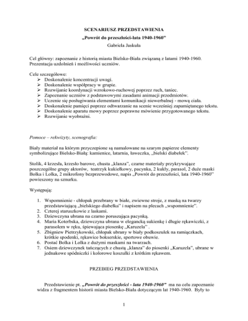 SCENARIUSZ PRZEDSTAWIENIA „Powrót do przeszłości-lata 1940-1960” Gabriela Jaskuła Cel główny: zapoznanie z historią miasta Bielsko-Biała związaną z latami 1940-1960. Prezentacja uzdolnień i możliwości uczniów. Cele szczegółowe: Doskonalenie koncentracji uwagi. Doskonalenie współpracy w grupie. Rozwijanie koordynacji wzrokowo-ruchowej poprzez ruch, taniec. Zapoznanie uczniów z podstawowymi zasadami animacji przedmiotów. Uczenie się posługiwania elementami komunikacji niewerbalnej - mową ciała. Doskonalenie pamięci poprzez odtwarzanie na scenie wcześniej zapamiętanego tekstu. Doskonalenie aparatu mowy poprzez poprawne mówienie przygotowanego tekstu. Rozwijanie wyobraźni. Pomoce – rekwizyty, scenografia: Biały materiał na którym przyczepione są namalowane na szarym papierze elementy symbolizujące Bielsko-Białą: kamienice, latarnia, ławeczka, „bielski diabełek”. Stolik, 4 krzesła, krzesło barowe, chusta „klanza”, czarne materiały przykrywające poszczególne grupy aktorów, teatrzyk kukiełkowy, pacynka, 2 kukły, parasol, 2 duże maski Bolka i Lolka, 2 mikrofony bezprzewodowe, napis „Powrót do przeszłości, lata 1940-1960” powieszony na sznurku. Występują: 1. Wspomnienie - chłopak przebrany w białe, zwiewne stroje, z maską na twarzy przedstawiającą „bielskiego diabełka” i napisem na plecach „wspomnienie”. 2. Czterej staruszkowie z laskami. 3. Dziewczyna ubrana na czarno poruszająca pacynką. 4. Maria Koterbska, dziewczyna ubrana w elegancką sukienkę i długie rękawiczki, z parasolem w ręku, śpiewająca piosenkę „Karuzela” . 5. Zbigniew Pietrzykowski, chłopak ubrany w biały podkoszulek na ramiączkach, krótkie spodenki, rękawice bokserskie, sportowe obuwie. 6. Postać Bolka i Lolka z dużymi maskami na twarzach. 7. Osiem dziewczynek tańczących z chustą „klanza” do piosenki „Karuzela”, ubrane w jednakowe spódniczki i kolorowe koszulki z krótkim rękawem. PRZEBIEG PRZEDSTAWIENIA Przedstawienie pt. „Powrót do przeszłości - lata 1940-1960” ma na celu zapoznanie widza z fragmentem historii miasta Bielsko-Biała dotyczącym lat 1940-1960. Były to 1 barwne i ciekawe czasy, w których powstał między innymi Teatr Lalek Banialuka, Studio Filmów Rysunkowych. To także okres działalności i sukcesów Zbigniewa Pietrzykowskiego i Marii Koterbskiej. Dlatego też czasy te stały się inspiracją do stworzenia tego przedstawienia. Przedstawienie ma charakter wspomnień, które snują czterej staruszkowie, spotykający się ze sobą na ławeczce i grający w szachy. Obecna rzeczywistość jest dla nich ponura i smutna dlatego też z tak wielką radością i ochotą powracają do lat swojej młodości. Pomaga im w tym postać „Wspomnienia”, która przenosi ich w przeszłość. Na scenie w różnych jej miejscach rozstawieni są aktorzy lub grupa aktorów związanych z poszczególnymi scenkami, przykryci czarnymi materiałami. Te poszczególne scenki to: Siedzący staruszkowie przy stoliku na tle namalowanej scenografii, grający w szachy i wspominający lata młodości. Postać leżących na ziemi Bolka i Lolka. Postać Marii Koterbskiej siedząca na wysokim krześle. Teatrzyk kukiełkowy, a za nim osoba poruszająca pacynką i kukłami. Postać boksera Zbigniewa Pietrzykowskiego. Dziewczynki siedzące w kole trzymające chustę „klanza”. Przedstawienie zaczyna się piosenką W. Gąsowskiego „Gdzie się podziały tamte prywatki”. Z czterech stron schodzą się staruszkowie, rozglądają się zniechęceni tą ponurą rzeczywistością. Ruszają w kierunku stolika i krzeseł, siadają, rozkładają szachy i mówi pierwszy staruszek: Dziadek I (zniechęcony) Chłopaki! Kiedyś to były czasy!!! Nasza młodość to tańce, piękne piosenki, dobry film, teatr. A teraz co? (pokazuje na osoby przykryte czarnymi materiałami) Szaro, buro i ponuro! Ach szkoda wspominać! Aż łza się w oku kreci! (zastygają w tzw. Stop klatce). Słychać mroczną muzykę. Na scenie pojawia się postać „Wspomnienia”, który tańczy wokół wszystkich. Staje obok staruszków, cichnie muzyka i mówi. Wspomnienie Wspomnienia są skarbnicą wiedzy. Poruszają nasze serca i dusze. A ja sprawię, że znów poczujecie się młodzi (wyciąga rękę w kierunku staruszków i rzuca czar do krótkiego fragmentu muzyki i staje za nimi w bezruchu). Staruszkowie ożywają i mówi kolejny z nich: Dziadek II(chwaląc się) Chłopaki! Ja zawsze lubiłem sport, ale nie tylko oglądać. Kiedyś grałem w piłkę, biegałem, jeździłem na nartach! A pamiętacie tego słynnego boksera Zbigniewa Pietrzykowskiego? Był wielokrotnym mistrzem Europy i reprezentował nasz bielski BBTS. To były czasy!!! (zastygają w stop klatce). „Wspomnienie” tańcząc do utworu „Tiger” zbliża się do postaci Zbigniewa Pietrzykowskiego, ściąga z niego czarny materiał i staje za nim w bezruchu. Bokser do tej samej muzyki udaje walkę bokserską, cichnie muzyka, zastyga, a ożywają staruszkowie. 2 Dziadek III (rozmarzony) A ja to lubiłem chodzić z dziewczyną do teatru, szczególnie do teatru lalek Banialuka, który w tym czasie zaczynał swoją działalność. Słychać bajkową muzykę. „Wspomnienie” tańcząc do tego utworu zbliża się do teatrzyku, ściąga z niego czarny materiał i staje za nim w bezruchu. W teatrzyku pojawia się pacynka, która mówi: Pacynka Dzień dobry! Mam na imię Kuba i urodziłem się w teatrze lalek Banialuka, który powstał 7 grudnia 1947r. Pierwsze przedstawienie jakie pokazaliśmy to „O Marysi sierotce i złotookiej sroczce”. Nie wiem czy wiecie, ale to przedstawienie zostało wystawione w budynku teatru, który wtedy był restauracją. Założycielami byli znani plastycy Jerzy Zitzman i Zenobiusz Zwolski. Zapraszam wszystkich do teatru lalek Banialuka (pojawiają się dwie kukły, które też zapraszają widzów). Cichnie muzyka, chowa się pacynka i kukły, ożywają staruszkowie i 