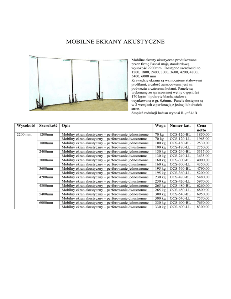 MOBILNE EKRANY AKUSTYCZNE Mobilne ekrany akustyczne produkowane przez firmę Pascal mają standardową wysokość 2200mm. Dostępne szerokości to 1200, 1800, 2400, 3000, 3600, 4200, 4800, 5400, 6000 mm Krawędzie ekranu są wzmocnione stalowymi profilami, a całość zamocowana jest na podwoziu z czterema kołami. Panele są wykonane ze sprasowanej wełny o gęstości 170 kg/m3 i pokryte blachą stalową ocynkowaną o gr. 0,6mm. Panele dostępne są w 2 wersjach z perforacją z jednej lub dwóch stron. Stopień redukcji hałasu wynosi R w=34dB Wysokość Szerokość Opis Waga Numer kat. Cena netto 2200 mm 70 kg 70 kg 100 kg 100 kg 130 kg 130 kg 160 kg 160 kg 195 kg 195 kg 230 kg 230 kg 265 kg 265 kg 300 kg 300 kg 330 kg 330 kg 1850,00 1965,00 2530,00 2750,00 3315,00 3635,00 4000,00 4350,00 4790,00 5200,00 5480,00 5970,00 6260,00 6800,00 6950,00 7570,00 7650,00 8300,00 1200mm 1800mm 2400mm 3000mm 3600mm 4200mm 4800mm 5400mm 6000mm Mobilny ekran akustyczny – perforowanie jednostronne Mobilny ekran akustyczny – perforowanie dwustronne Mobilny ekran akustyczny – perforowanie jednostronne Mobilny ekran akustyczny – perforowanie dwustronne Mobilny ekran akustyczny – perforowanie jednostronne Mobilny ekran akustyczny – perforowanie dwustronne Mobilny ekran akustyczny – perforowanie jednostronne Mobilny ekran akustyczny – perforowanie dwustronne Mobilny ekran akustyczny – perforowanie jednostronne Mobilny ekran akustyczny – perforowanie dwustronne Mobilny ekran akustyczny – perforowanie jednostronne Mobilny ekran akustyczny – perforowanie dwustronne Mobilny ekran akustyczny – perforowanie jednostronne Mobilny ekran akustyczny – perforowanie dwustronne Mobilny ekran akustyczny – perforowanie jednostronne Mobilny ekran akustyczny – perforowanie dwustronne Mobilny ekran akustyczny – perforowanie jednostronne Mobilny ekran akustyczny – perforowanie dwustronne OCS-120-BL OCS-120-LL OCS-180-BL OCS-180-LL OCS-240-BL OCS-240-LL OCS-300-BL OCS-300-LL OCS-360-BL OCS-360-LL OCS-420-BL OCS-420-LL OCS-480-BL OCS-480-LL OCS-540-BL OCS-540-LL OCS-600-BL OCS-600-LL