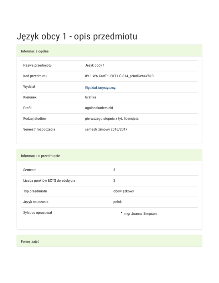 Język obcy 1 - opis przedmiotu Informacje ogólne Nazwa przedmiotu Język obcy 1 Kod przedmiotu 09.1-WA-GrafP-LEKT1-Ć-S14_pNadGen4V8LB Wydział Wydział Artystyczny Kierunek Grafika Profil ogólnoakademicki Rodzaj studiów pierwszego stopnia z tyt. licencjata Semestr rozpoczęcia semestr zimowy 2016/2017 Informacje o przedmiocie Semestr 3 Liczba punktów ECTS do zdobycia 2 Typ przedmiotu obowiązkowy Język nauczania polski Sylabus opracował Formy zajęć mgr Joanna Simpson Forma Liczba godzin w Liczba godzin w Liczba godzin w Liczba godzin w Forma zajęć semestrze tygodniu semestrze tygodniu zaliczenia (stacjonarne) (stacjonarne) (niestacjonarne) (niestacjonarne) 30 2 - - Ćwiczenia Zaliczenie na ocenę Cel przedmiotu Opanowanie przedmiotu na poziomie B1+ według skali Europejskiego systemu opisu kształcenia językowego oraz w zakresie niezbędnym dla potrzeb studiowania i wykonywania pracy zawodowej. Wymagania wstępne Znajomość języka angielskiego na poziomie A2 według skali Europejskiego Systemu Opisu Kształcenia Językowego. Zakres tematyczny 1. System Edukacji w Polsce i krajach anglosaskich - dyskusja w grupach w języku angielskim. 2. Test sprawdzający poziom wiedzy studenta z języka angielskiego i służący jako podstawa do dalszej oceny poczynionych przez studentów postępów w osiągnięciu wyższego poziomu - B1+ 3. Praca i życie za granicą - prowadzenie rozmów na temat życia, pracy, systemu edukacji i opieki zdrowotnej, systemu bankowego itp. w Wielkiej Brytanii. 4. Szukanie pracy - pisanie podań o pracę, dialogi - rozmowa kwalifikacyjna, pisanie podań o pracę i CV. 5. Kariera zawodowa - opisywanie własnej sylwetki profesjonalnej lub planów zawodowych na przyszlość. 6. Freelancing - wady i zalety pracy zawodowej artysty jako freelancer. 7. Testy z writing and reading na poziomie A2/B1 sprawdzające postępy studentów w osiągnięciu wyższego poziomu językowego wymaganego w danym semestrze. 8. Funkcjonowanie w życiu artystycznym - dyskusje na temat organizacji wystaw, happeningów artystycznych. 9. Test zaliczeniowy. 10. Prezenytacja indywidualna z użyciem PowerPoint. Metody kształcenia Metodyka komunikacyjna nauczania języka obcego. Korzystanie z literatury przedmiotu oraz profesjonalnych źródeł internetowych. Efekty kształcenia i metody weryfikacji osiągania efektów kształcenia Opis efektu Symbole Metody weryfikacji Forma zajęć efektów Student powinien posiadać K_U24 aktywność w trakcie zajęć umiejętności językowe na kolokwium poziomie B1+ zgodnie z obserwacja i ocena aktywności na ESOKJ. zajęciach Ćwiczenia praca pisemna test test końcowy przygotowanie indywidualnych prezentacji w PowerPoint na dowolnie wybrany temat - zgodnie z kierunkiem studiów studenta Warunki zaliczenia Uzyskanie conajmniej 60% w wynikach testów oraz w ramach bieżącej kontroli K_U24. Obciążenie pracą Obciążenie pracą Studia Studia niestacjonarne stacjonarne (w godz.) (w godz.) Godziny kontaktowe (udział w zajęciach; konsultacjach; egzaminie, itp.) 30 - Samodzielna praca studenta (przygotowanie do: zajęć, kolokwium, 30 - Łącznie 60 - Punkty ECTS Studia Studia niestacjonarne egzaminu; studiowanie literatury przygotowanie: pracy pisemnej, projektu, prezentacji, raportu, wystąpienia; itp.) stacjonarne Zajęcia z udziałem nauczyciela akademickiego 1 - Zajęcia bez udziału nauczyciela akademickiego 1 - Łącznie 2 - Literatura podstawowa 1. Oxenden, C., 2009 New English File. Advanced Student's Book., University Press, Oxford University. 2. Davis, P. and Falla, I., 2008, FCE Result, University Press, Oxford. 3. Hughes, D and Lawlor, P., 2007, ESOL EXEMPLARS, DfES Publications, Nottingham 4. O'conne, l Sue. 1993. Focus on Advanced English C.A.E. Longman. Literatura uzupełniająca Uwagi Zmodyfikowane przez dr Katarzyna Dziuba (ostatnia modyfikacja: 05-09-2016 18:25)