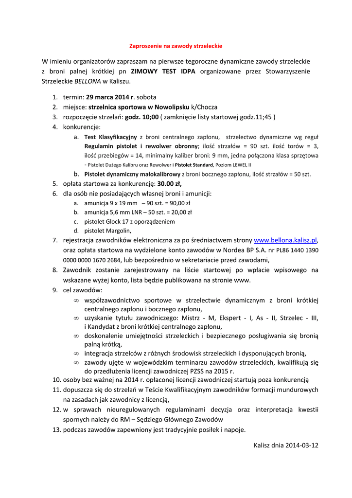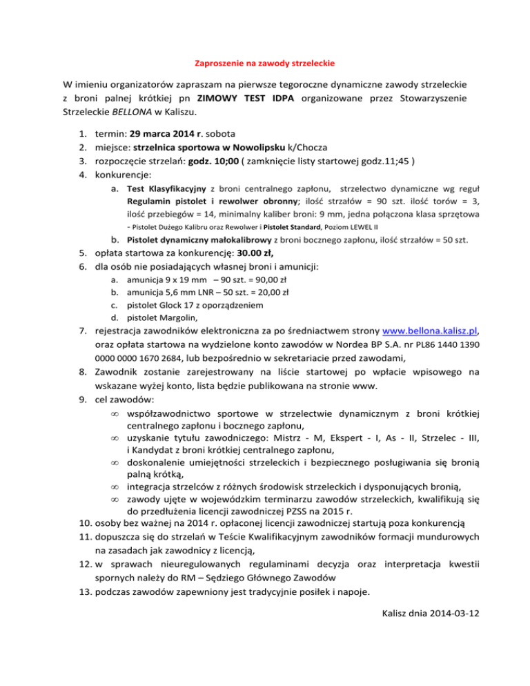 Zaproszenie na zawody strzeleckie W imieniu organizatorów zapraszam na pierwsze tegoroczne dynamiczne zawody strzeleckie z broni palnej krótkiej pn ZIMOWY TEST IDPA organizowane przez Stowarzyszenie Strzeleckie BELLONA w Kaliszu. 1. 2. 3. 4. termin: 29 marca 2014 r. sobota miejsce: strzelnica sportowa w Nowolipsku k/Chocza rozpoczęcie strzelań: godz. 10;00 ( zamknięcie listy startowej godz.11;45 ) konkurencje: a. Test Klasyfikacyjny z broni centralnego zapłonu, strzelectwo dynamiczne wg reguł Regulamin pistolet i rewolwer obronny; ilość strzałów = 90 szt. ilość torów = 3, ilość przebiegów = 14, minimalny kaliber broni: 9 mm, jedna połączona klasa sprzętowa - Pistolet Dużego Kalibru oraz Rewolwer i Pistolet Standard, Poziom LEWEL II b. Pistolet dynamiczny małokalibrowy z broni bocznego zapłonu, ilość strzałów = 50 szt. 5. opłata startowa za konkurencję: 30.00 zł, 6. dla osób nie posiadających własnej broni i amunicji: a. b. c. d. amunicja 9 x 19 mm – 90 szt. = 90,00 zł amunicja 5,6 mm LNR – 50 szt. = 20,00 zł pistolet Glock 17 z oporządzeniem pistolet Margolin, 7. rejestracja zawodników elektroniczna za po średniactwem strony www.bellona.kalisz.pl, oraz opłata startowa na wydzielone konto zawodów w Nordea BP S.A. nr PL86 1440 1390 0000 0000 1670 2684, lub bezpośrednio w sekretariacie przed zawodami, 8. Zawodnik zostanie zarejestrowany na liście startowej po wpłacie wpisowego na wskazane wyżej konto, lista będzie publikowana na stronie www. 9. cel zawodów: • współzawodnictwo sportowe w strzelectwie dynamicznym z broni krótkiej centralnego zapłonu i bocznego zapłonu, • uzyskanie tytułu zawodniczego: Mistrz - M, Ekspert - I, As - II, Strzelec - III, i Kandydat z broni krótkiej centralnego zapłonu, • doskonalenie umiejętności strzeleckich i bezpiecznego posługiwania się bronią palną krótką, • integracja strzelców z różnych środowisk strzeleckich i dysponujących bronią, • zawody ujęte w wojewódzkim terminarzu zawodów strzeleckich, kwalifikują się do przedłużenia licencji zawodniczej PZSS na 2015 r. 10. osoby bez ważnej na 2014 r. opłaconej licencji zawodniczej startują poza konkurencją 11. dopuszcza się do strzelań w Teście Kwalifikacyjnym zawodników formacji mundurowych na zasadach jak zawodnicy z licencją, 12. w sprawach nieuregulowanych regulaminami decyzja oraz interpretacja kwestii spornych należy do RM – Sędziego Głównego Zawodów 13. podczas zawodów zapewniony jest tradycyjnie posiłek i napoje. Kalisz dnia 2014-03-12 REGULAMIN STRZELAŃ DYNAMICZNYCH W KONKURENCJI PISTOLET I REWOLWER OBRONNY ZASADY OGÓLNE 1. Celem konkurencji strzelectwa dynamicznego Pistolet i rewolwer obronny jest współzawodnictwo sportowe z użyciem broni krótkiej centralnego zapłonu. 2. Zawodnicy muszą postępować na torach strzeleckich zgodnie z ich opisami i założeniami ora zobowiązani są przestrzegać zasad bezpieczeństwa i sportowego zachowania. 2.1 Zabrania się indywidualnego zapoznawania z torami strzeleckimi. 2.2 Zabrania się mierzenia do celów na sucho na torze strzeleckim za pomocą jakiegokolwiek przedmiotu lub jakiejkolwiek części ręki. Zabronione jest również treningowe mierzenie rozładowaną lub załadowaną bronią do celów na torze strzeleckim przed sygnałem startowym. 2.3 Zawodnicy muszą wykorzystywać dostępne na danym torze strzeleckim zasłony. 2.4 Żaden z zawodników nie może powtarzać toru strzeleckiego z powodu błędu zawodnika lub awarii broni. Powtarzanie toru może nastąpić w przypadku awarii wyposażenia strzelnicy lub przeszkodzenia zawodnikowi przez sędziego. 2.5 Zawodnik musi używać przez całe zawody tej samej broni. Jeżeli broń ta uległa awarii, zawodnik może użyć innej, pod warunkiem jednak, że będzie spełniała wymogi danej klasy sprzętowej, w której dotychczas brał udział zawodnik. Ostateczna decyzja w tym zakresie należy do RM. 2.6 Żaden zawodnik nie może mieć przy sobie lub używać dwóch jednostek broni, chyba że co innego wynika z opisu danego toru strzeleckiego. 2.7 Broń musi być używana zgodnie z jej przeznaczeniem i konstrukcją oraz być załadowana zgodnie z wymogami odpowiedniej klasy sprzętowej. Magazynki o dużej pojemności muszą być ładowane do maksymalnej dopuszczalnej w danej klasie sprzętowej ilości nabojów. 2.8 Broń używana podczas zawodów musi być sprawna i bezpieczna w użytkowaniu. RM będzie wymagał wycofania broni, która może być niesprawna lub niebezpieczna w użytkowaniu. W przypadku, gdy broń nie może być załadowana lub rozładowana z powodu wadliwych lub popsutych mechanizmów, zawodnik musi zawiadomić o tym RO, który podejmie najbezpieczniejsze w jego ocenie działania. 2.9 Na torach wydawane są następujące komendy: 2.9.1 „ŁADUJ I PRZYGOTUJ SIĘ” lub „PRZYGOTUJ SIĘ” – w przypadku startu z bronią niezaładowaną. Wydanie tej komendy rozpoczyna przebieg na torze. Pod bezpośrednim nadzorem RO zawodnik staje twarzą do kulochwytu głównego lub w innym bezpiecznym kierunku wskazanym przez RO, zakłada ochronniki słuchu i wzroku, przygotowuje broń do startu na torze w zgodzie z wymaganiami pisemnego opisu toru. Po zakończeniu przygotowań, zawodnik zajmuje pozycję startową i przyjmuje wymaganą postawę startową. Od tej pory dalsze czynności wykonuje na polecenie RO. 2.9.1.1 Po wydaniu komendy „ŁADUJ I PRZYGOTUJ SIĘ” lub „PRZYGOTUJ SIĘ”, zawodnikowi nie wolno opuścić stanowiska startowego przed wydaniem sygnału startowego bez uprzedniej zgody i bezpośredniego nadzoru RO. Naruszenie tego wymogu skutkuje za pierwszym razem w czasie zawodów ostrzeżeniem, a w razie powtórzenia karą dyskwalifikacji. 2.9.2 „JESTEŚ GOTÓW?” - W braku negatywnej odpowiedzi zawodnika RO uznaje, że zawodnik rozumie opis toru i jest gotów na sygnał startowy rozpocząć przebieg na torze. Jeśli jest inaczej, zawodnik musi wyraźnie powiedzieć „NIE JESTEM