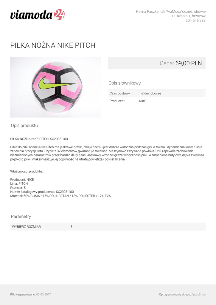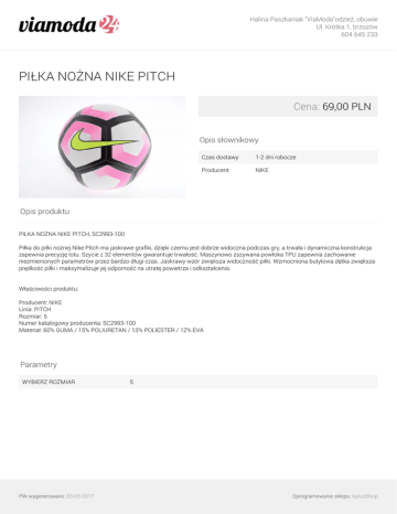 Halina Paszkaniak "ViaModa"odzież, obuwie Ul. Krótka 1, brzozów 604 645 233 PIŁKA NOŻNA NIKE PITCH Cena: 69,00 PLN Opis słownikowy Czas dostawy 1-2 dni robocze Producent NIKE Opis produktu PIŁKA NOŻNA NIKE PITCH, SC2993-100 Piłka do piłki nożnej Nike Pitch ma jaskrawe grafiki, dzięki czemu jest dobrze widoczna podczas gry, a trwała i dynamiczna konstrukcja zapewnia precyzję lotu. Szycie z 32 elementów gwarantuje trwałość. Maszynowo zszywana powłoka TPU zapewnia zachowanie niezmienionych parametrów przez bardzo długi czas. Jaskrawy wzór zwiększa widoczność piłki. Wzmocniona butylowa dętka zwiększa prędkość piłki i maksymalizuje jej odporność na utratę powietrza i odkształcenia. Właściwości produktu: Producent: NIKE Linia: PITCH Rozmiar: 5 Numer katalogowy producenta: SC2993-100 Materiał: 60% GUMA / 15% POLIURETAN / 13% POLIESTER / 12% EVA Parametry WYBIERZ ROZMIAR Plik wygenerowano: 03-03-2017 5 Oprogramowanie sklepu: AptusShop Halina Paszkaniak "ViaModa"odzież, obuwie Ul. Krótka 1, brzozów 604 645 233 Galeria Plik wygenerowano: 03-03-2017 Powered by TCPDF (www.tcpdf.org) Oprogramowanie sklepu: AptusShop