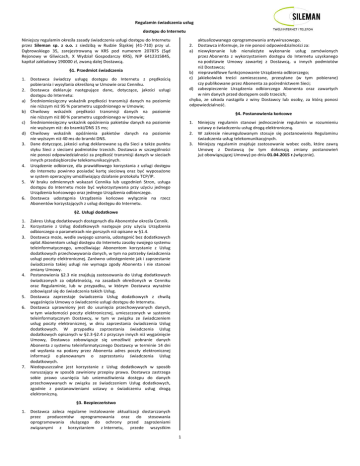 Regulamin świadczenia usług dostępu do Internetu Niniejszy regulamin określa zasady świadczenia usługi dostępu do Internetu przez Sileman sp. z o.o. z siedzibą w Rudzie Śląskiej (41-710) przy ul. Dąbrowskiego 35, zarejestrowaną w KRS pod numerem 207875 (Sąd Rejonowy w Gliwicach, X Wydział Gospodarczy KRS), NIP 6412315845, kapitał zakładowy 190000 zł, zwaną dalej Dostawcą. aktualizowanego oprogramowania antywirusowego. 2. Dostawca informuje, że nie ponosi odpowiedzialności za: a) niewykonanie lub nienależyte wykonanie usług zamówionych przez Abonenta z wykorzystaniem dostępu do Internetu uzyskanego na podstawie Umowy zawartej z Dostawcą, u innych podmiotów niż Dostawca; b) nieprawidłowe funkcjonowanie Urządzenia odbiorczego; c) jakiekolwiek treści zamieszczane, przesyłane (w tym pobierane) czy publikowane przez Abonenta za pośrednictwem Sieci; d) zabezpieczenie Urządzenia odbiorczego Abonenta oraz zawartych w nim danych przed dostępem osób trzecich; chyba, ze szkoda nastąpiła z winy Dostawcy lub osoby, za którą ponosi odpowiedzialność. §1. Przedmiot świadczenia 1. Dostawca świadczy usługę dostępu do Internetu z prędkością pobierania i wysyłania określoną w Umowie oraz Cenniku. 2. Dostawca deklaruje następujące dane, dotyczące, jakości usługi dostępu do Internetu: a) Średniomiesięczny wskaźnik prędkości transmisji danych na poziomie nie niższym niż 95 % parametru uzgodnionego w Umowie; b) Chwilowy wskaźnik prędkości transmisji danych na poziomie nie niższym niż 80 % parametru uzgodnionego w Umowie; c) Średniomiesięczny wskaźnik opóźnienia pakietów danych na poziomie nie wyższym niż: do bramki/DNS 15 ms; d) Chwilowy wskaźnik opóźnienia pakietów danych na poziomie nie wyższym niż 40 ms do bramki DNS. 3. Dane dotyczące, jakości usług deklarowane są dla Sieci a także punktu styku Sieci z sieciami podmiotów trzecich. Dostawca w szczególności nie ponosi odpowiedzialności za prędkość transmisji danych w sieciach innych przedsiębiorców telekomunikacyjnych. 4. Urządzenie odbiorcze, dla prawidłowego korzystania z usługi dostępu do Internetu powinno posiadać kartę sieciową oraz być wyposażone w system operacyjny umożliwiający działanie protokołu TCP/IP. 5. W braku odmiennych wskazań Cennika lub uzgodnień Stron, usługa dostępu do Internetu może być wykorzystywana przy użyciu jednego Urządzenia końcowego oraz jednego Urządzenia odbiorczego. 6. Dostawca udostępnia Urządzenia końcowe wyłącznie na rzecz Abonentów korzystających z usług dostępu do Internetu. §4. Postanowienia końcowe 1. 2. 3. §2. Usługi dodatkowe 1. 2. 3. 4. 5. 6. 7. Zakres Usług dodatkowych dostępnych dla Abonentów określa Cennik. Korzystanie z Usług dodatkowych następuje przy użyciu Urządzenia odbiorczego o parametrach nie gorszych niż opisane w §1.4. Dostawca może, wedle swojego uznania, udostępnić bez dodatkowych opłat Abonentom usługi dostępu do Internetu zasoby swojego systemu teleinformatycznego, umożliwiając Abonentom korzystanie z Usług dodatkowych przechowywania danych, w tym na potrzeby świadczenia usługi poczty elektronicznej. Zarówno udostępnienie jak i zaprzestanie świadczenia takiej usługi nie wymaga zgody Abonenta i nie stanowi zmiany Umowy. Postanowienia §2.3 nie znajdują zastosowania do Usług dodatkowych świadczonych za odpłatnością, na zasadach określonych w Cenniku oraz Regulaminie, lub w przypadku, w którym Dostawca wyraźnie zobowiązał się do świadczenia takich Usług. Dostawca zaprzestaje świadczenia Usług dodatkowych z chwilą wygaśnięcia Umowy o świadczenie usługi dostępu do Internetu. Dostawca uprawniony jest do usunięcia przechowywanych danych, w tym wiadomości poczty elektronicznej, umieszczonych w systemie teleinformatycznym Dostawcy, w tym w związku ze świadczeniem usług poczty elektronicznej, w dniu zaprzestania świadczenia Usług dodatkowych. W przypadku zaprzestania świadczenia Usług dodatkowych opisanych w §2.3-§2.4 z przyczyn innych niż wygaśnięcie Umowy, Dostawca zobowiązuje się umożliwić pobranie danych Abonenta z systemu teleinformatycznego Dostawcy w terminie 14 dni od wysłania na podany przez Abonenta adres poczty elektronicznej informacji o planowanym o zaprzestaniu świadczenia Usług dodatkowych. Niedopuszczalne jest korzystanie z Usług dodatkowych w sposób naruszający w sposób zawiniony przepisy prawa. Dostawca zastrzega sobie prawo usunięcia lub uniemożliwienia dostępu do danych przechowywanych w związku ze świadczeniem Usług dodatkowych, zgodnie z postanowieniami ustawy o świadczeniu usług drogą elektroniczną. §3. Bezpieczeństwo 1. Dostawca zaleca regularne instalowanie aktualizacji dostarczanych przez producentów oprogramowania oraz do stosowania oprogramowania służącego do ochrony przed zagrożeniami związanymi z korzystaniem z Internetu, przede wszystkim 1 Niniejszy regulamin stanowi jednocześnie regulamin w rozumieniu ustawy o świadczeniu usług drogą elektroniczną. W zakresie nieuregulowanym stosuje się postanowienia Regulaminu świadczenia usług telekomunikacyjnych. Niniejszy regulamin znajduje zastosowanie wobec osób, które zawrą Umowę z Dostawcą (w tym dokonają zmiany postanowień już obowiązującej Umowy) po dniu 01.04.2015 r.(włącznie).