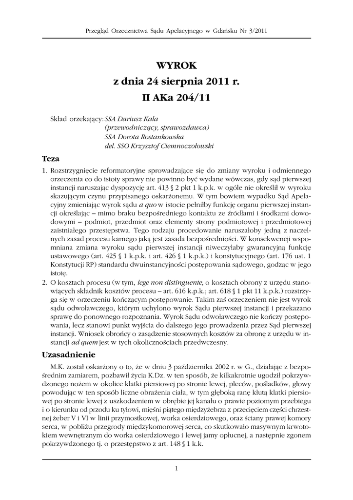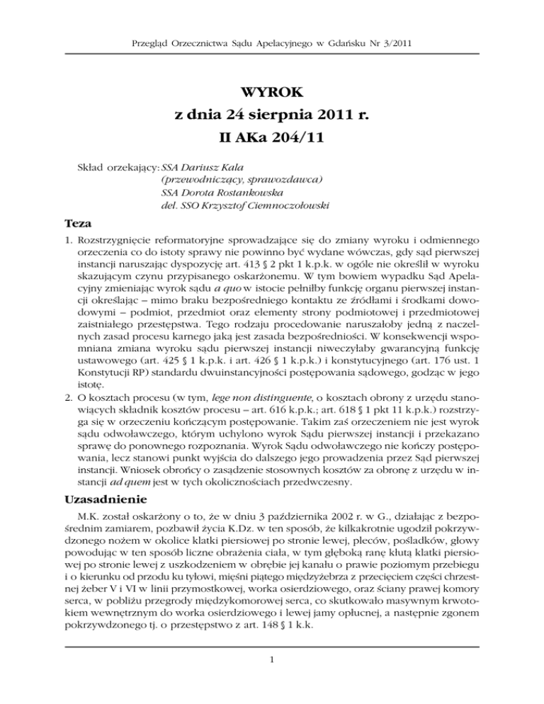 Przegl¹d Orzecznictwa S¹du Apelacyjnego w Gdañsku Nr 3/2011 WYROK z dnia 24 sierpnia 2011 r. II AKa 204/11 Sk³ad orzekaj¹cy:SSA Dariusz Kala (przewodnicz¹cy, sprawozdawca) SSA Dorota Rostankowska del. SSO Krzysztof Ciemnoczo³owski Teza 1. Rozstrzygniêcie reformatoryjne sprowadzaj¹ce siê do zmiany wyroku i odmiennego orzeczenia co do istoty sprawy nie powinno byæ wydane wówczas, gdy s¹d pierwszej instancji naruszaj¹c dyspozycjê art. 413 § 2 pkt 1 k.p.k. w ogóle nie okreli³ w wyroku skazuj¹cym czynu przypisanego oskar¿onemu. W tym bowiem wypadku S¹d Apelacyjny zmieniaj¹c wyrok s¹du a quo w istocie pe³ni³by funkcjê organu pierwszej instancji okrelaj¹c mimo braku bezporedniego kontaktu ze ród³ami i rodkami dowodowymi podmiot, przedmiot oraz elementy strony podmiotowej i przedmiotowej zaistnia³ego przestêpstwa. Tego rodzaju procedowanie narusza³oby jedn¹ z naczelnych zasad procesu karnego jak¹ jest zasada bezporednioci. W konsekwencji wspomniana zmiana wyroku s¹du pierwszej instancji niweczy³aby gwarancyjn¹ funkcjê ustawowego (art. 425 § 1 k.p.k. i art. 426 § 1 k.p.k.) i konstytucyjnego (art. 176 ust. 1 Konstytucji RP) standardu dwuinstancyjnoci postêpowania s¹dowego, godz¹c w jego istotê. 2. O kosztach procesu (w tym, lege non distinguente, o kosztach obrony z urzêdu stanowi¹cych sk³adnik kosztów procesu art. 616 k.p.k.; art. 618 § 1 pkt 11 k.p.k.) rozstrzyga siê w orzeczeniu koñcz¹cym postêpowanie. Takim za orzeczeniem nie jest wyrok s¹du odwo³awczego, którym uchylono wyrok S¹du pierwszej instancji i przekazano sprawê do ponownego rozpoznania. Wyrok S¹du odwo³awczego nie koñczy postêpowania, lecz stanowi punkt wyjcia do dalszego jego prowadzenia przez S¹d pierwszej instancji. Wniosek obroñcy o zas¹dzenie stosownych kosztów za obronê z urzêdu w instancji ad quem jest w tych okolicznociach przedwczesny. Uzasadnienie M.K. zosta³ oskar¿ony o to, ¿e w dniu 3 padziernika 2002 r. w G., dzia³aj¹c z bezporednim zamiarem, pozbawi³ ¿ycia K.Dz. w ten sposób, ¿e kilkakrotnie ugodzi³ pokrzywdzonego no¿em w okolice klatki piersiowej po stronie lewej, pleców, poladków, g³owy powoduj¹c w ten sposób liczne obra¿enia cia³a, w tym g³êbok¹ ranê k³ut¹ klatki piersiowej po stronie lewej z uszkodzeniem w obrêbie jej kana³u o prawie poziomym przebiegu i o kierunku od przodu ku ty³owi, miêni pi¹tego miêdzy¿ebrza z przeciêciem czêci chrzestnej ¿eber V i VI w linii przymostkowej, worka osierdziowego, oraz ciany prawej komory serca, w pobli¿u przegrody miêdzykomorowej serca, co skutkowa³o masywnym krwotokiem wewnêtrznym do worka osierdziowego i lewej jamy op³ucnej, a nastêpnie zgonem pokrzywdzonego tj. o przestêpstwo z art. 148 § 1 k.k. 1 Przegl¹d Orzecznictwa S¹du Apelacyjnego w Gdañsku Nr 3/2011 S¹d Okrêgowy w G. wyrokiem z dnia 9 marca 2011 r. I. oskar¿onego M.K. uzna³ za winnego pope³nienia zbrodni z art. 148 § 1 k.k. i za to na podstawie art. 148 § 1 k.k. skaza³ go na karê 12 lat pozbawienia wolnoci. II. na podstawie art. 63 § 1 k.k. na poczet orzeczonej kary pozbawienia wolnoci zaliczy³ oskar¿onemu okres rzeczywistego pozbawienia wolnoci w sprawie od dnia 3 padziernika 2002 r. do dnia 16 kwietnia 2008 r. i od dnia 16 kwietnia 2009 r. do dnia 9 marca 2011 r. Ponadto powy¿szym wyrokiem rozstrzygniêto o kosztach procesu, w tym kosztach nieop³aconej pomocy prawnej udzielonej z urzêdu oskar¿onemu. Apelacje od powy¿szego wyroku wnieli Prokurator Prokuratury Rejonowej G.-O. w G. i obroñca oskar¿onego. Prokurator zaskar¿y³ powy¿sze orzeczenie w ca³oci na niekorzyæ oskar¿onego i na zasadzie art. 427 § 1 i 2 k.p.k. oraz art. 438 pkt 2 k.p.k. wyrokowi zarzuci³ obrazê przepisów prawa procesowego maj¹c¹ wp³yw na treæ orzeczenia, tj. przepisu art. 413 § 2 pkt 1 k.p.k. poprzez uznanie w pkt. I sentencji wydanego wyroku oskar¿onego M.K. za winnego pope³nienia bli¿ej nieokrelonej zbrodni kwalifikowanej z art. 148 § 1 k.k. zamiast prawid³owego i precyzyjnego uznania, i¿ oskar¿ony jest winnym pope³nienia zbrodni z art. 148 § 1 k.k. okrelonej we wniesionym przeciwko niemu akcie oskar¿enia, b¹d jest winnym pope³nienia czynu polegaj¹cego na tym, ¿e w dniu 3 padziernika 2002 r. w G. dzia³aj¹c z bezporednim zamiarem pozbawi³ ¿ycia K.Dz. w ten sposób, i¿ kilkakrotnie ugodzi³ pokrzywdzonego no¿em w okolice klatki piersiowej po stronie lewej, pleców, poladków, g³owy, powoduj¹c w ten sposób liczne obra¿enia cia³a, w tym g³êbok¹ ranê k³ut¹ klatki piersiowej po stronie lewej z uszkodzeniem w obrêbie jej kana³u o prawie poziomym przebiegu i o kierunku od przodu ku ty³owi, miêni pi¹tego miêdzy¿ebrza z przeciêciem czêci chrzestnej ¿eber V i VI w linii przymostkowej, worka osierdziowego oraz ciany prawej komory serca, w pobli¿u przegrody miêdzykomorowej serca, co skutkowa³o masywnym krwotokiem wewnêtrznym do worka osierdziowego i lewej jamy op³ucnej, a nastêpnie zgonem pokrzywdzonego, tj. przestêpstwa z art. 148 § 1 k.k. Podnosz¹c powy¿szy zarzut na zasadzie art. 427 § 1 k.p.k. i art. 437 § 1 i 2 k.p.k. prokurator wniós³ o zmianê wyroku w zaskar¿onej czêci poprzez doprecyzowanie, i¿ oskar¿ony jest winnym pope³nienia zbrodni z art. 148 § 1 k.k. okrelonej we wniesionym przeciwko niemu akcie oskar¿enia, b¹d jest winnym pope³nienia czynu polegaj¹cego na tym, ¿e w dniu 3 padziernika 2002 r. w G. dzia³aj¹c z bezporednim zamiarem pozbawi³ ¿ycia K.Dz. w ten sposób, i¿ kilkakrotnie ugodzi³ pokrzywdzonego no¿em w okolice klatki piersiowej po stronie lewej, pleców, poladków, g³owy, powoduj¹c w ten sposób liczne obra¿enia cia³a, w tym g³êbok¹ ranê k³ut¹ klatki piersiowej po stronie lewej z uszkodzeniem w obrêbie jej kana³u o prawie poziomym przebiegu i o kierunku od przodu ku ty³owi, miêni pi¹tego miêdzy¿ebrza z przeciêciem czêci chrzestnej ¿eber V i VI w linii przymostkowej, worka osierdziowego oraz ciany prawej