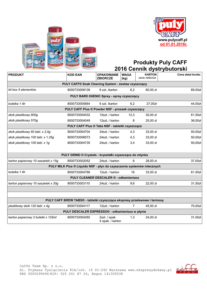 www.pulycaff.pl od 01.01.2016r. Produkty Puly CAFF 2016 Cennik dystrybutorski PRODUKT KOD EAN OPAKOWANIE ZBIORCZE KARTON cena netto/szt. WAGA (kg) Cena detal brutto. PULY CAFF® Soak Cleaning System - zestaw czyszczący kit box 5 elementów 8000733008139 6 szt. /karton 6,2 60,00 zł 89,00zł 27,00zł 44,00zł PULY BAR® IGIENIC Spray - spray czyszczący butelka 1 litr 8000733005664 6 szt. /karton 6,2 PULY CAFF Plus ® Powder NSF - proszek czyszczący słoik plastikowy 900g 8000733004032 12szt. / karton 12,3 30,00 zł 61,50zł słoik plastikowy 570g 8000733004049 12szt. / karton 8 25,00 zł 36,00zł PULY CAFF Plus ® Tabs NSF - tabletki czyszczące słoik plastikowy 60 tabl. x 2,5g 8000733004704 24szt. / karton 4,3 33,00 zł 50,00zł słoik plastikowy 100 tabl. x 1,35g 8000733008573 24szt. / karton 4,3 33,00 zł 50,00zł słoik plastikowy 100 tabl. x 1g 8000733004735 24szt. / karton 3,4 33,00 zł 50,00zł PULY GRIND ® Crystals - kryształki czyszczące do młynka karton papierowy 10 saszetek x 15g 8000733002052 24szt. / karton 6 28,00 zł 37,00zł PULY MILK Plus ® Liquido NSF - płyn do czyszczenia systemów mlecznych butelka 1 litr 8000733004766 12szt. / karton 16 33,00 zł 61.50zł 22,00 zł 31,50zł PULY CLEANER DESCALER ® - odkamieniacz karton papierowy 10 saszetek x 30g 8000733003110 24szt. / karton 9,6 PULY CAFF BREW TABS® - tabletki czyszczące ekspresy przelewowe i termosy plastikowy słoik 120 tabl. x 4g 8000733004117 12szt. / karton 7 45,50 zł 70,00zł PULY DESCALER ESPRESSO® - odkamieniacz w płynie karton papierowy 2 butelki x 125ml 8000733004292 2szt. / opak. 4 opak. / karton 1,3 24,00 zł Caffe Team Sp. z o.o. Al. Prymasa Tysiąclecia 81A/lok. 16 01-242 Warszawa www.ekspresydokawy.pl KRS 0000299496 NIP: 525 241 87 24, Regon 141309538 31,00zł PULY CAFF® Soak Cleaning System - zestaw czyszczący kit box 5 elementów PULY BAR® Igienic Spray – spray czyszczący butelka 1 litr PULY CAFF Plus ® Powder NSF - proszek czyszczący słoik plastikowy 900g/570g Caffe Team Sp. z o.o. Al. Prymasa Tysiąclecia 81A/lok. 16 01-242 Warszawa www.ekspresydokawy.pl KRS 0000299496 NIP: 525 241 87 24, Regon 141309538 PULY CAFF Plus ® Tabs NSF - tabletki czyszczące słoik plastikowy 60 tabl. x 2,5g słoik plastikowy 100 tabl. x 1,35g słoik plastikowy 100 tabl. x 1g PULY GRIND ® Crystals - kryształki czyszczące do młynka karton papierowy 10x 15g Caffe Team Sp. z o.o. Al. Prymasa Tysiąclecia 81A/lok. 16 01-242 Warszawa www.ekspresydokawy.pl KRS 0000299496 NIP: 525 241 87 24, Regon 141309538 PULY MILK Plus ® Liquido NSF - płyn do czyszczenia systemów mlecznych butelka 1 litr PULY CLEANER DESCALER ® - odkamieniacz karton papierowy 10 saszetek x 30g CALCINET ® Polvere - profesjonalny proszek odkamieniający (gorąca i zimna woda) plastikowy słoik 1kg Caffe Team Sp. z o.o. Al. Prymasa Tysiąclecia 81A/lok. 16 01-242 Warszawa www.ekspresydokawy.pl KRS 0000299496 NIP: 525 241 87 24, Regon 141309538 PULY CAFF BREW TABS® - tabletki czyszczące ekspresy przelewowe i termosy plastikowy słoik 120 tabl. x 4g PULY DESCALER ESPRESSO® - odkamieniacz w płynie Karton papierowy 2 butelki plastikowe x 125ml Caffe Team Sp. z o.o. Al. Prymasa Tysiąclecia 81A/lok. 16 01-242 Warszawa www.ekspresydokawy.pl KRS 0000299496 NIP: 525 241 87 24, Regon 141309538