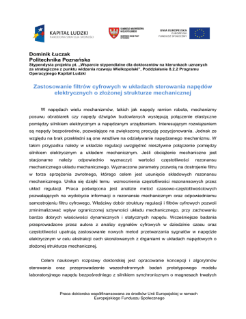 Dominik Łuczak Politechnika Poznańska Stypendysta projektu pt. „Wsparcie stypendialne dla doktorantów na kierunkach uznanych za strategiczne z punktu widzenia rozwoju Wielkopolski”, Poddziałanie 8.2.2 Programu Operacyjnego Kapitał Ludzki Zastosowanie filtrów cyfrowych w układach sterowania napędów elektrycznych o złożonej strukturze mechanicznej W napędach wielu mechanizmów, takich jak napędy ramion robota, mechanizmy posuwu obrabiarek czy napędy dźwigów budowlanych występują połączenie elastyczne pomiędzy silnikiem elektrycznym a napędzanym urządzeniem. Interesującym rozwiązaniem są napędy bezpośrednie, pozwalające na zwiększoną precyzję pozycjonowania. Jednak ze względu na brak przekładni są one wrażliwe na odziaływanie napędzanego mechanizmu. W takim przypadku należy w układzie regulacji uwzględnić niesztywne połączenie pomiędzy silnikiem elektrycznym a układem mechanicznym. Jeśli obciążenie mechaniczne jest stacjonarne należy odpowiednio wyznaczyć wartości częstotliwości rezonansu mechanicznego układu mechanicznego. Wyznaczone parametry pozwolą na dostrojenie filtru w torze sprzężenia zwrotnego, którego celem jest usunięcie składowych rezonansu mechanicznego. Unika się dzięki temu wzmocnienia częstotliwości rezonansowych przez układ regulacji. Praca poświęcona jest analizie metod czasowo-częstotliwościowych pozwalających na wydobycie informacji o rezonansie mechanicznym oraz odpowiedniemu samostrojeniu filtru cyfrowego. Właściwy dobór struktury regulacji i filtrów cyfrowych pozwoli zminimalizować wpływ ograniczonej sztywności układu mechanicznego, przy zachowaniu bardzo dobrych właściwości dynamicznych i statycznych napędu. Wcześniejsze badania przeprowadzone przez autora z analizy sygnałów cyfrowych w dziedzinie czasu oraz częstotliwości upatrują zastosowanie nowych metod przetwarzania sygnałów w napędzie elektrycznym w celu ekstrakcji cech skorelowanych z drganiami w układach napędowych o złożonej strukturze mechanicznej. Celem naukowym rozprawy doktorskiej jest opracowanie koncepcji i algorytmów sterowania oraz przeprowadzenie wszechstronnych badań prototypowego modelu laboratoryjnego napędu bezpośredniego z silnikiem synchronicznym o magnesach trwałych Praca doktorska współfinansowana ze środków Unii Europejskiej w ramach Europejskiego Funduszu Społecznego o bardzo dobrych właściwościach dynamicznych i statycznych. W ramach przeprowadzonych badań rozwiązane zostało następujące główne zadanie badawcze, związane z uzyskaniem dużej precyzji i dynamiki sterowania: opracowanie odpornego układu sterowania dla napędu o złożonej strukturze mechanicznej na zmiany parametrów. Opracowane zostały algorytmy doboru filtrów cyfrowych wykorzystujące najnowsze osiągnięcia w zakresie sterowania. W pracy przyjęto następującą tezę: Układ sterowania z przestrajanym filtrem cyfrowym dla napędu elektrycznego o złożonej strukturze mechanicznej jest odporny na zmiany parametrów. Dla wykazania postawionej tezy przyjęto następujące tezy cząstkowe: Istnieje 1. możliwość identyfikacji rezonansów mechanicznych przez mikroprocesorowy układ sterowania. Zastosowanie filtrów cyfrowych w układzie sterowania napędu elektrycznego o 2. złożonej strukturze mechanicznej i stałych parametrach pozwala zminimalizować wpływ ograniczonej sztywności połączeń mechanicznych. Istnieje możliwość przestrajania filtru cyfrowego dla zmieniających się 3. parametrów napędu elektrycznego o złożonej strukturze mechanicznej. W pracy wykorzystano oraz porównano metody identyfikacji rezonansu mechanicznego w układach napędowych. Zostały opracowane nowe algorytmy cyfrowego przetwarzania sygnałów pozwalających opisać, wykryć oraz śledzić zmiany częstotliwości rezonansu mechanicznego w napędzie ze złożoną strukturą mechaniczną. Identyfikacja zmian częstotliwości rezonansu mechanicznego pozwoliła na przestrajanie filtrów cyfrowych. Podstawą warsztatu naukowego jest analiza i synteza teoretyczna złożonych algorytmów sterowania, cyfrowe przetwarzanie sygnałów, kompleksowe badania symulacyjne oraz weryfikacja laboratoryjna. W trakcie prac wykorzystano różnorodne metody badawcze. W pierwszym etapie prac badania skoncentrowane były na analizie symulacyjnej. Wykorzystano modele sygnałowe, opisujące zależności funkcjonalne, oraz modele obwodowe, umożliwiające pogłębioną analizę zjawisk fizycznych. Badania symulacyjne mające na celu analizę różnych stanów pracy napędów oraz testowanie różnych metod wykrywania i identyfikacji częstotliwości rezonansowych zrealizowano metodą sygnałową oraz obwodową, z wykorzystaniem odpowiednio rozbudowanych modeli zrealizowanych w przyborniku obwodowym PowerSim pakietu Matlab – Simulink. Cyfrowej analizy sygnałów dokonano w środowisku Matlab z wykorzystaniem pakietu Wavelet. Wykorzystany został model struktury mechanicznej wielo-masowej opracowanej podczas prowadzenia wcześniejszych badań. Powstał zbioru cech skorelowanych z drganiami w napędzie Praca doktorska współfinansowana ze środków Unii Europejskiej w ramach Europejskiego Funduszu Społecznego elektrycznym. Zbiór cech został wyznaczony dla różnych przekształceń sygnału cyfrowego. Sprawdzono algorytmy przyporządkowane kolejnym etapom identyfikacji rezonansu mechanicznego: przetwarzanie wstępne polegające na filtracji sygnału, ekstrakcja cech wykorzystując wybrany algorytm (m.in. dyskretna transformata Fouriera, widmo gęstości mocy, dyskretna transformata falkowa), selekcja cech a następnie klasyfikacja. Ostatnim krokiem badań była szeroka weryfikacja eksperymentalna analizowanych algorytmów identyfikacji rezonansu mechanicznego oraz strojenia filtrów cyfrowych. Wyposażenie stanowiska laboratoryjnego, na którym możliwe jest wykonywanie wspomnianych badań jest następujące: zestaw napędu bezpośredni