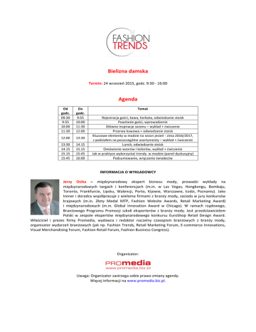 Bielizna damska Termin: 24 wrzesień 2015, godz. 9:30 -‐ 16:00 Agenda Od godz. 09:30 9:55 10:00 11:30 Do godz. 9:55 10:00 11:30 12:00 12:00 13:30 13:30 14.15 15.15 15:45 14.15 15.15 15:45 16:00 Temat Rejestracja gości, kawa, herbata, odwiedzanie stoisk Powitanie gości, wprowadzenie Główne inspiracje sezonu – wykład + ćwiczenie Przerwa kawowa + odwiedzanie stoisk Kluczowe elementy w modzie na sezon jesień -‐ zima 2016/2017, z podziałem na poszczególne asortymenty – wykład + ćwiczenie Lunch, odwiedzanie stoisk Omówienie wzorów i kolorów, wykład + ćwiczenie Jak w praktyce wykorzystać trendy w modzie (panel dyskusyjny) Podsumowanie, wręczenie świadectw INFORMACJA O WYKŁADOWCY Jerzy Osika – międzynarodowy ekspert biznesu mody, prowadzi wykłady na międzynarodowych targach i konferencjach (m.in. w Las Vegas, Hongkongu, Bombaju, Toronto, Frankfurcie, Lipsku, Walencji, Porto, Kijowie, Warszawie, Łodzi, Poznaniu). Jako trener i doradca współpracuje z wieloma firmami z branży mody, zasiada w jury konkursów krajowych (m.in. Złoty Medal MTP, Fashion Website Awards, Retail Marketing Award) i międzynarodowych (m.in. Global Innovation Award w Chicago). W ramach rządowego, Branżowego Programu Promocji szkoli eksporterów z branży mody. Jest przedstawicielem Polski w zespole ekspertów międzynarodowego konkursu EuroShop Retail Design Award. Właściciel i prezes firmy Promedia, wydawca i redaktor naczelny czasopism branżowych z branży mody, organizator wydarzeń branżowych (jak np. Fashion Trends, Retail Marketing Forum, E-‐commerce Innovations, Visual Merchandising Forum, Fashion Retail Forum, Fashion Business Congress). Organizator: Uwaga: Organizator zastrzega sobie prawo zmiany agendy. Więcej informacji na www.promedia.biz.pl.