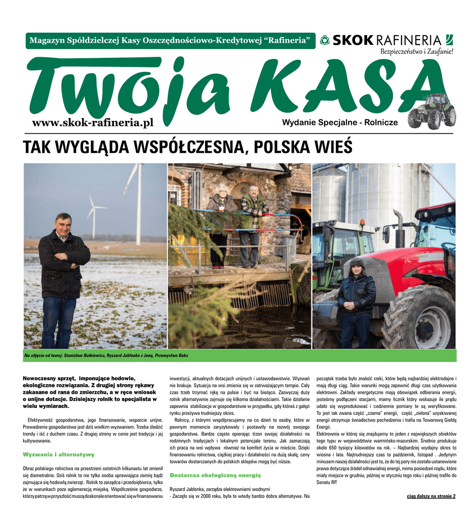 Tak wygląda współczesna, Polska wieś Na zdjęciu od lewej: Stanisław Butkiewicz, Ryszard Jabłonka z żoną, Przemysław Buks Nowoczesny sprzęt, imponujące hodowle, ekologiczne rozwiązania. Z drugiej strony rękawy zakasane od rana do zmierzchu, a w ręce wniosek o unijne dotacje. Dzisiejszy rolnik to specjalista w wielu wymiarach. Efektywność gospodarstwa, jego finansowanie, wsparcie unijne. Prowadzenie gospodarstwa jest dziś wielkim wyzwaniem. Trzeba śledzić trendy i iść z duchem czasu. Z drugiej strony w cenie jest tradycja i jej kultywowanie. Wyzwania i alternatywy Obraz polskiego rolnictwa na przestrzeni ostatnich kilkunastu lat zmienił się diametralnie. Dziś rolnik to nie tylko osoba uprawiająca ziemię bądź zajmująca się hodowlą zwierząt. Rolnik to zarządca i przedsiębiorca, tylko że w warunkach poza aglomeracją miejską. Współcześnie gospodarze, którzy patrzą w przyszłość muszą doskonale orientować się w finansowaniu inwestycji, aktualnych dotacjach unijnych i ustawodawstwie. Wyzwań nie brakuje. Sytuacja na wsi zmienia się w zatrważającym tempie. Cały czas trzeb trzymać rękę na pulsie i być na bieżąco. Zazwyczaj duży rolnik alternatywnie zajmuje się kilkoma działalnościami. Takie działanie zapewnia stabilizacje w gospodarstwie w przypadku, gdy któraś z gałęzi rynku przeżywa trudniejszy okres. Rolnicy, z którymi współpracujemy na co dzień to osoby, które w pewnym momencie zaryzykowały i postawiły na rozwój swojego gospodarstwa. Bardzo często opierając trzon swojej działalności na rodzinnych tradycjach i lokalnym potencjale terenu. Jak zaznaczają ich praca na wsi wpływa również na komfort życia w mieście. Dzięki finansowaniu rolnictwa, ciężkiej pracy i działalności na dużą skalę, ceny towarów dostarczanych do polskich sklepów mogą być niższe. Dostarcza ekologiczną energię Ryszard Jabłonka, zarządza elektrowniami wodnymi - Zaczęło się w 2000 roku, była to wtedy bardzo dobra alternatywa. Na początek trzeba było znaleźć rzeki, które będą najbardziej elektrodajne i mają długi ciąg. Takie warunki mogą zapewnić długi czas użytkowania elektrowni. Zakłady energetyczne mają obowiązek odbierania energii, jesteśmy podłączeni stacjami, mamy licznik który wskazuje ile prądu udało się wyprodukować i codziennie pomiary te są weryfikowane. To jest tak zwana część „czarna” energii, część „zielona” uzyskiwanej energii otrzymuje świadectwo pochodzenia i trafia na Towarową Giełdę Energii. Elektrownia w której się znajdujemy to jeden z największych obiektów tego typu w województwie warmińsko-mazurskim. Średnio produkuje około 650 tysięcy kilowatów na rok. – Najbardziej wydajny okres to wiosna i lata. Najtrudniejszy czas to październik, listopad . Jedynym minusem naszej działalności jest to, że do tej pory nie zostało ustanowione prawo dotyczące źródeł odnawialnej energii, mimo posiedzeń rządu, które miały miejsce w grudniu, później w styczniu tego roku i później trafiło do Senatu RP. ciąg dalszy na stronie 2 2 Twoja kasa www.skok-rafineria.pl 0 801 50 80 85 Tak wygląda Współczesna, Polska wieś – Profil naszego gospodarstwa został ukształtowany już lata temu, ale dzięki umiejętnemu wykorzystaniu dotacji unijnych z Programu Rozwoju Obszarów Wiejskich udało nam się znacznie zwiększyć zasięg działalności. Specjalizujemy się głównie w hodowli mlecznej, obecnie posiadamy sto sześćdziesiąt krów. Druga gałąź naszej gospodarki to uprawa ziemi, na chwilę obecną możemy poszczycić się najnowocześniejszym sprzętem rolniczym, co bardzo ułatwia pracę na tak dużą skalę- mówi Przemysław Buks. Podobnie jak większość dużych gospodarzy, rodzina Buks również posiada alternatywną działalność. W tym wypadku jest to Dom Weselny w Wardomach, który powstał również przy pomocy środków unijnych. Przy planowaniu kolejnych inwestycji rolnicy korzystają z oferty SKOK „Rafineria”. Siła wiatru Na koniec odwiedzamy kolejnego rolnika, który związany jest z wytwarzaniem czystej energii. Ta powstająca dzięki wiatrakom zależy oczywiście głównie od siły wiatru. Wiatraki nie potrzebują paliwa, które by je napędzało i wpływają na zmniejszenie emisji dwutlenku węgla do atmosfery. Stanisław Butkiewicz z Kraskowa tereny pod farę wiatraków dzierżawi od 2008 roku. -Wszystko to dzieło przypadku. Któregoś dnia trafiła na mnie firma zajmująca się poszukiwaniem terenów pod budowę farm wiatrowych. Udało się porozumieć, a dziś z bratem dzierżawimy grunty pod siedemnaście wiatraków. Inwestor wykorzystał potencjał terenu i udało się podpisać umowę na trzydzieści lat. Pamiętam na Ryszard Jabłonka w swojej elektrowni wodnej Jak większość rolników, pan Ryszard zajmuje się również drugą dziedziną, w jego przypadku jest to uprawa.- Prowadzimy gospodarstwo rolne, są to trwałe użytki zielone na terenie około 80 hektarów, pobierają dotację na ten cel. W dzisiejszych czasach bywa trudno z połączeniem dwóch działalności i braku funduszy, które były założone na kolejne lata bardzo chętnie wspieramy się współpracą ze SKOK „Rafineria”. Bardzo się cieszę, że są instytucje, które są otwarte na rolników i są dla nas partnerem w inwestycjach i bieżącej działalności. Postawili na hodowlę krów W dalszym ciągu jedną z największych gałęzi produkcji rolniczej w Polsce jest pozyskiwanie mleka. Dlatego kolejne gospodarstwo, które odwiedzamy specjalizuje się właśnie w produkcji mleka. Przenosimy się do gospodarstwa, które znajduje się w Kinkajmach koło Bartoszyc. Początek rodzinnej historii dał Zenon Buks, a dziś gospodarstwo prowadzone jest przez Przemysława i Aleksandra Buks. Przemysław Buks stale inwestuje w rozwój gospodarstwa Wydawca: Spółdzielcza Kasa Oszczędnościowo-Kredytowa „Rafineria”, ul. Raciborskiego 1c, 80-215 Gda
