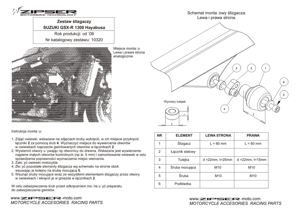 Schemat montażowy ślizgacza. Lewa i prawa strona. Zestaw ślizgaczy SUZUKI GSX-R 1300 Hayabusa Rok produkcji: od ‘08 Nr katalogowy zestawu: 10320 Miejsce montażu Lewa i prawa strona analogicznie. 3 2 1 6 5 Wymiary tulejek: 4 t L d Instrukcja montażu: 1. Zdjąć owiewki, wskazane na zdjęciach śruby wykręcić, w ich miejsce przykręcić łączniki 2 za pomocą śrub 4. Wyznaczyć miejsca do wywiercenia otworów w owiewkach naprzeciw gwintowanych otworów w łącznikach 2. 2. Wywiercić otwory używając np otwornicy do drewna. Wskazane jest wywiercenie najpierw małych otworów kontrolnych (np śr. 5 mm) i zamontowanie owiewek w celu sprawdzenia poprawności wyznaczenia miejsc wiercenia. 3. Założyć owiewki motocykla. 4. Złożyć pozostałe elementy ślizgacza wg schematu na stronie obok wsuwając je kolejno na śrubę mocującą 5. 5. Wsunąć śruby mocujące wraz ze wszystkimi elementami ślizgaczy przez otwory w owiewkach i wkręcić je w gniazda w łącznikach 2. W celu zabezpieczenia śrub przed odkręceniem można użyć preparatu do zabezpieczania gwintów. NR ELEMENT LEWA STRONA PRAWA 1 Ślizgacz L = 60 mm L = 60 mm 2 Łącznik stalowy 3 Tulejka d =22mm, t=25mm d =22mm, t=15mm 4 Śruba mocująca M10 M10 5 Śruba M10 6 Podkładka M10